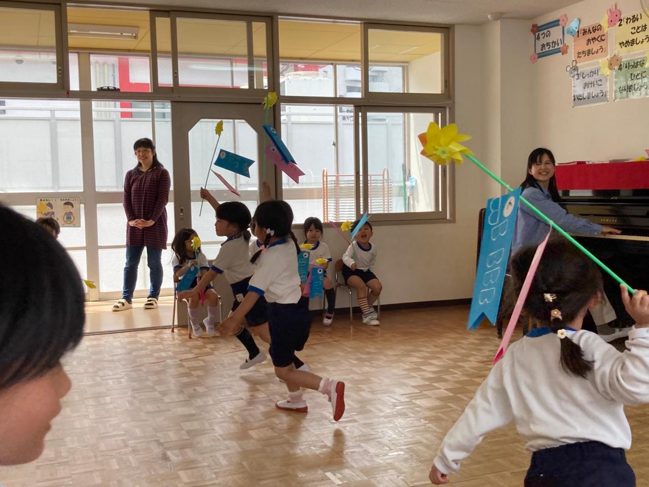 作ったこいのぼりをスイスイ泳がせて遊んだよ。風車もいっぱい回ったね!