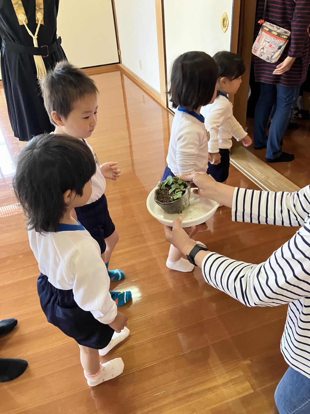 礼拝では、園長先生がいちごの苗🍓のお話をして下さいました。みんなで成長を楽しみに見守っていこうね!先週園長先生が見せて下さった蝶のさなぎは、無事蝶になり、飛び立ちましたましたよ!