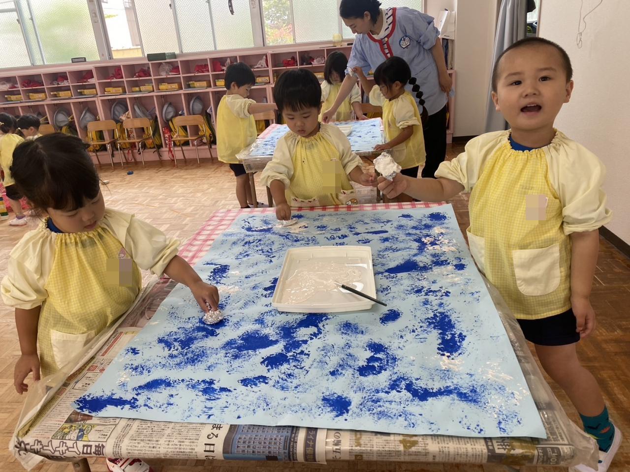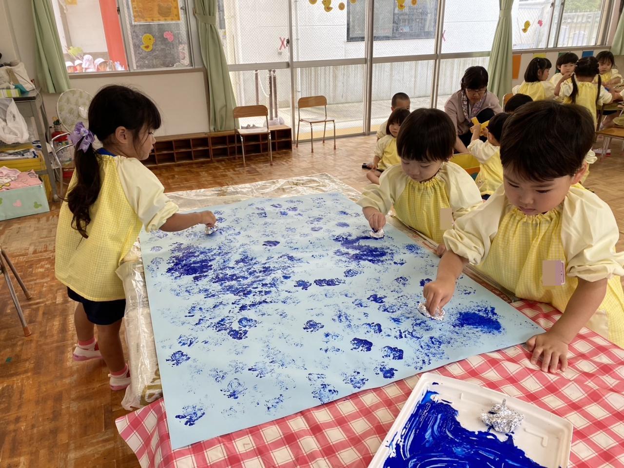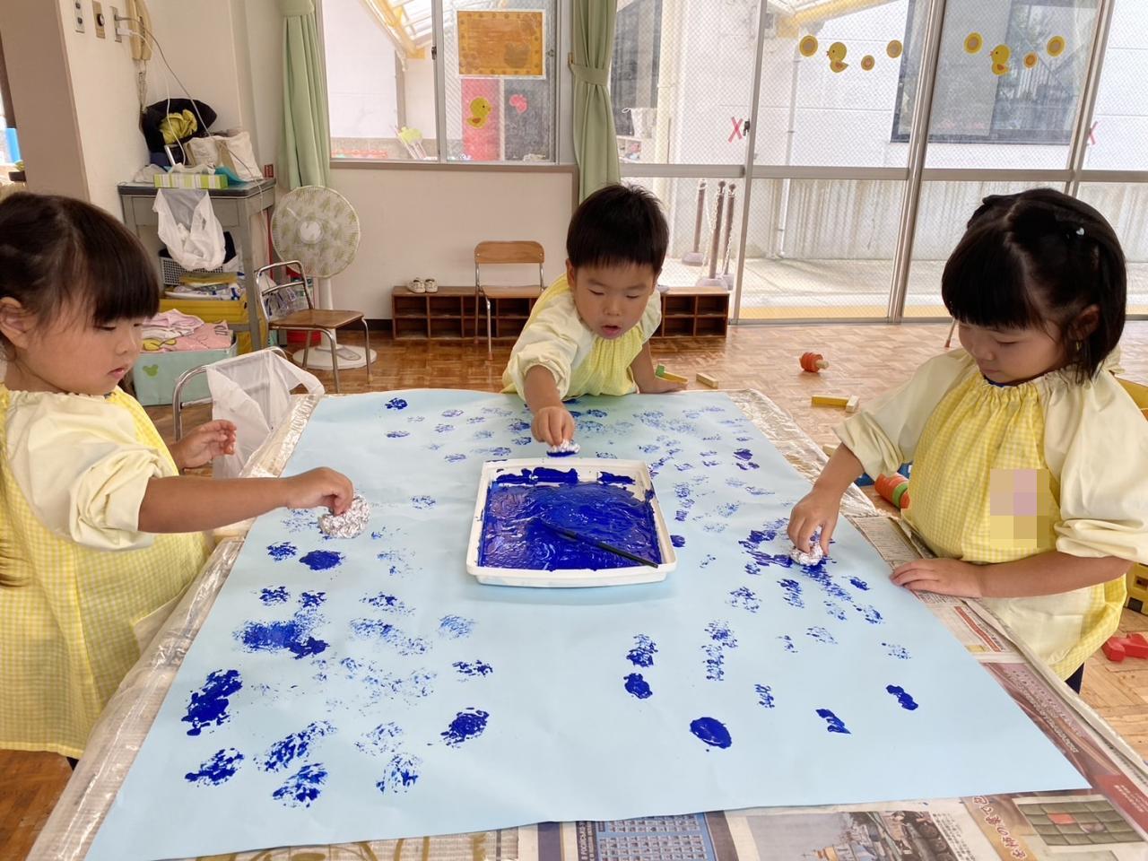 共同画製作で、スタンプをして大きな海を作っています!