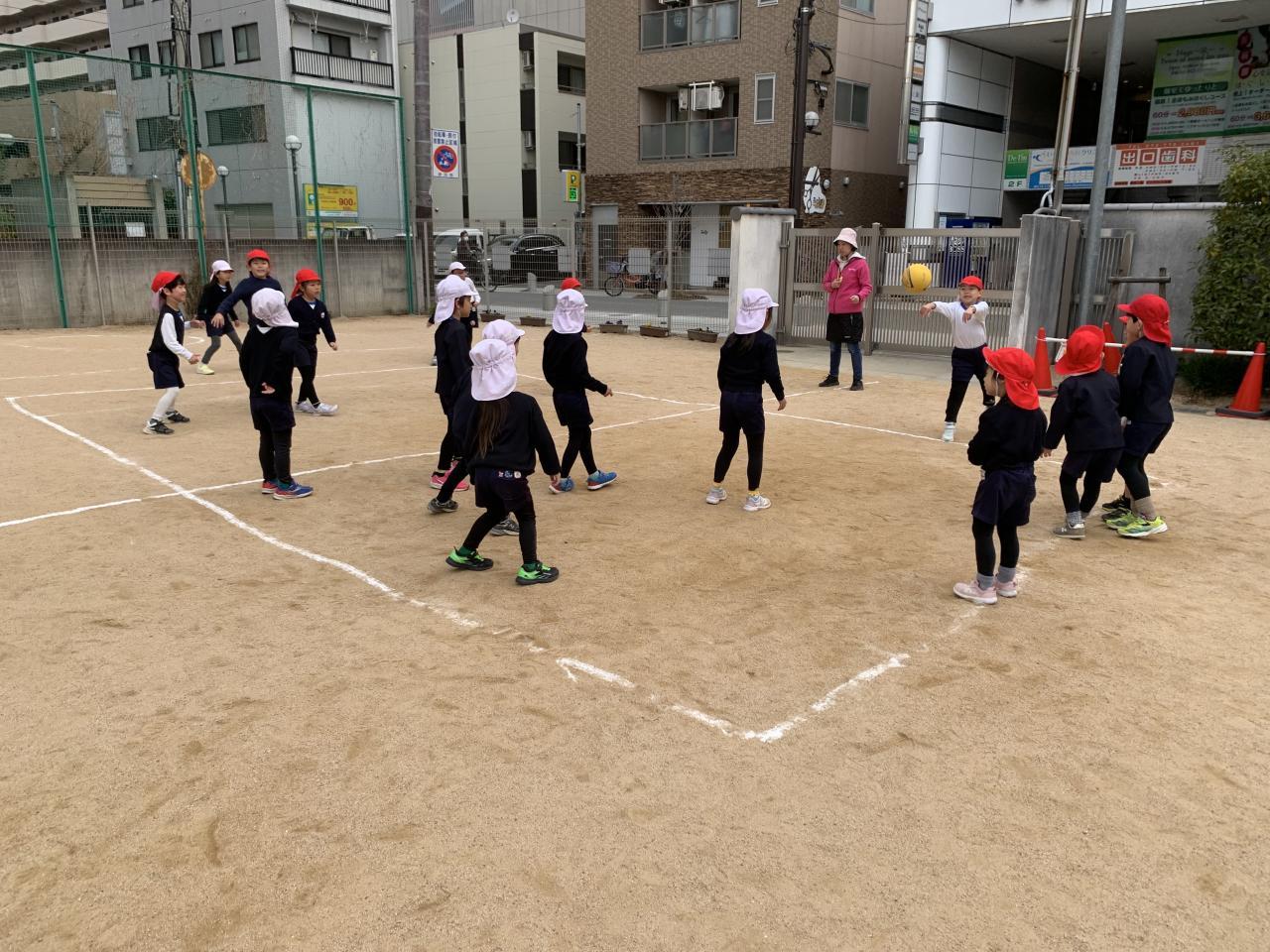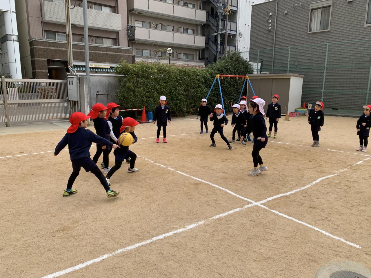 ドッジボールをしました!ボールを当てて「やったー!」と張り切ったり、負けて悔しかったり…と、いろいろな様子がみられました。これからもたくさん遊んでうまくなるぞ!