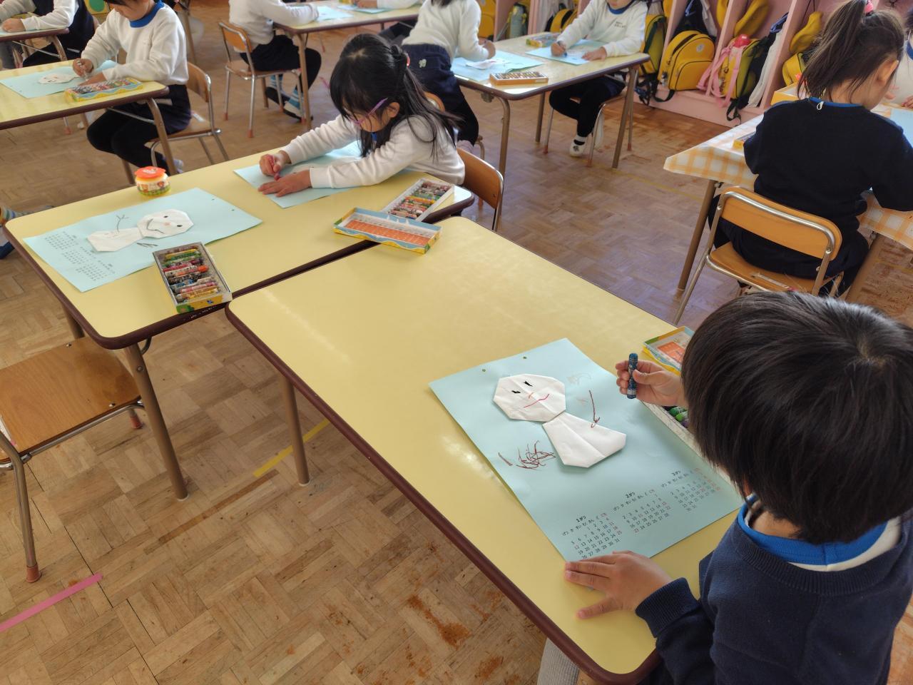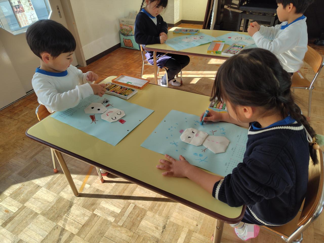 冬のカレンダー製作。折り紙で雪だるまを作って貼ったり、お絵描きをしました!