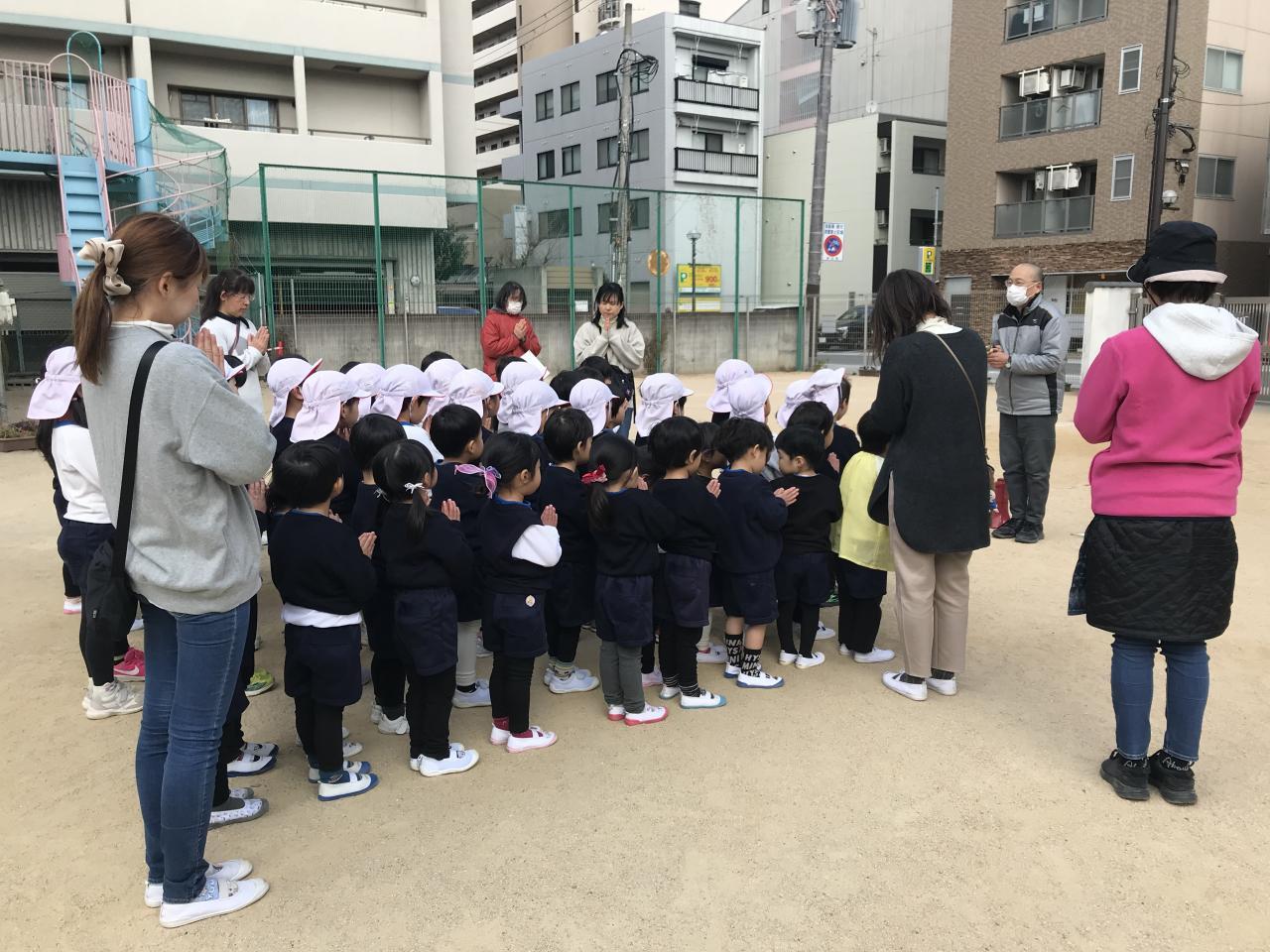 阪神淡路大震災から30年が経ちました。今日は、地震発生時を想定し、防災訓練を行いました。先生の話を聞きながら、皆上手に落ち着いて避難することができましたよ。また、ご家庭でもお話してみてくださいね。