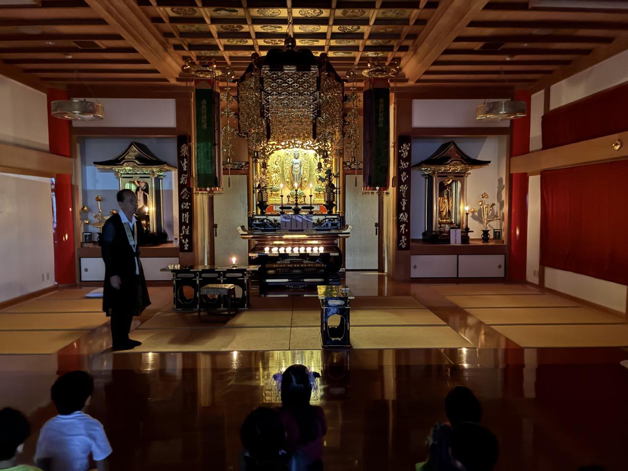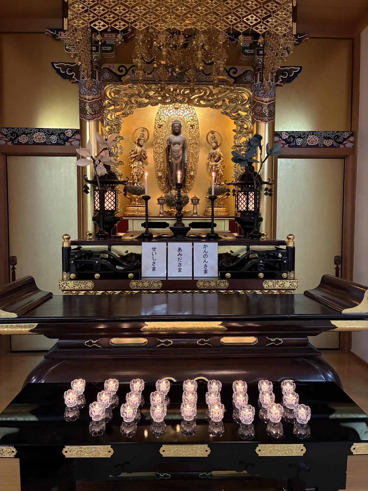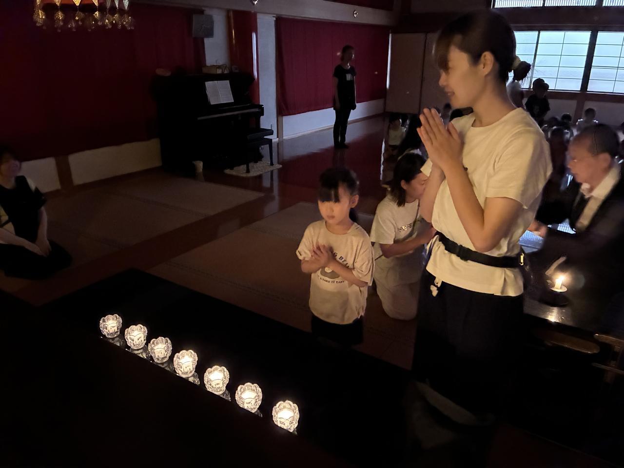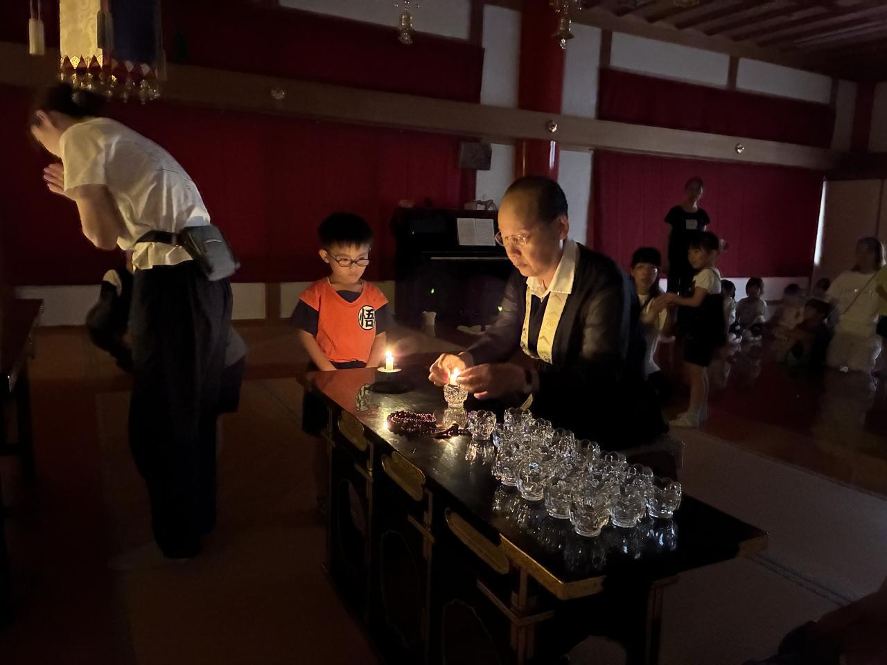 礼拝・灯の集い🎵 仏様の智慧の光、慈悲の光が一つずつ広がっていきます。最後に子ども達が一人ずつ園長先生からいただいた灯火をお供えしました。お供えしたろうそくの灯りが、仏様を温かく照らしていました。これからも、お釈迦様の教えを守っていきましょうね。