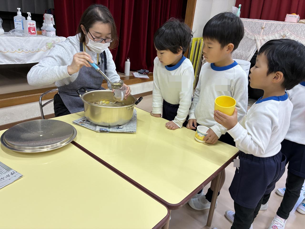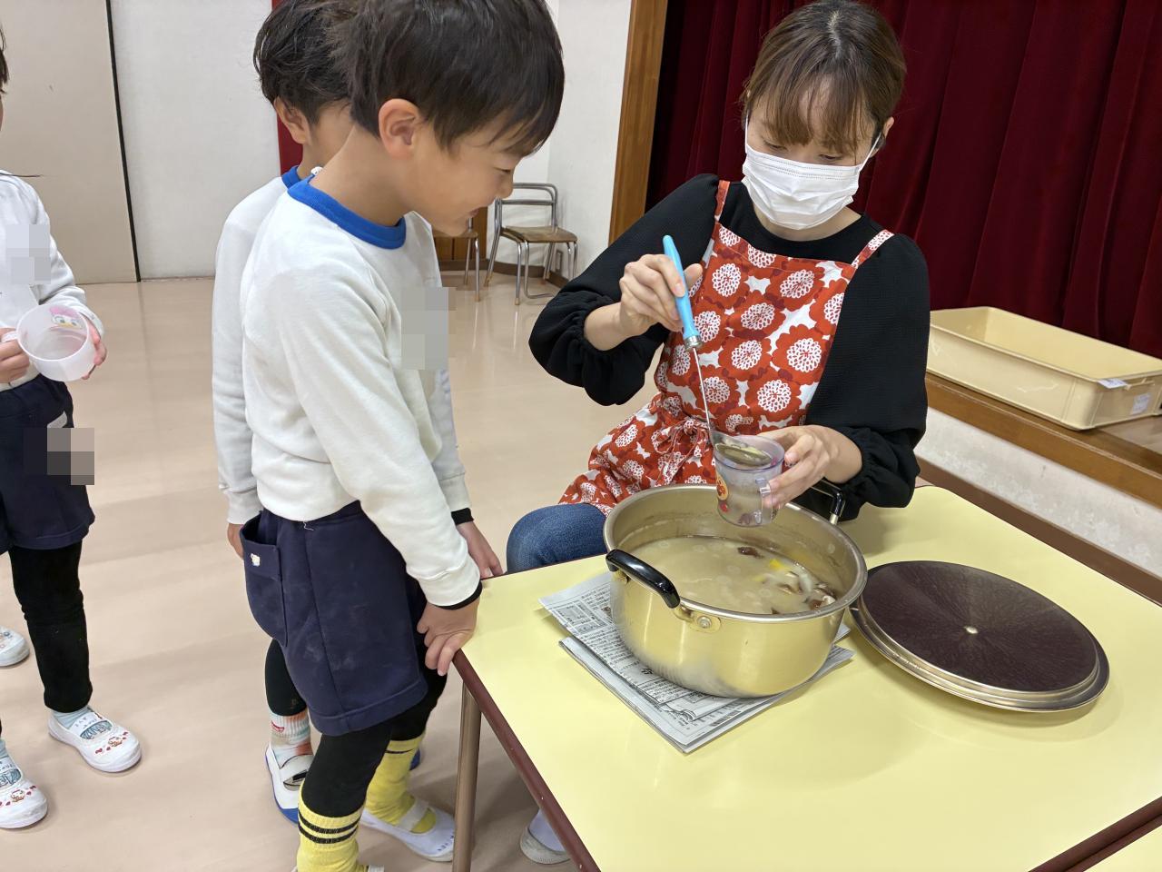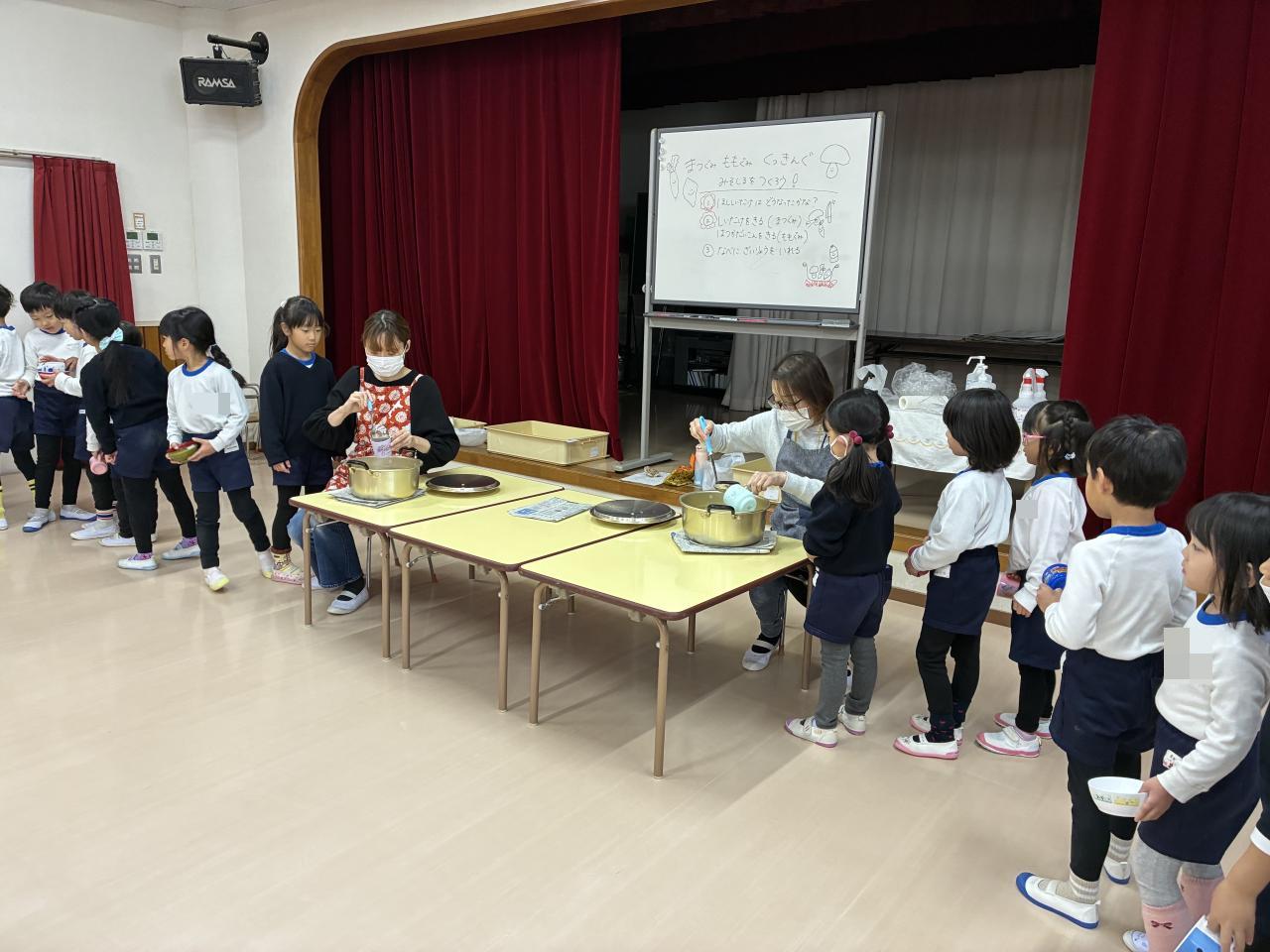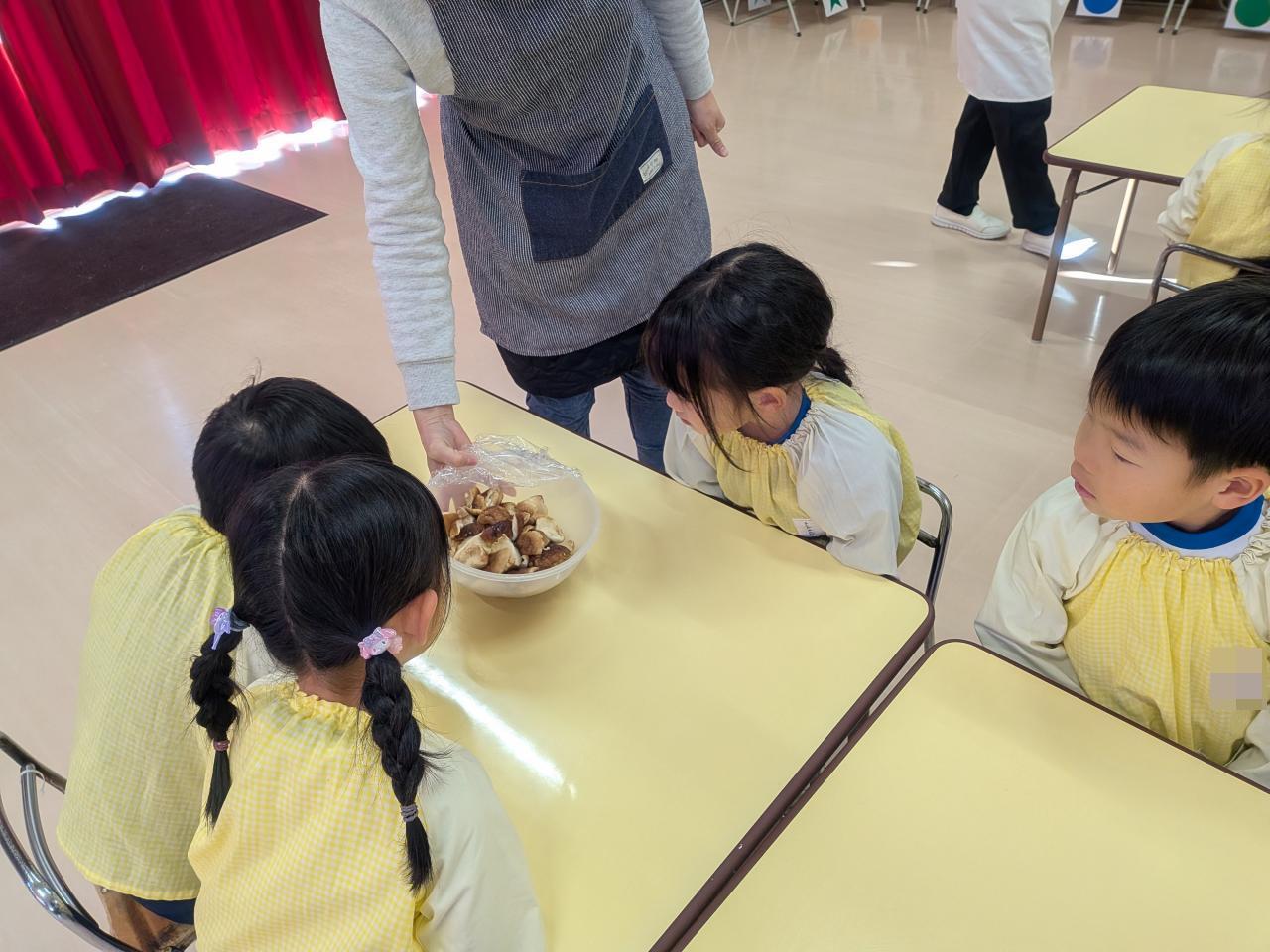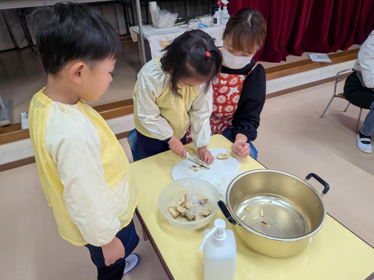 先日、年長・年中組さん一緒に「きのこ汁」を作りました!自分たちで育てた野菜を収穫したり材料を切ったりして頑張って作りました!野菜が苦手な子も「おいしい~!」「おかわり~!」と嬉しそうに食べていました😄とても良い経験になりましたね🎵