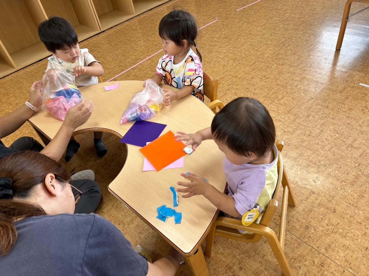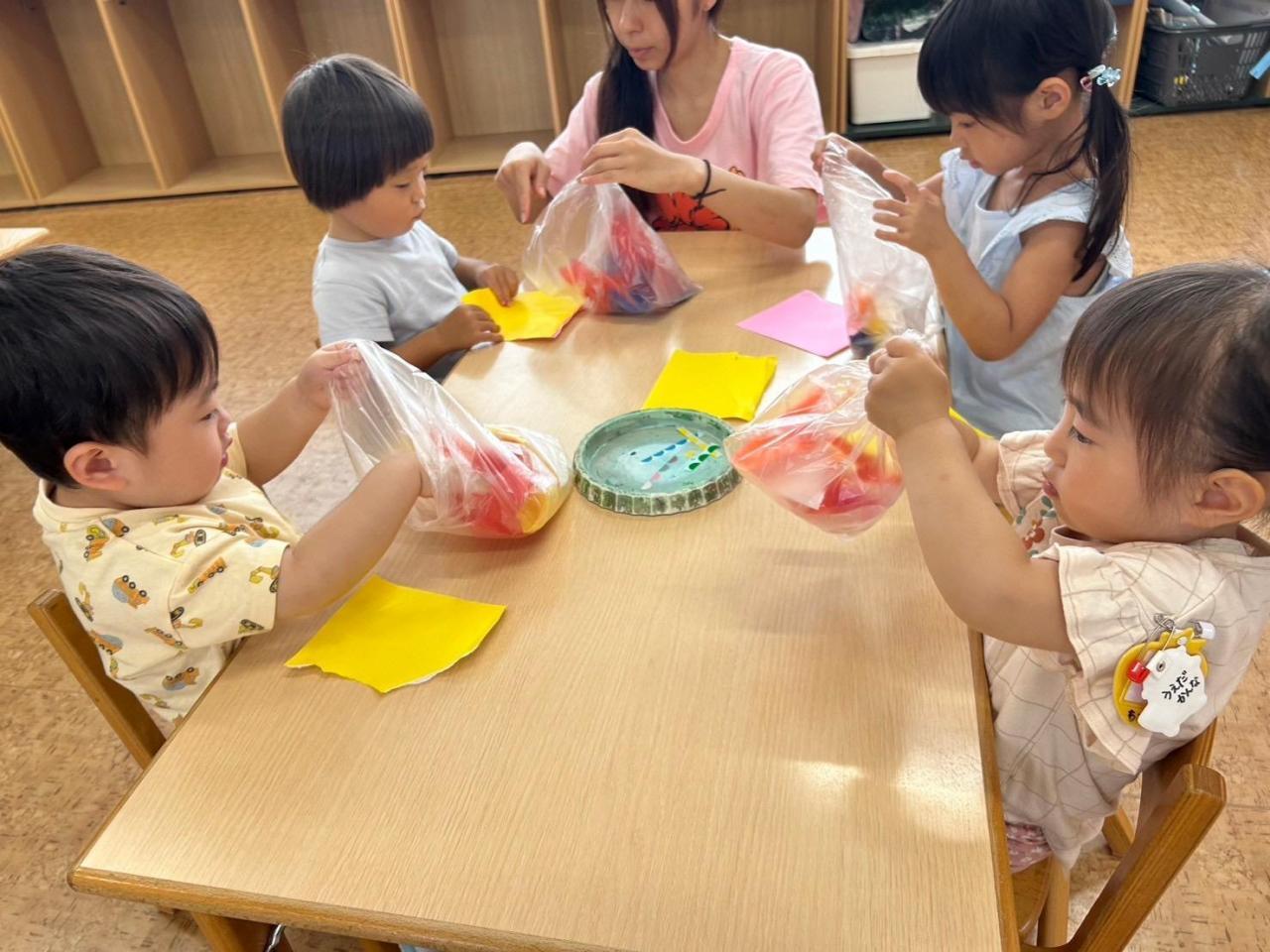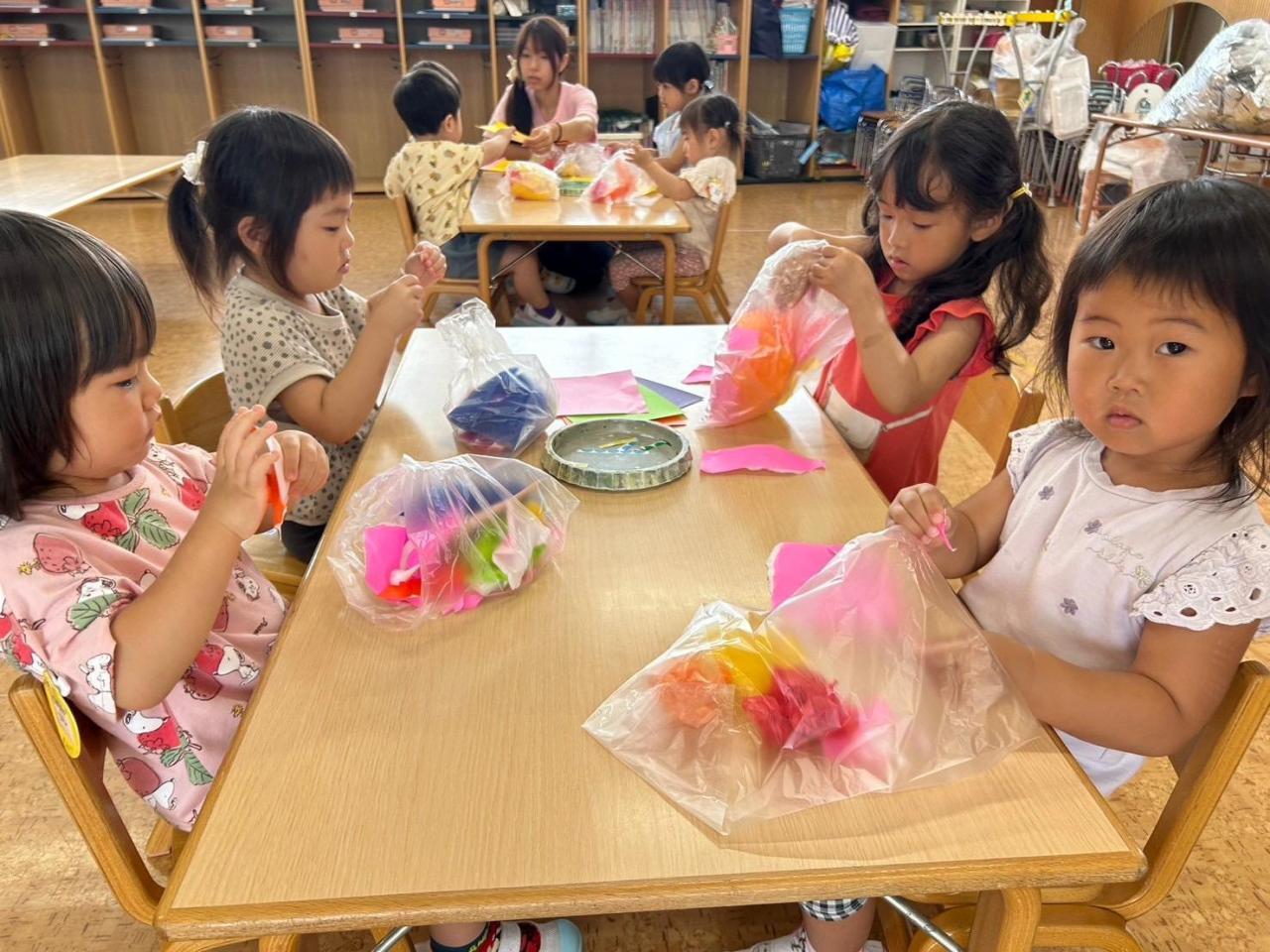 お花紙をくしゃっとしたものや、折り紙をビリビリ破ったものを袋に詰めて、カラフル金魚の出来上がり!