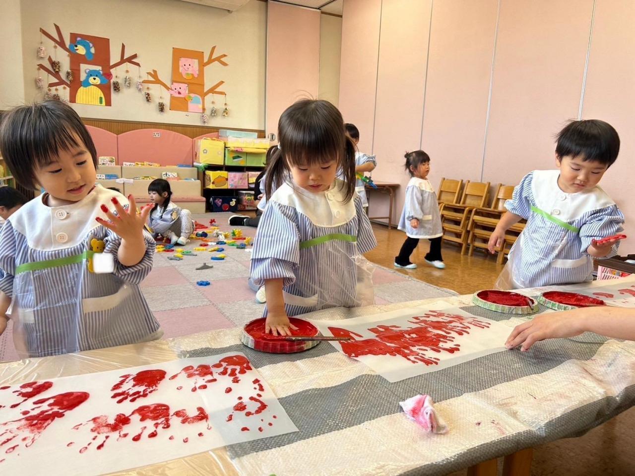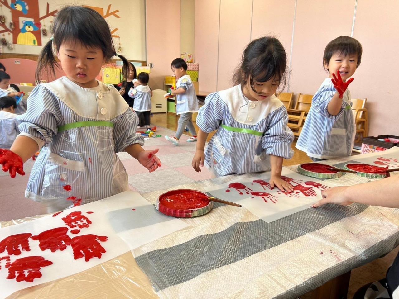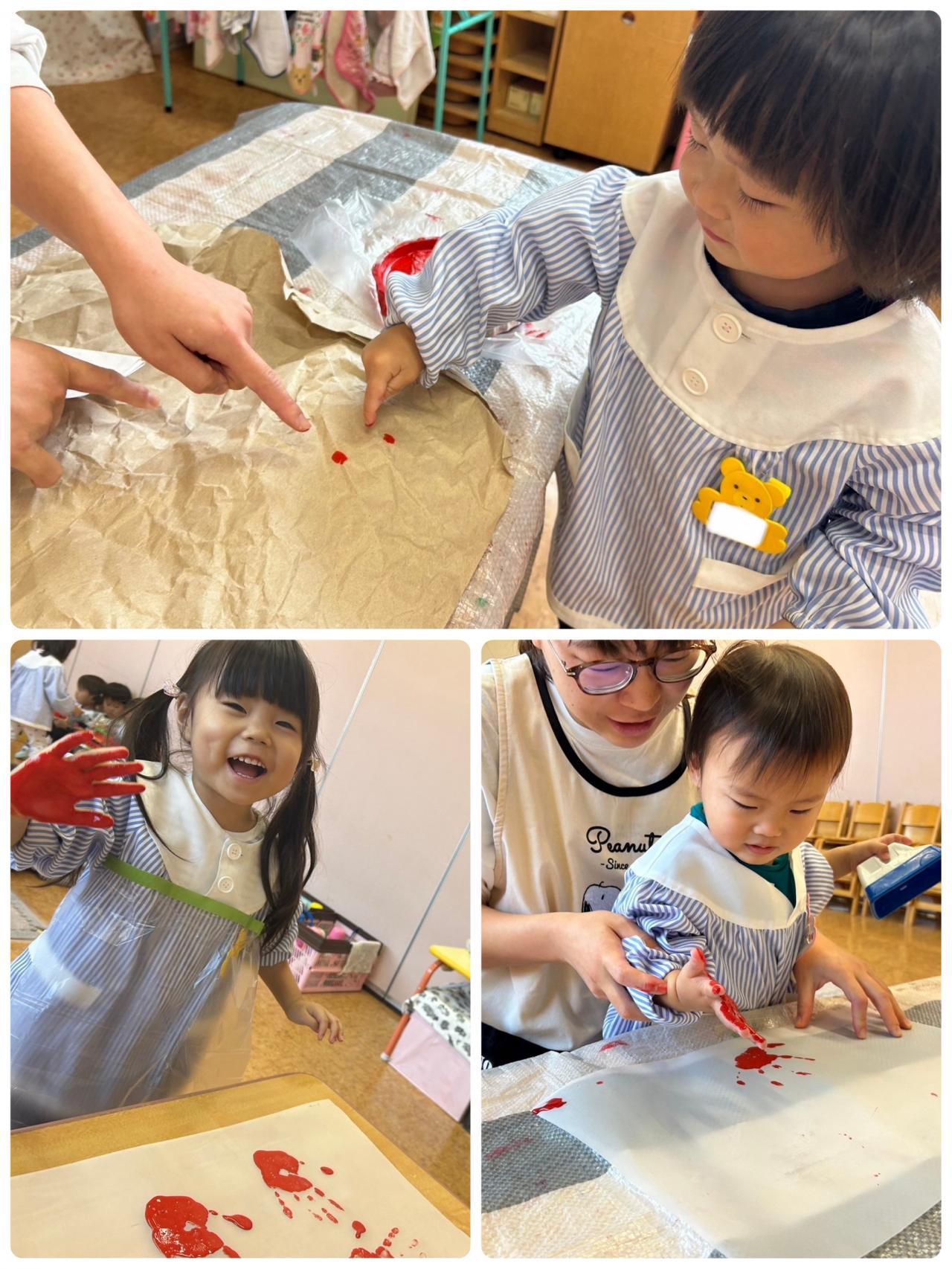 赤い絵の具を手のひらに塗って、手のひらスタンプを楽しみました(^^)