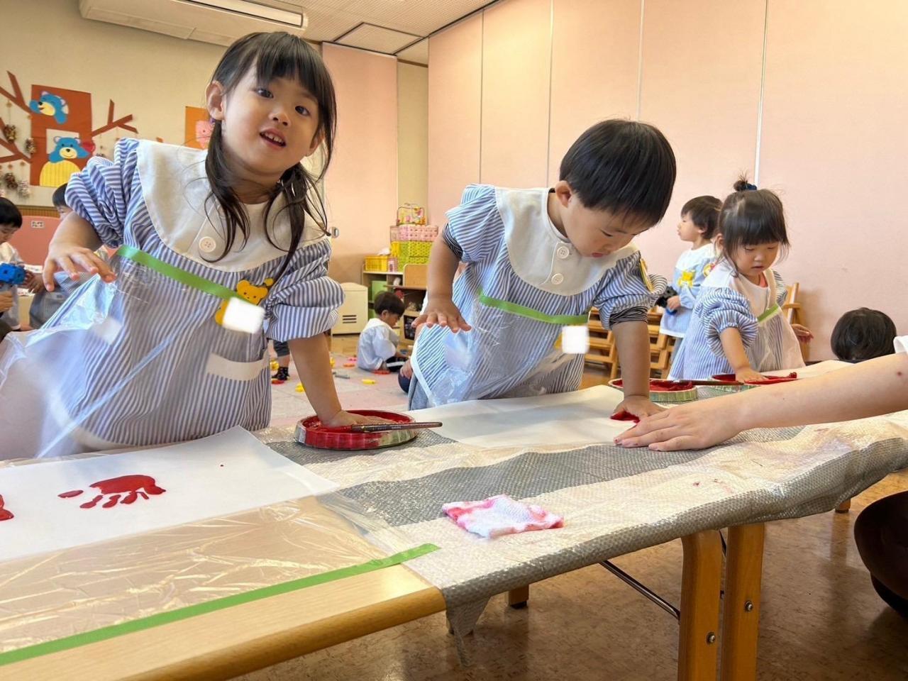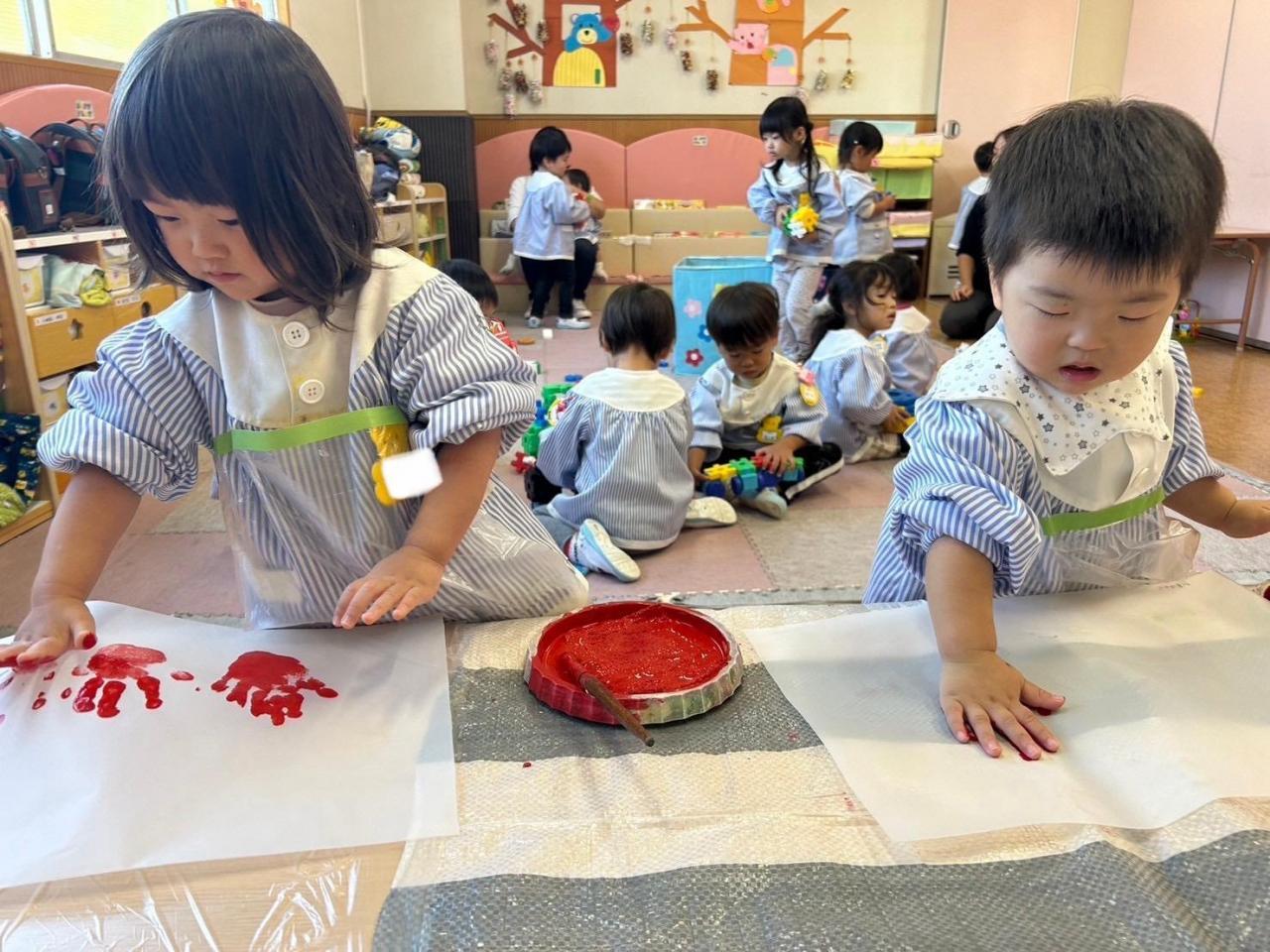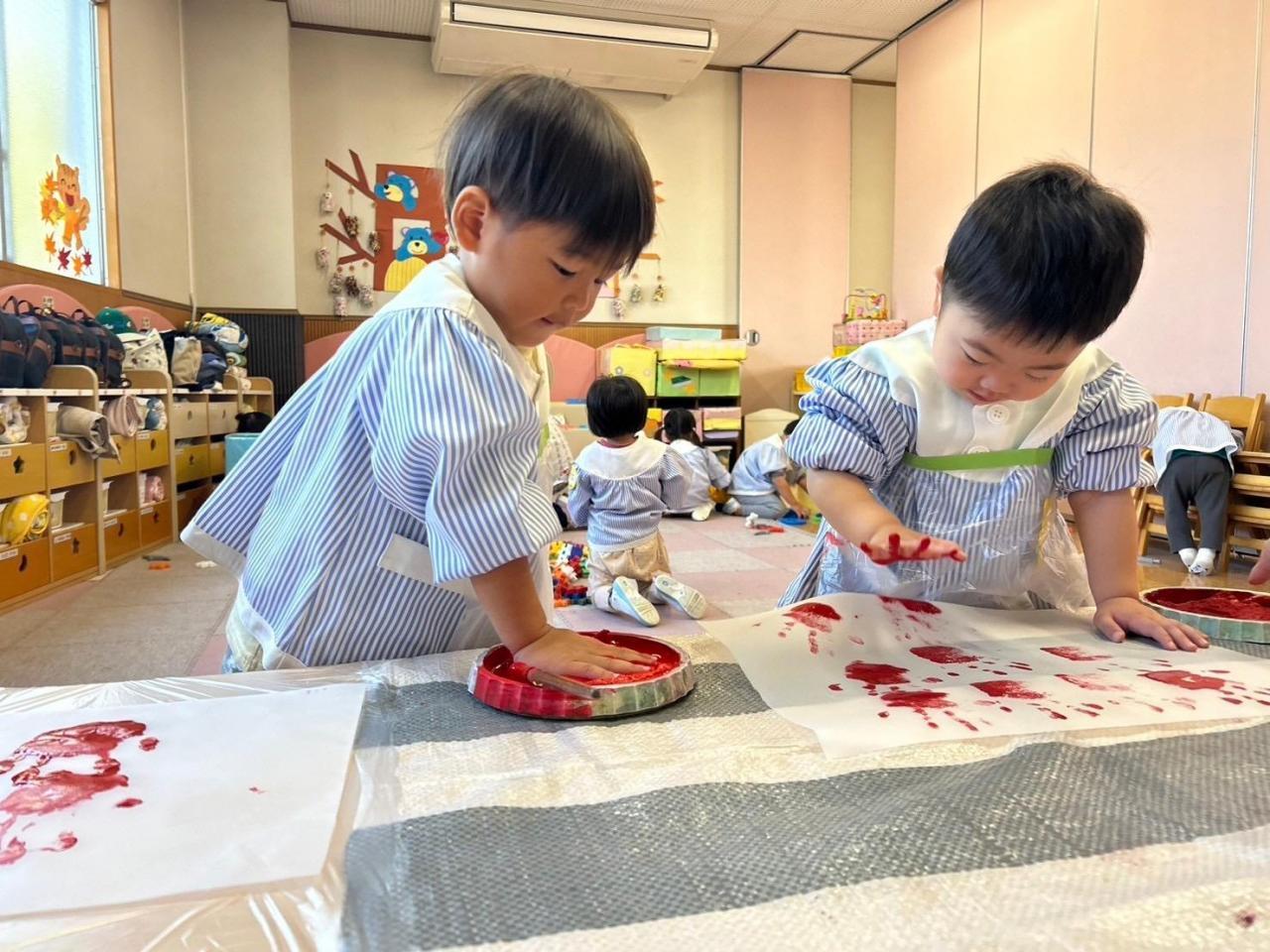 赤い絵の具を手のひらに塗って、手のひらスタンプを楽しみました(^^)