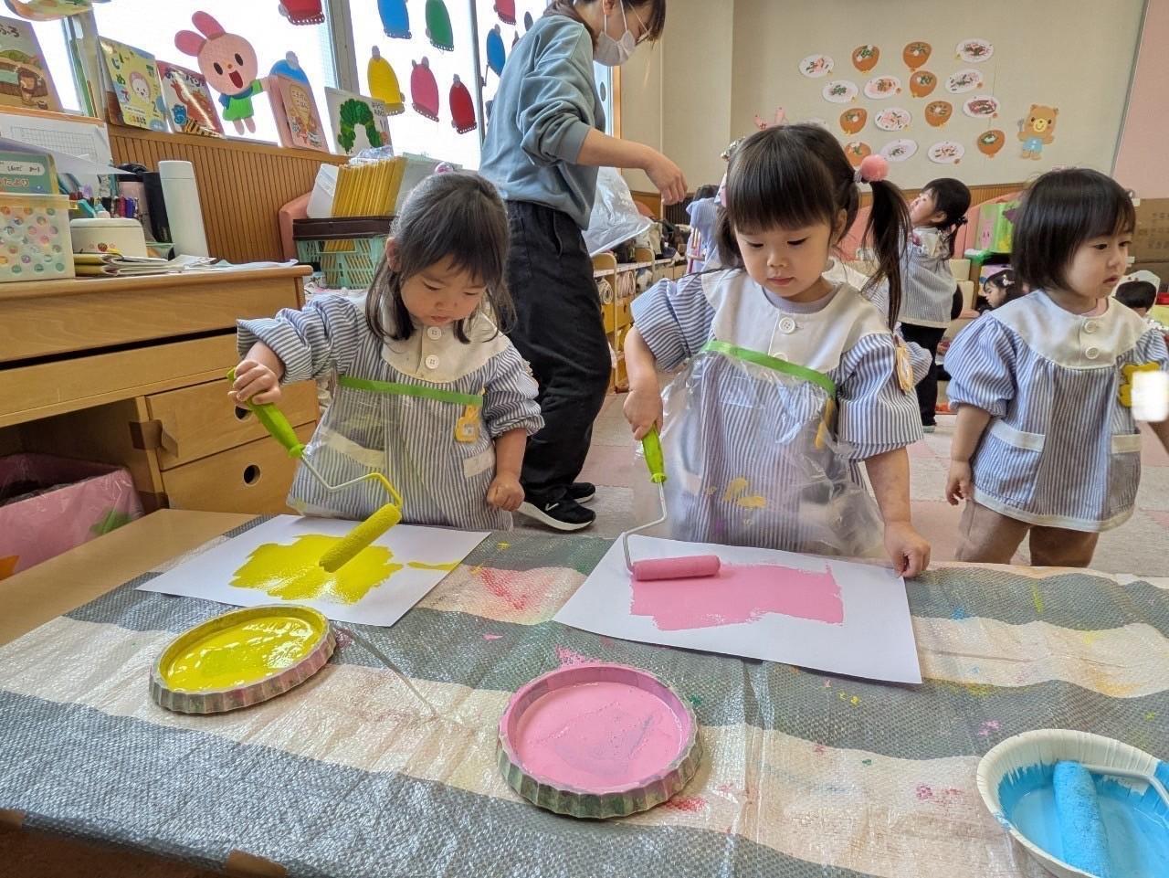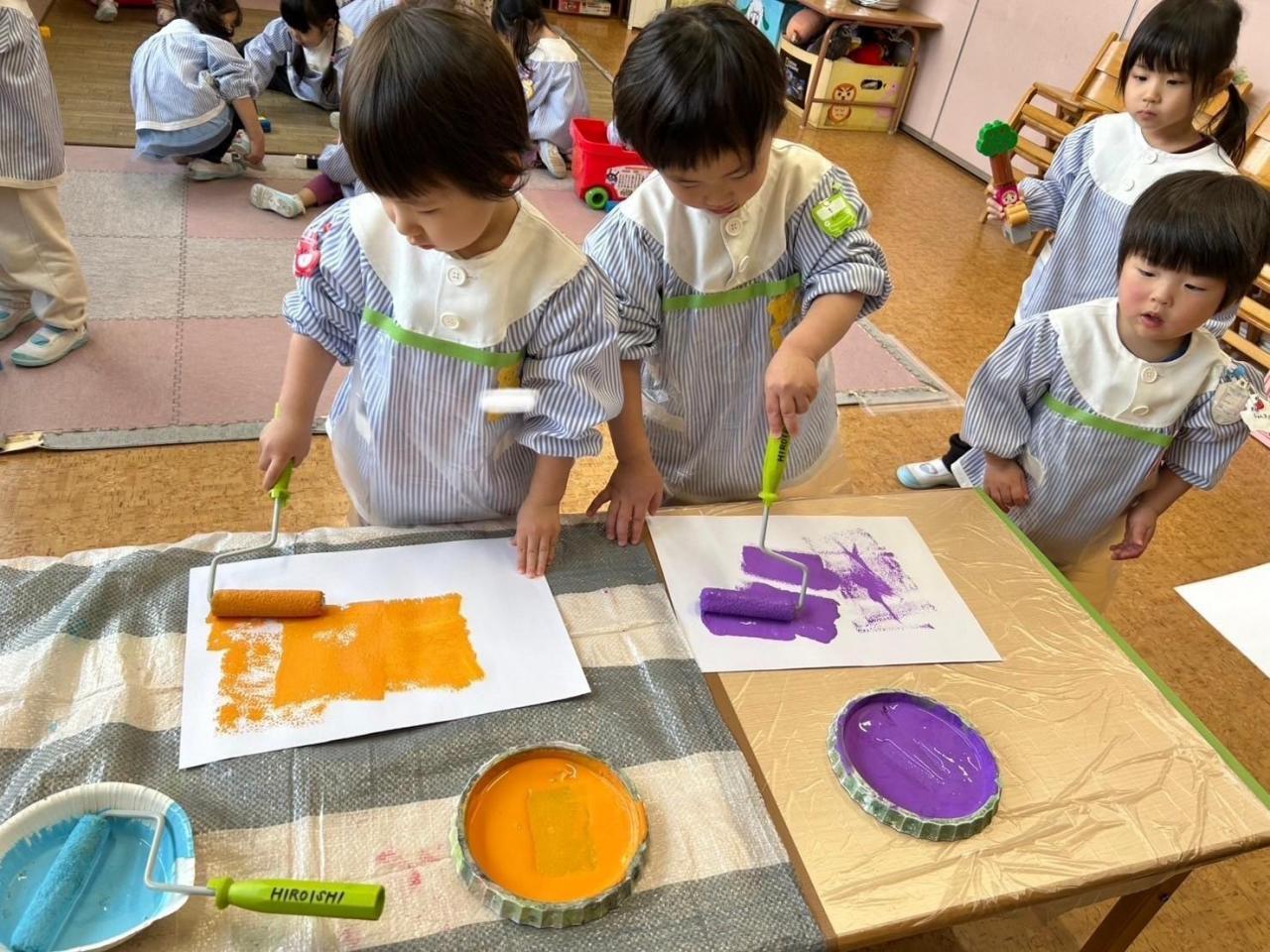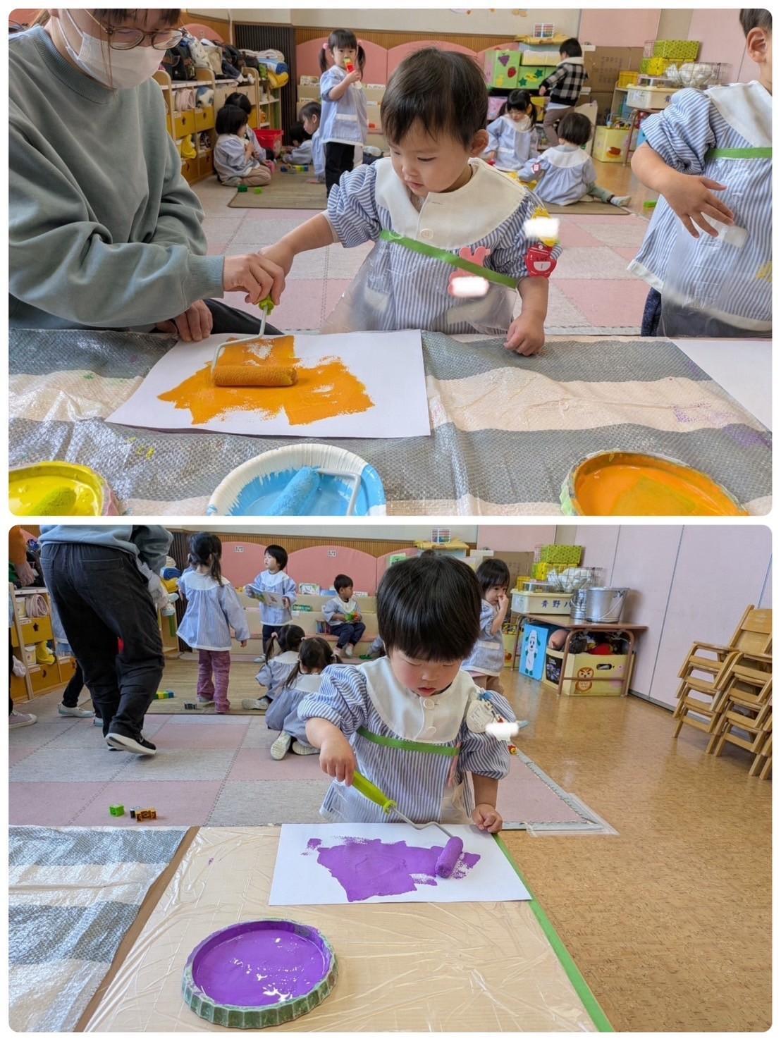 久しぶりの絵の具に子ども達も嬉しそうで、初めて見るローラーにも興味を持ってころころ〜っとして楽しみました🎵