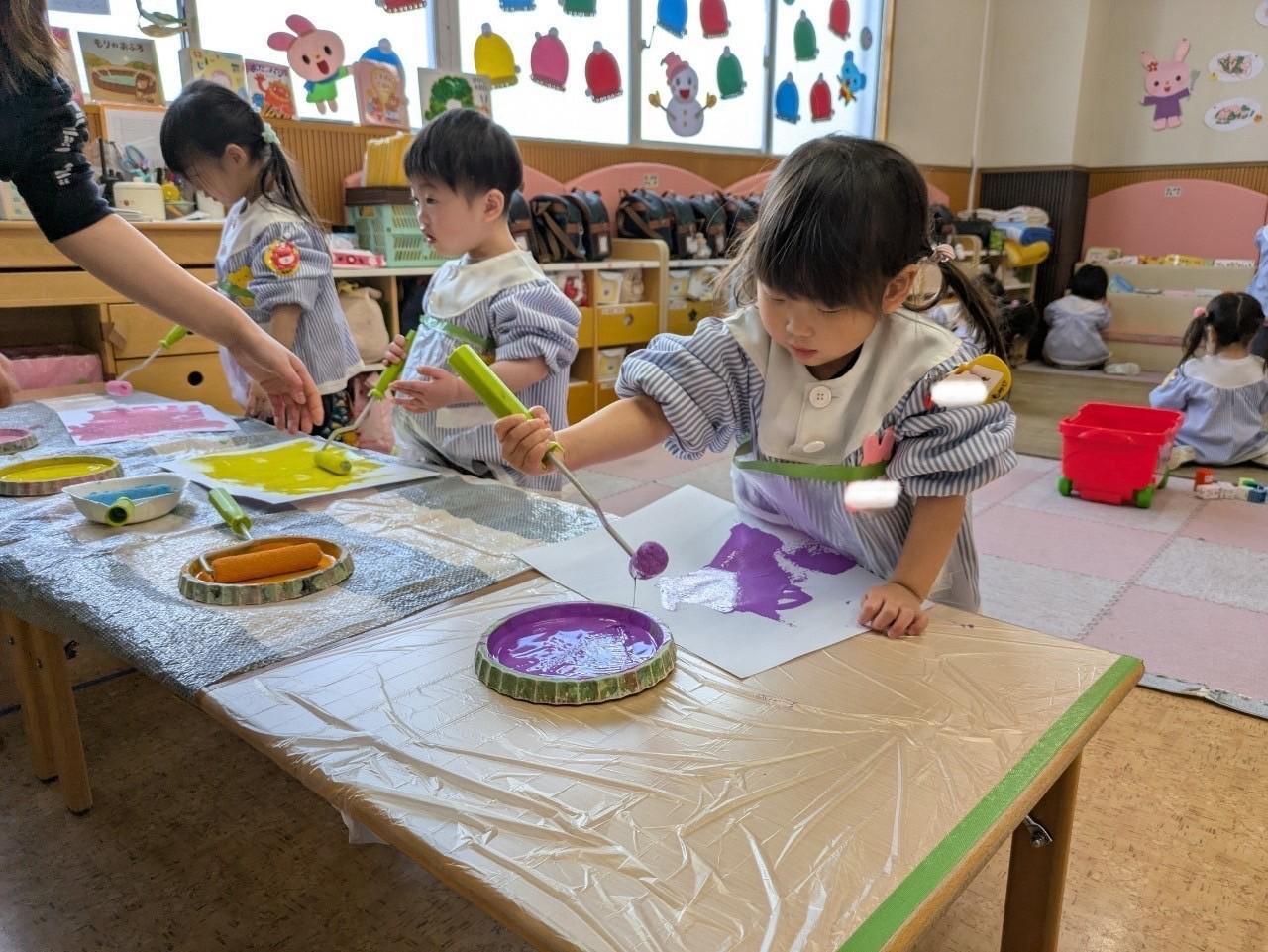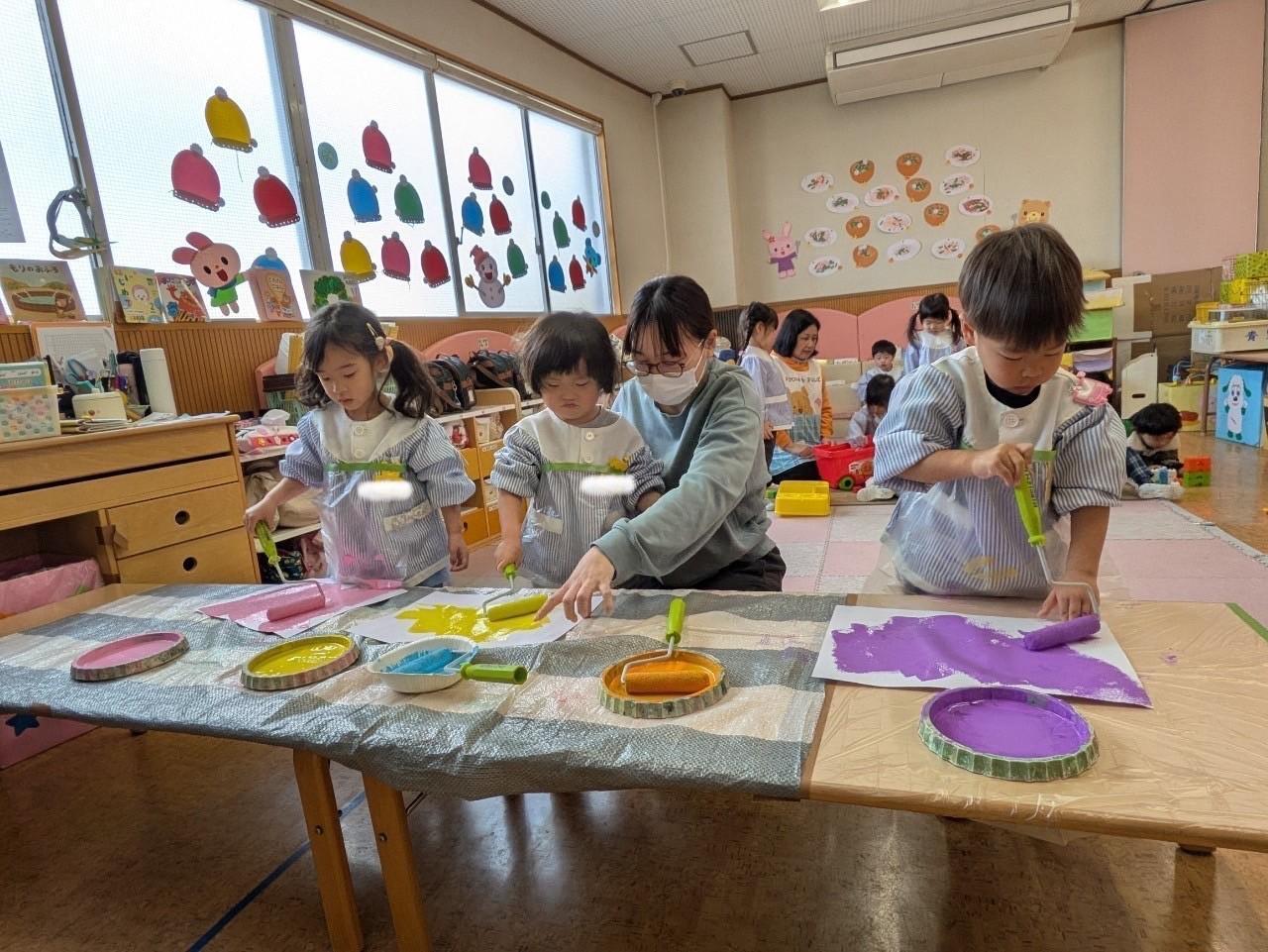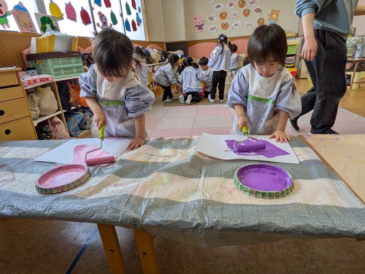 久しぶりの絵の具に子ども達も嬉しそうで、初めて見るローラーにも興味を持ってころころ〜っとして楽しみました🎵