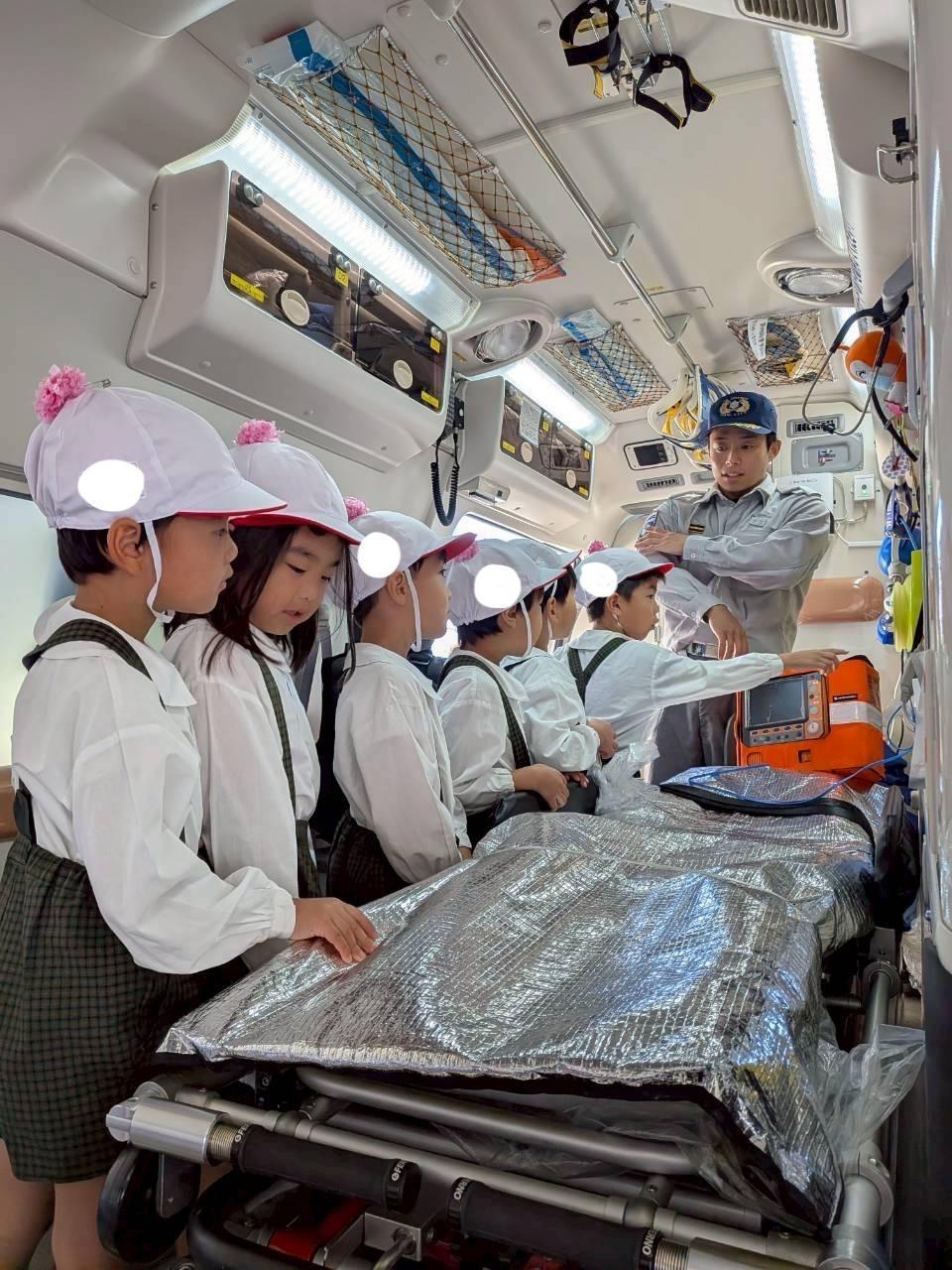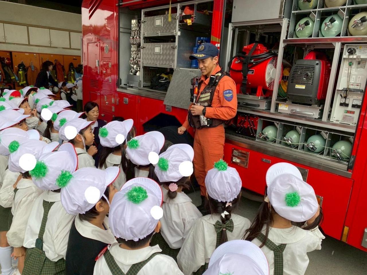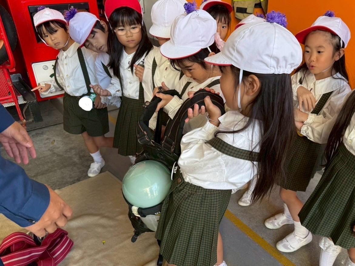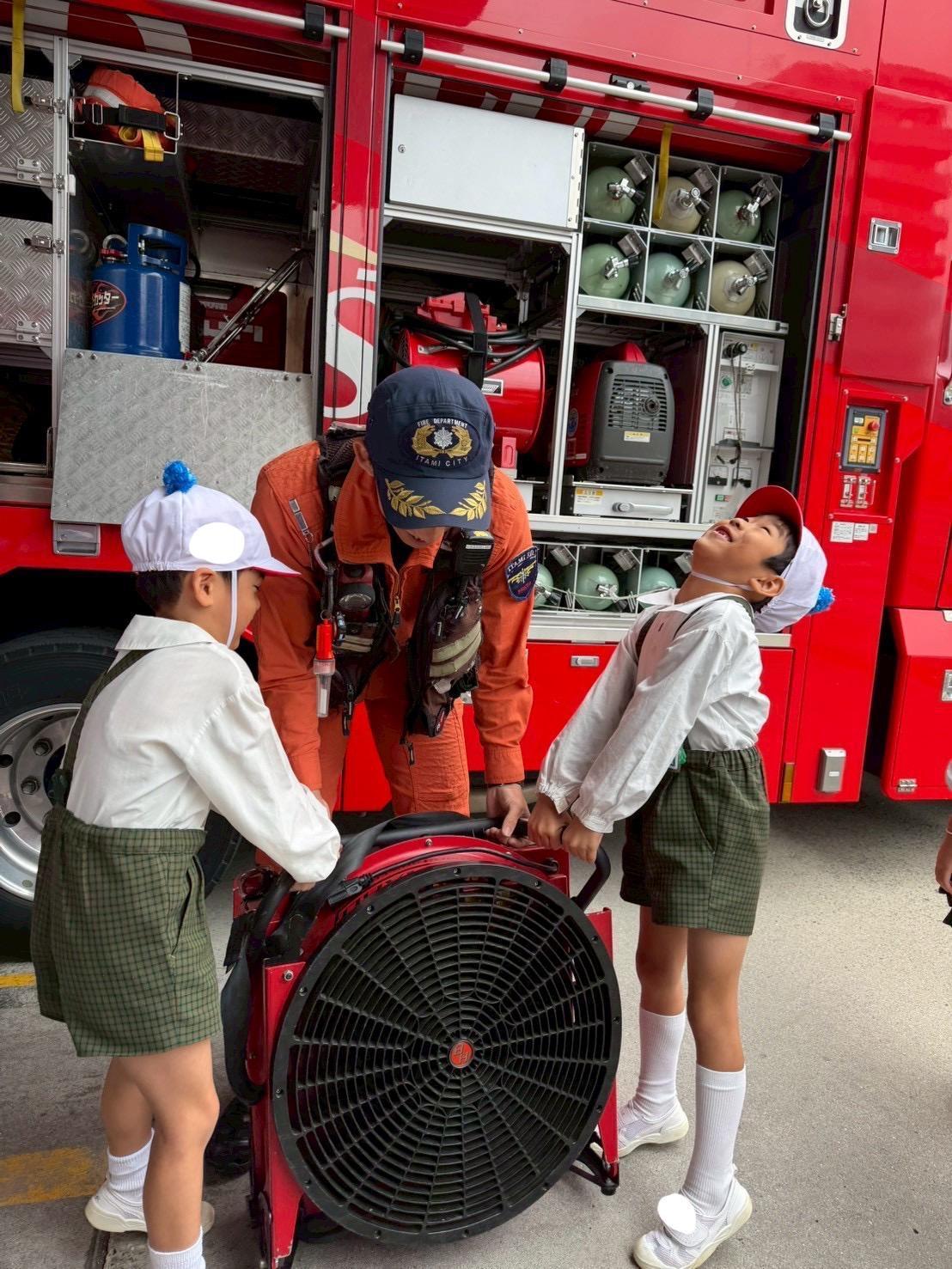 色々な種類の消防車や救急車について、一つひとつ分かりやすく教えていただき、「そうなんだ!すごい!」とたくさんの学びがありましたね✨実際にホースや色々な用具を持たせてもらって、重さにびっくりしたね!