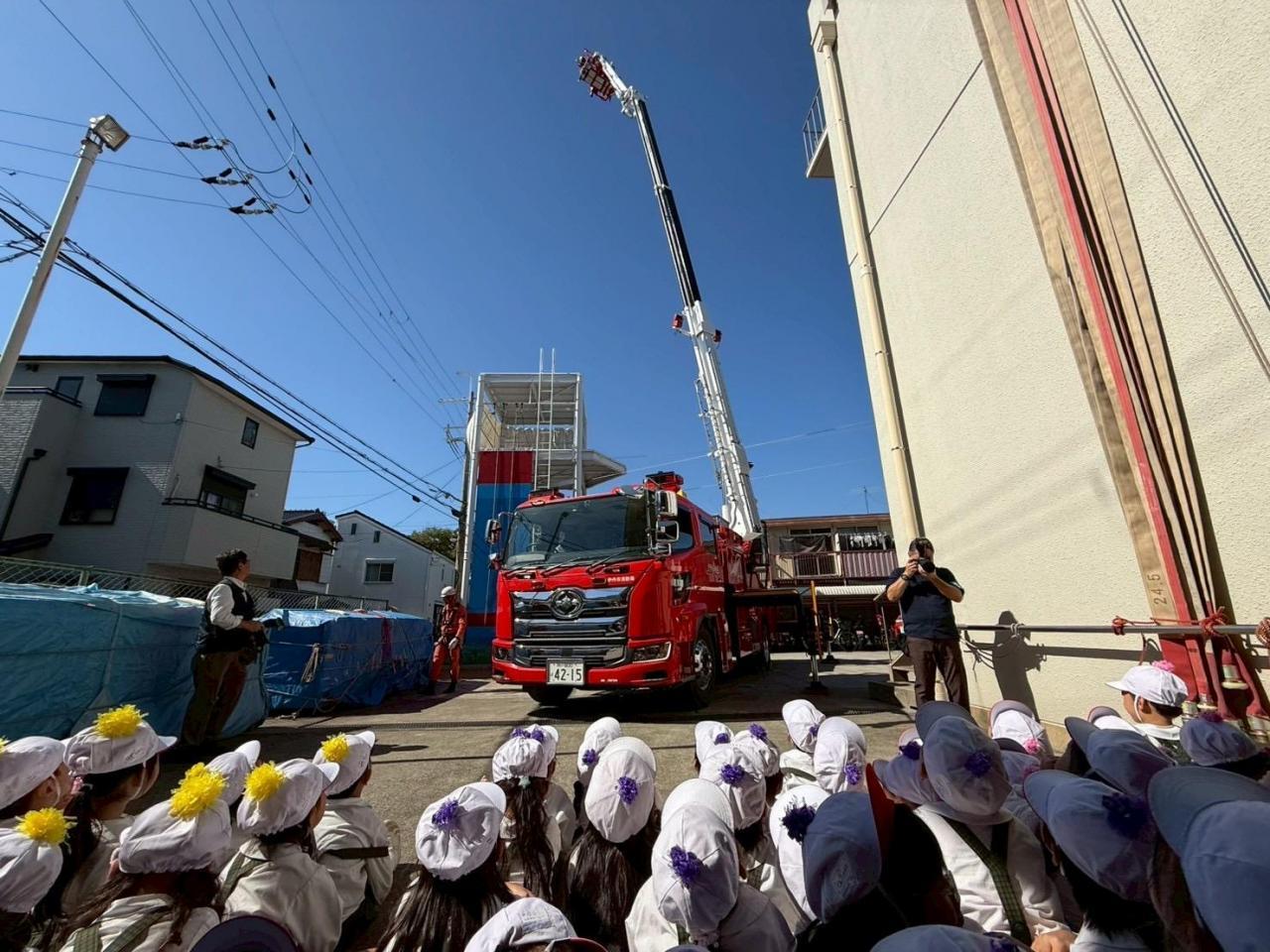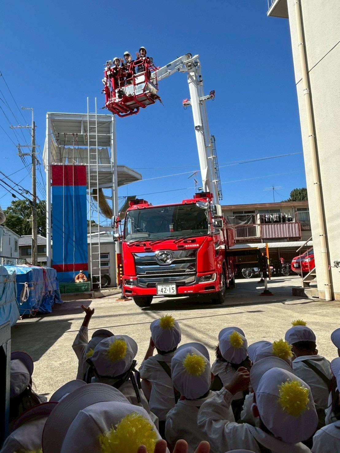 はしご車には先生2人が試乗しました!25mの高さまであがって、子どもたちは「先生がどんどん上に行っちゃう〜!」と大興奮でした☺️