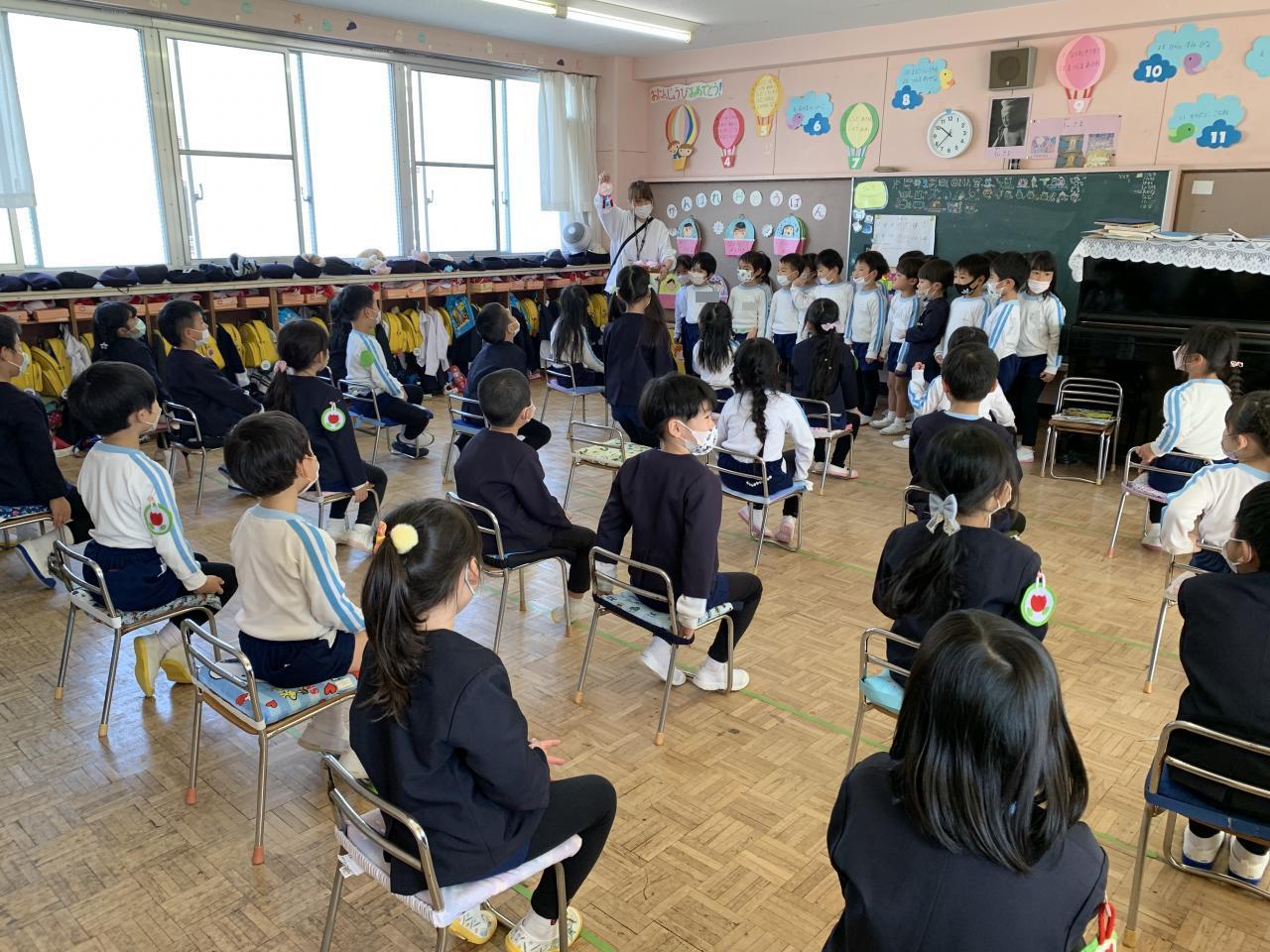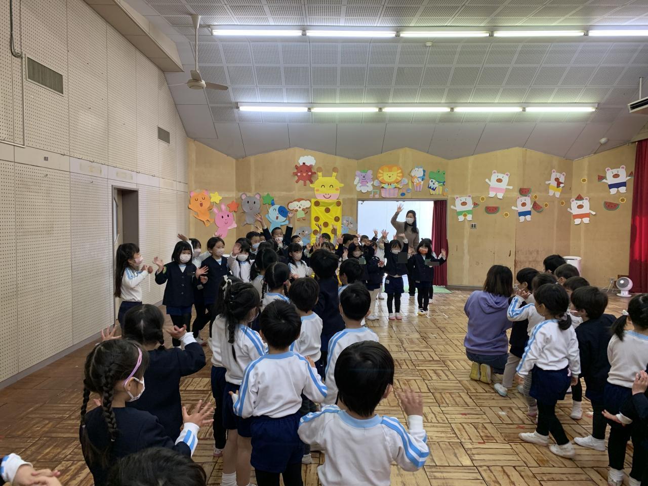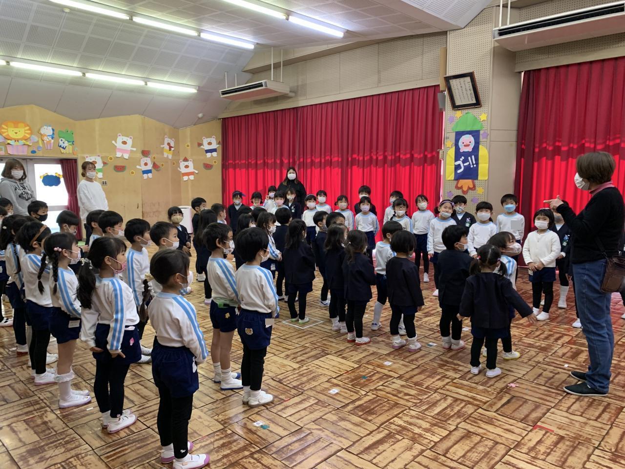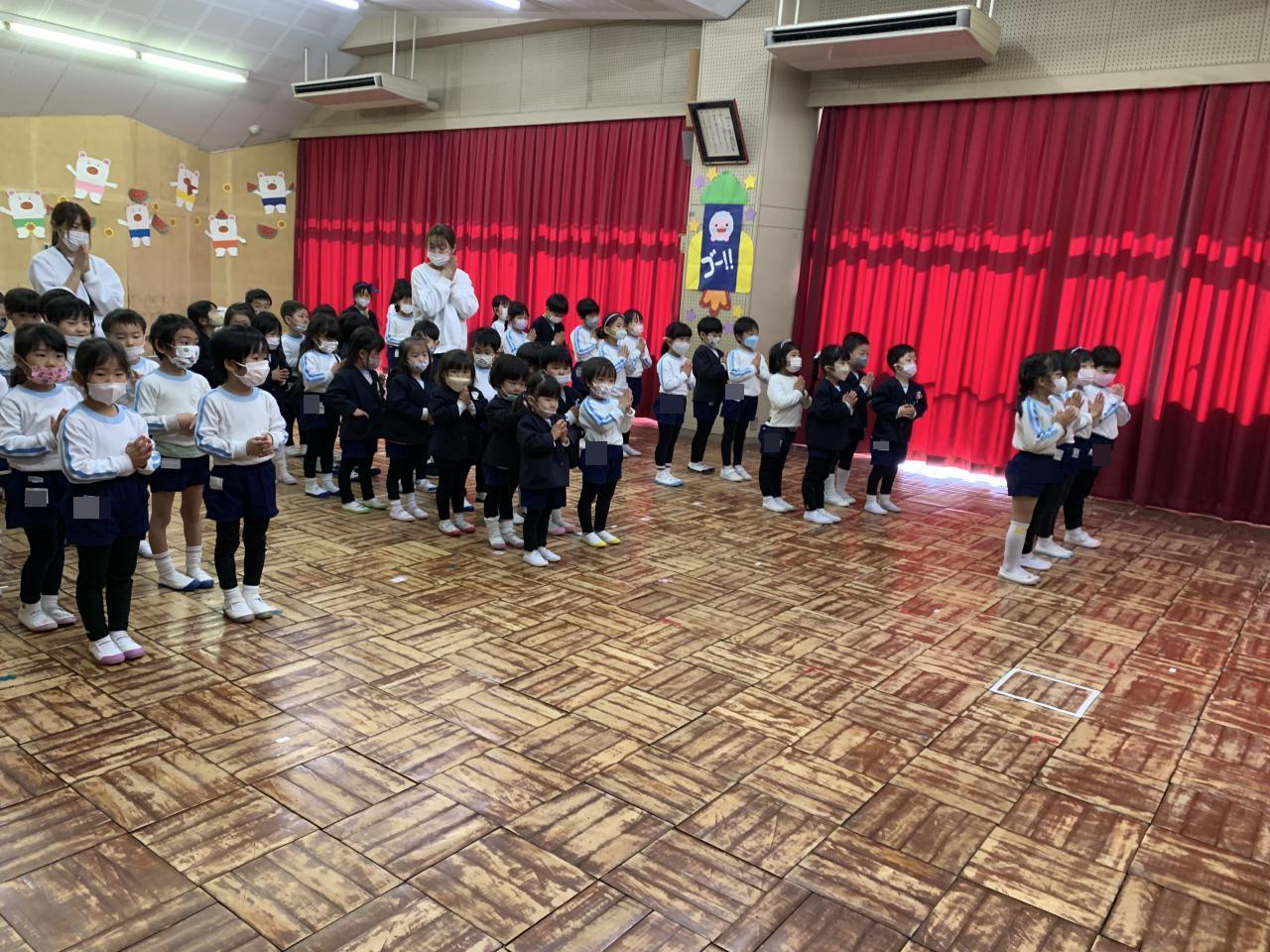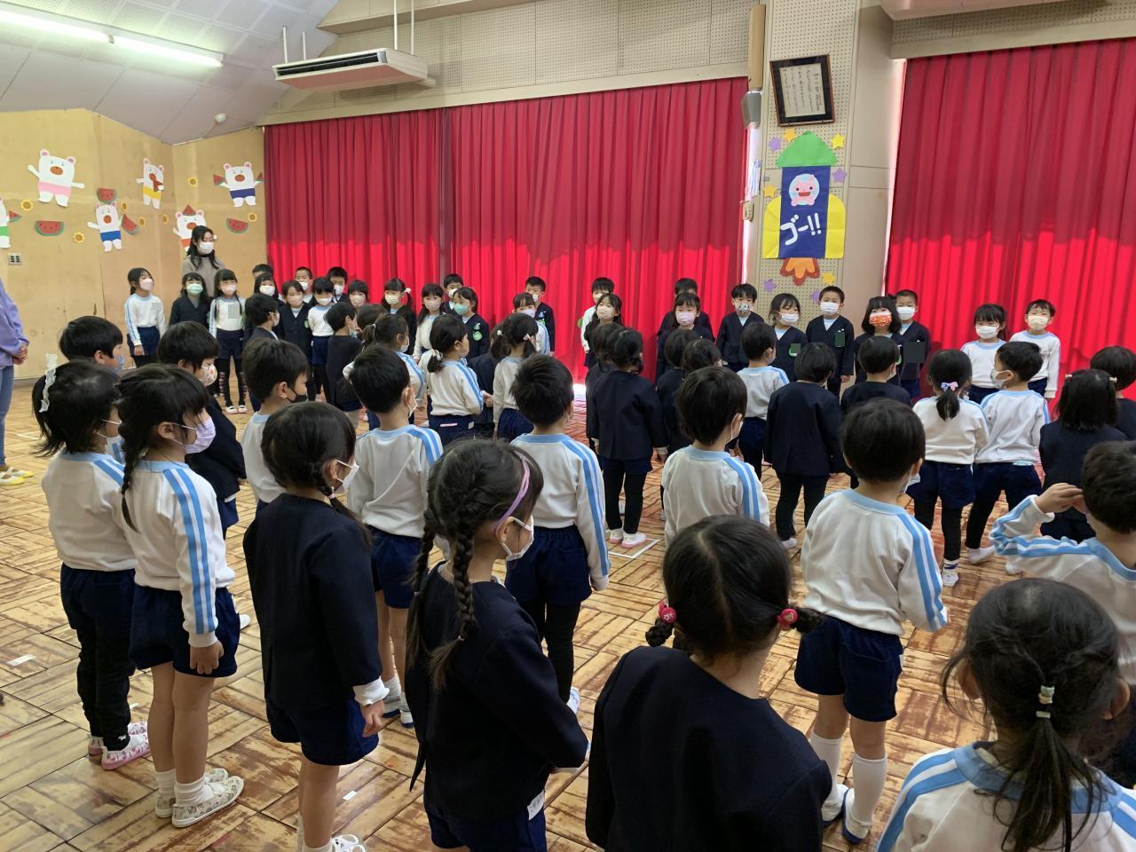 礼拝とお誕生会のあと 年長組と年中少組が向かい合って「おくることば」と「おわかれのことば」を伝えあいました。