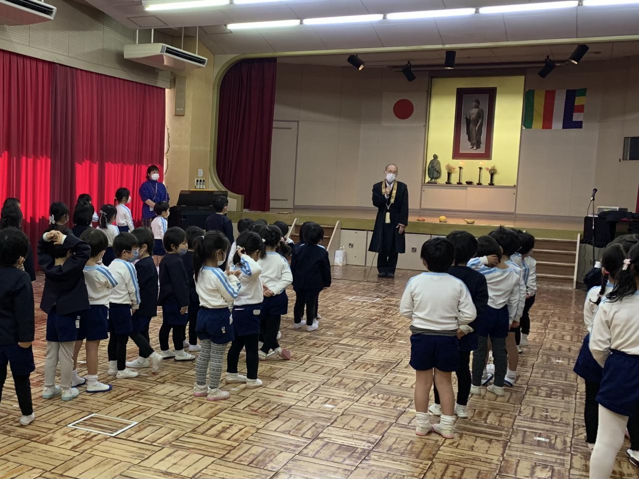 園長先生からお釈迦の教えを聞きました。『できないことを一生懸命頑張ってもできないお友達のことを笑ってはいけませんよ』 という教えでした。そしてその教えを聞き自分は「どうなんだろう」と考えてみてくださいね。とお話しがありましたよ。