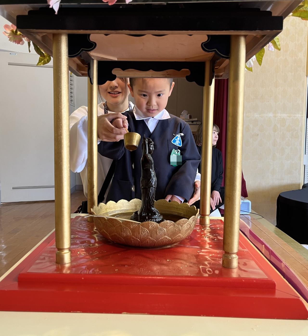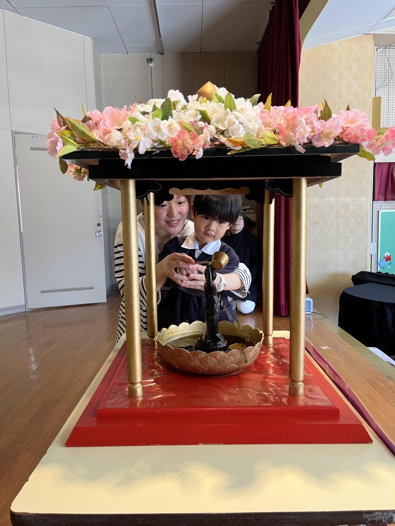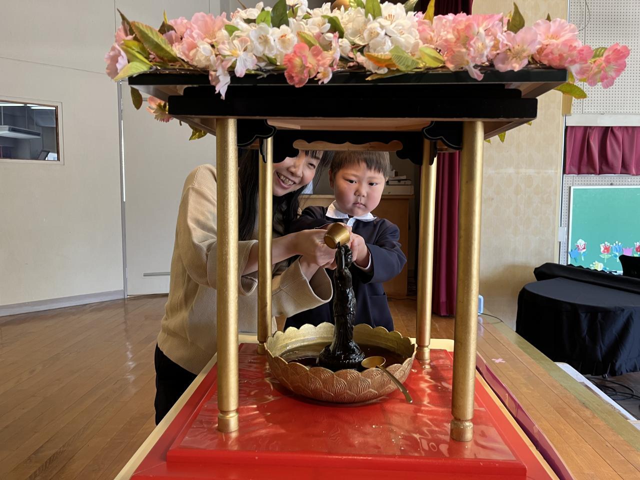 子どもたちも手を合わせて、甘茶をかけて、ちょっぴり厳かな時間を過ごしました!