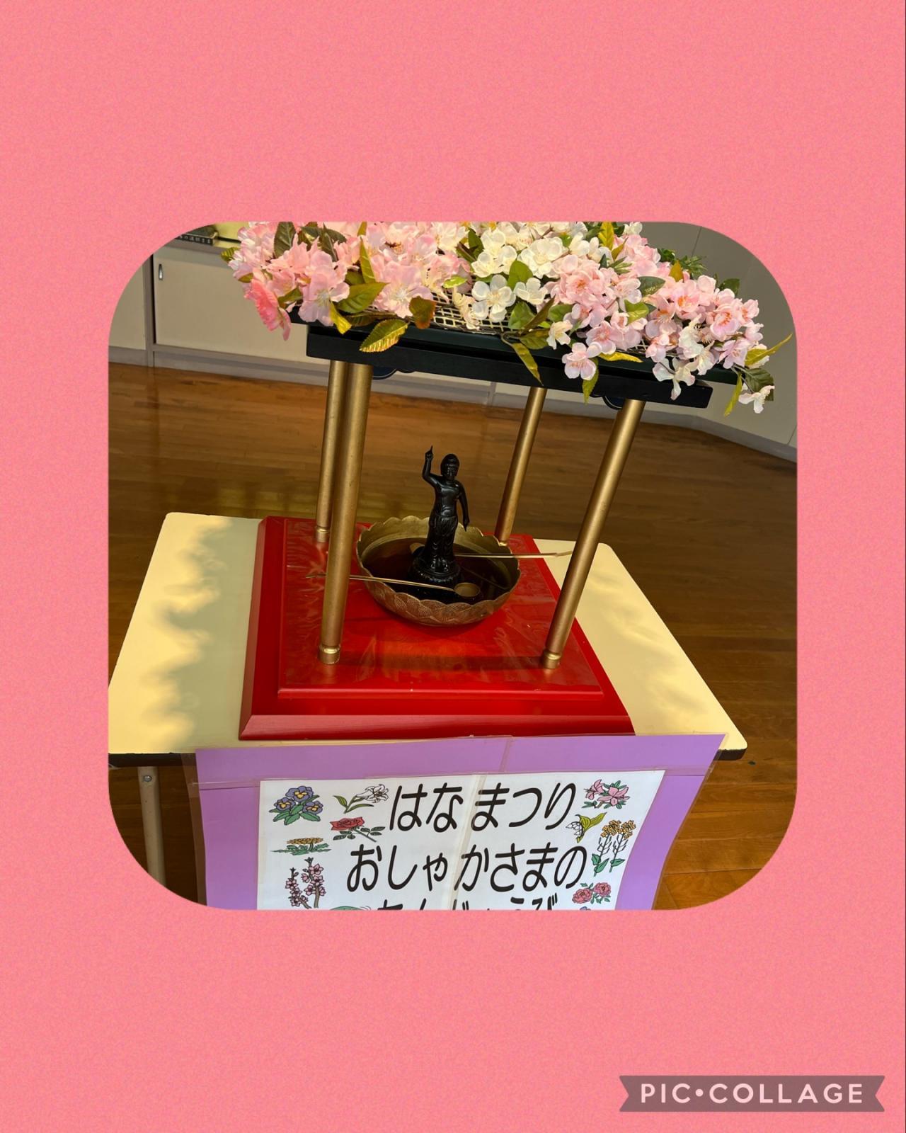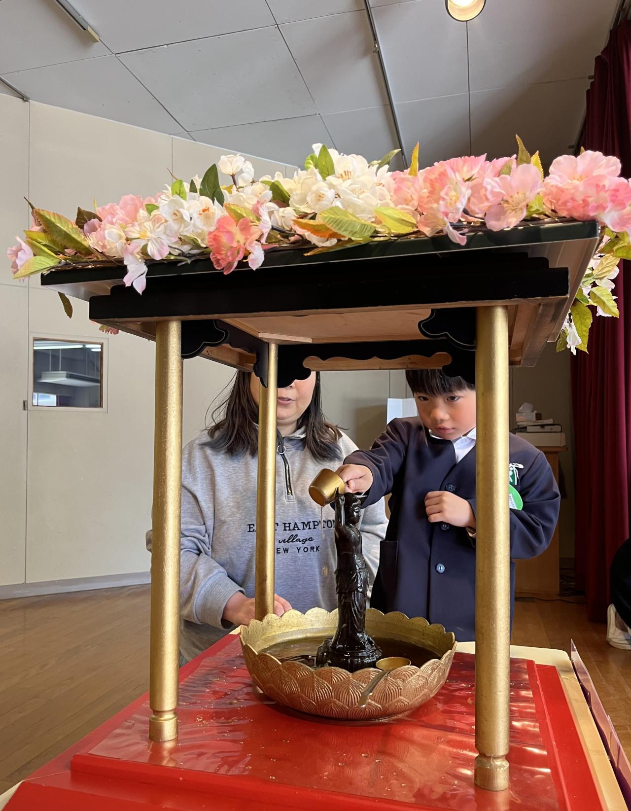 今日は、始業式のあと、おしゃかさまの花まつりで、甘茶かけをしました!