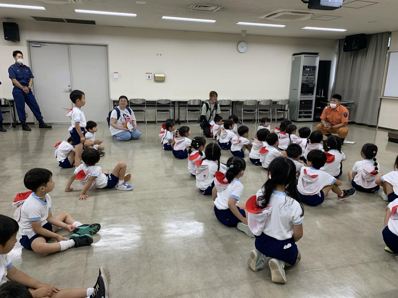 災害護身術では、体に火がついたらどうするのか。火事が近くで起こったらどうするのかなど・・・いろいろなことを教えていただきました。消防署館内でとても静かに行動ができていて、かっこいい年長組でした。