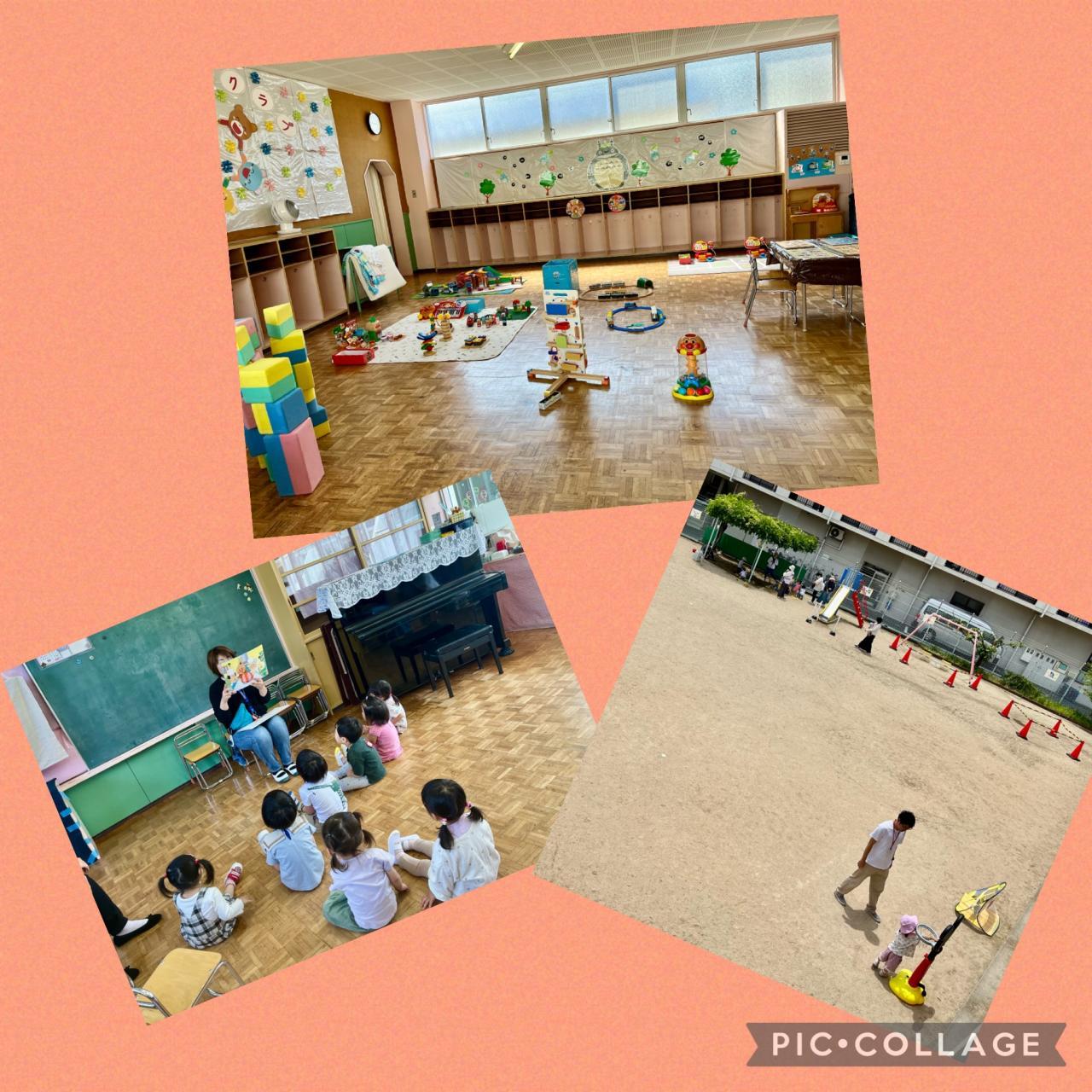 まずはお部屋で遊んで、ちょっとした手遊びあり、紙芝居あり、最後は園庭でいっぱい遊んで、