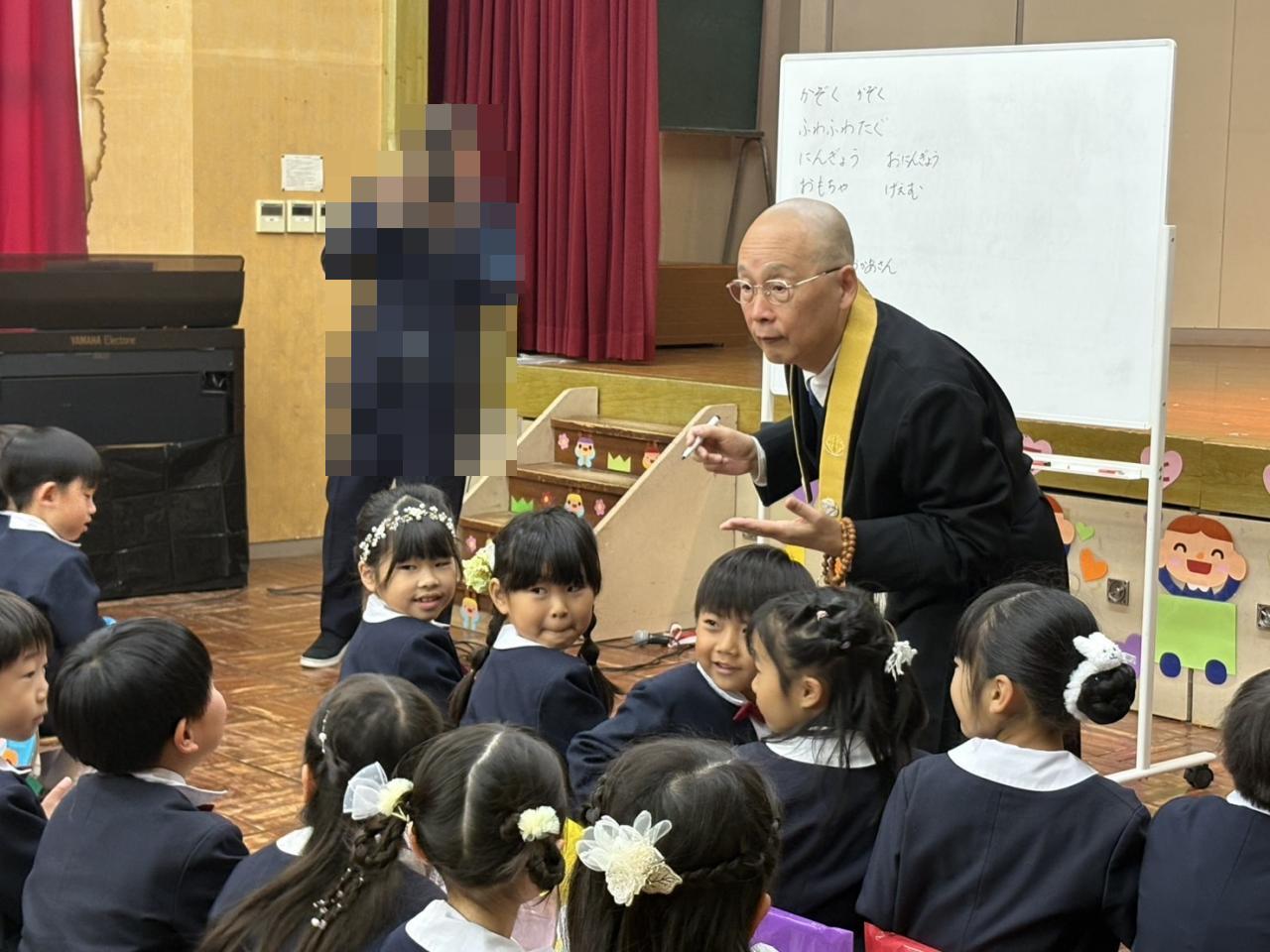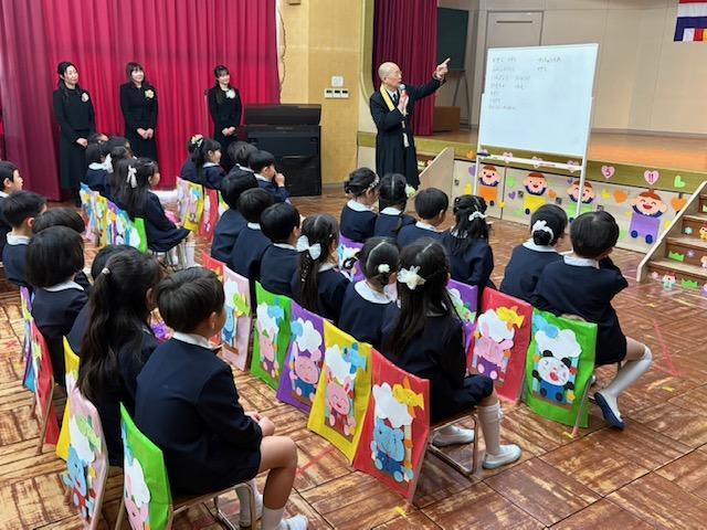 園長先生から最後のお話です。「みんなの宝物はなんですか?」との問いかけに挙手をして、発表していきます。
