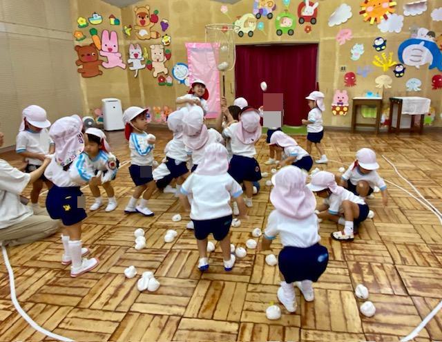 今週の年少さんは、お遊戯室で「玉入れ」をしたりお外で「むっくりくまさん」という鬼ごっこをしたりして、楽しく過ごしました✨