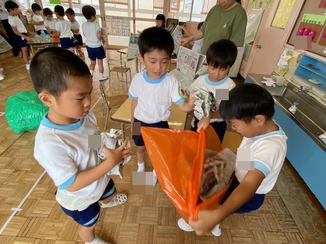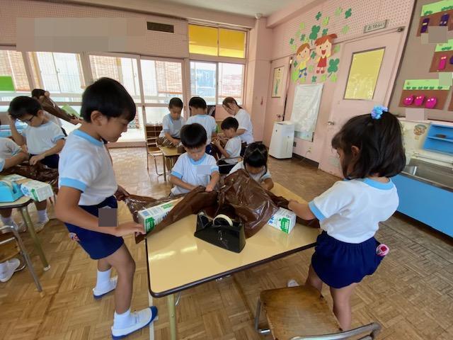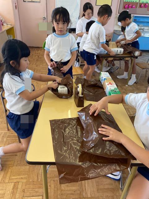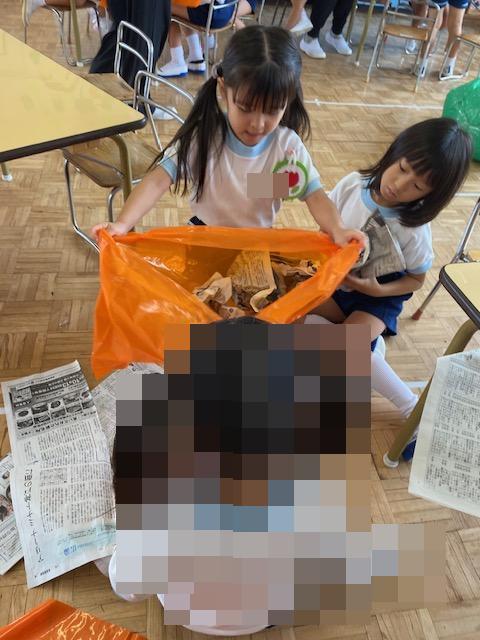 大きなカラーポリ袋に新聞紙を入れていくよ~協力して入れていきますよ!