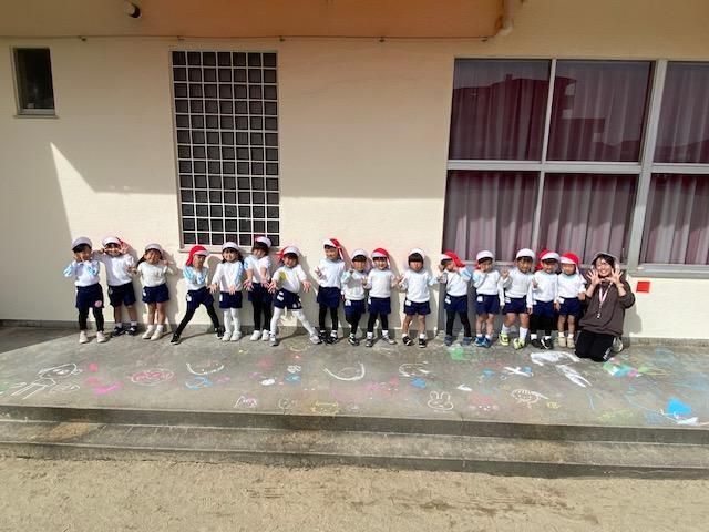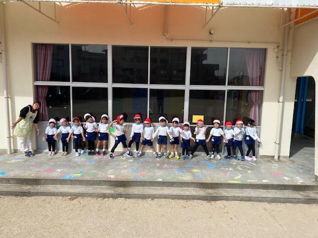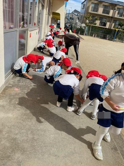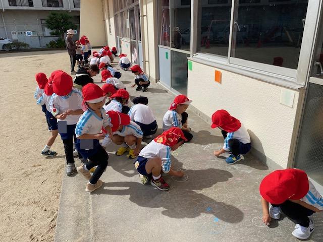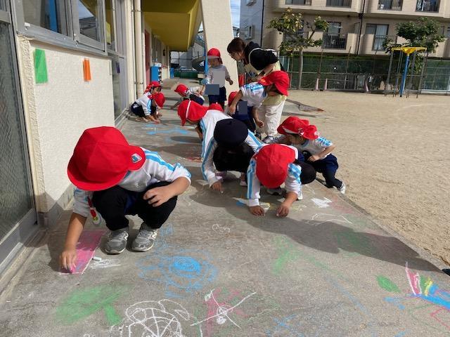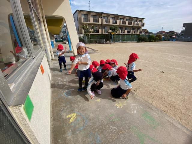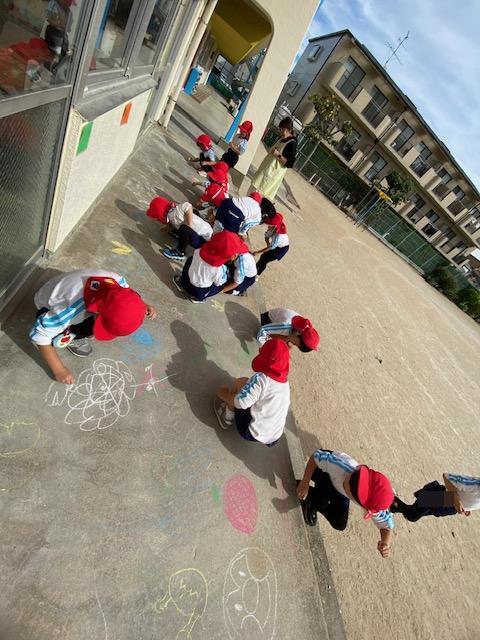 お当番活動の後には、テラスにチョークでお絵描きを楽しみました😄