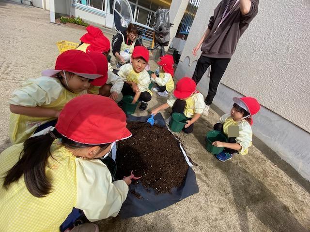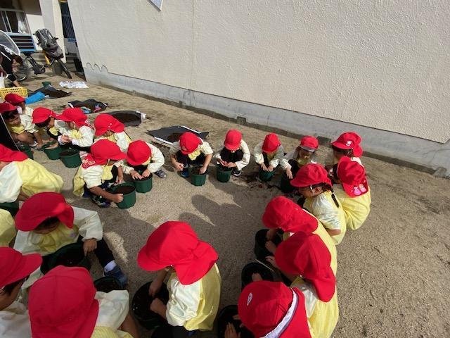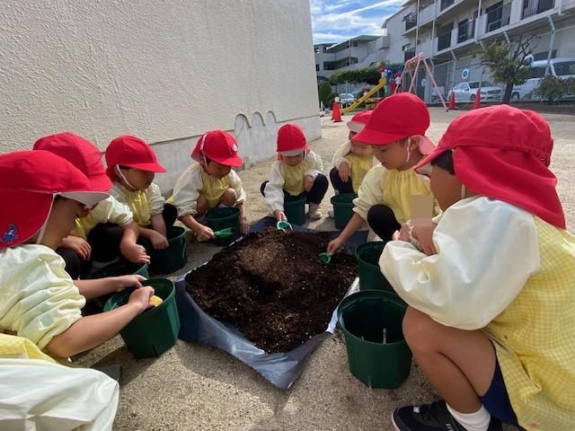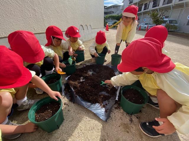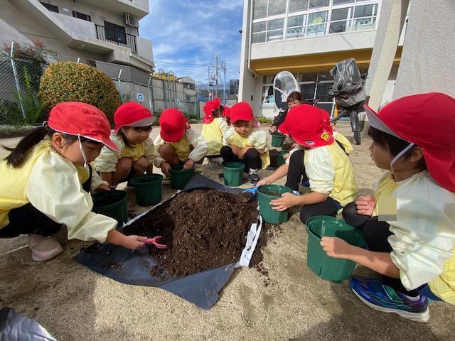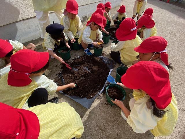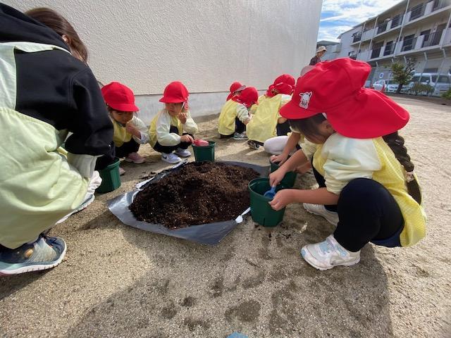 一人ずつ植木鉢に土を入れて、ちゅうりっぷに優しく土をかけてあげましたよ😌