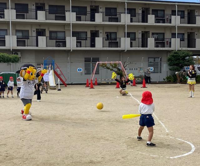 キー太くんが投げてくれたボールを年中・年長児がバットで打ちました🏃