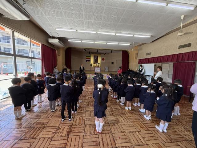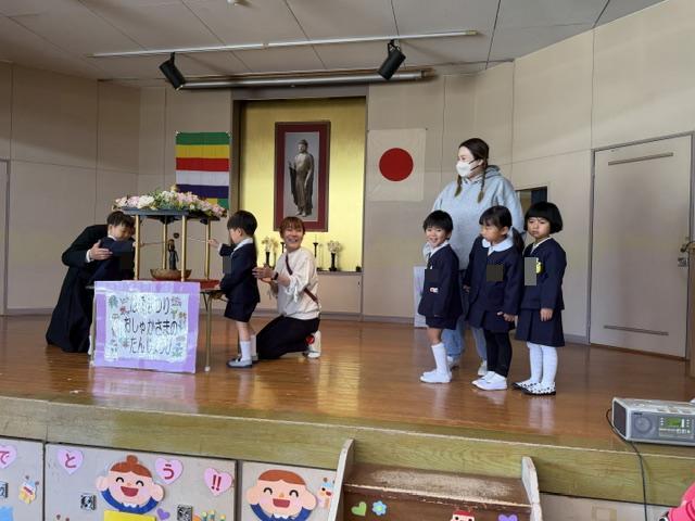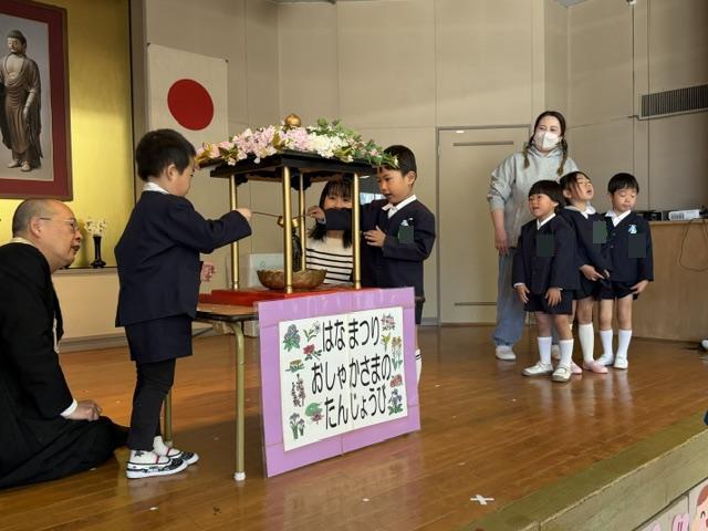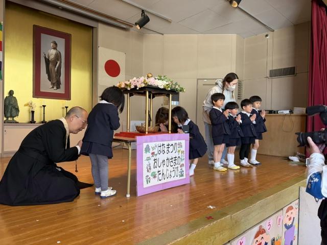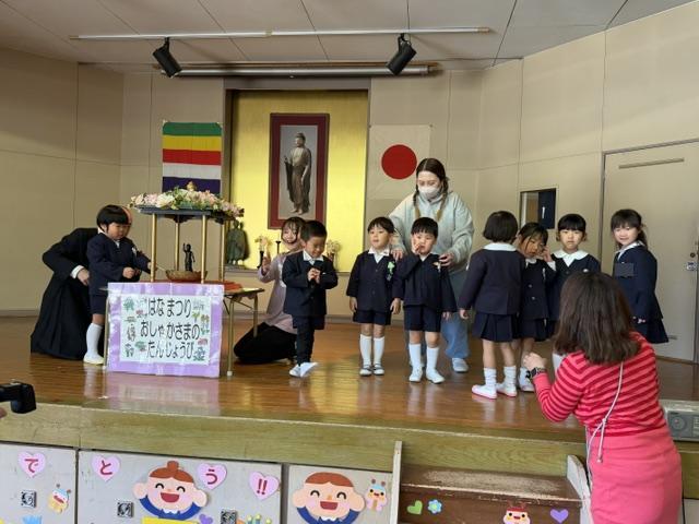 園長先生のお話を聞いたあとに、一人ずつ赤ちゃんのほとけさまに甘茶をかけてお祝いをしました🎉