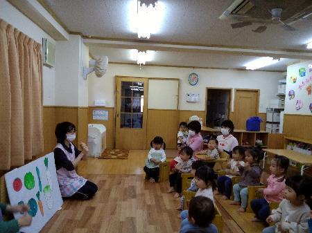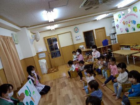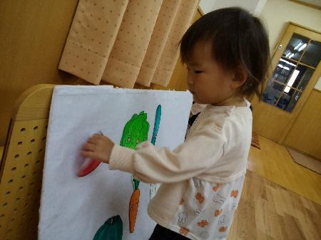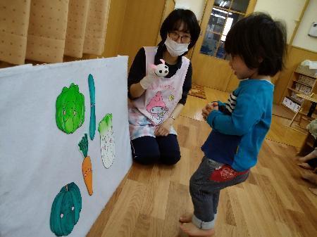 今日はお楽しみ会がありました。出し物は「やさいのうた」のパネルシアターで、音楽に合わせて手遊びもしました。最初は先生の手遊びを不思議そうに見ている子ども達でしたが、次第に手の動きを真似してみようとする様子も見られました。