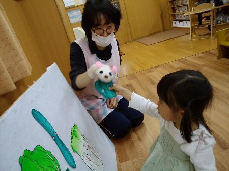その後は、お友達に前に出てきてもらい、野菜のパネルをパペット人形のうさぎさんに食べさせてあげました。少しうさぎさんにビクビクしながらも上手に食べさせてあげる様子がかわいらしかったです。このお歌を通して少しでも野菜に興味をもってくれると嬉しく思います。