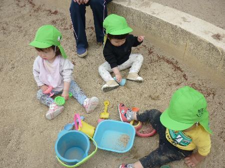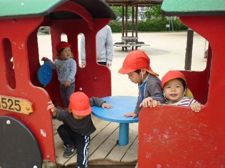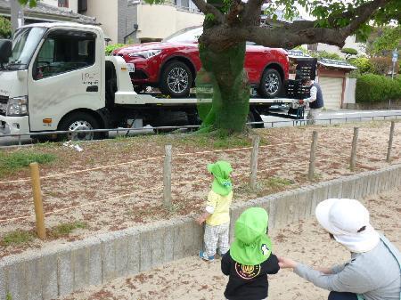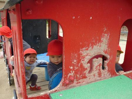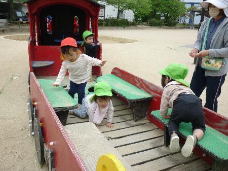 1才さんは初めて、2才さんは久しぶりの生津公園で汽車の遊具や公園の外を走るゴミ収集車やレッカー車に大興奮の子どもたちでした。