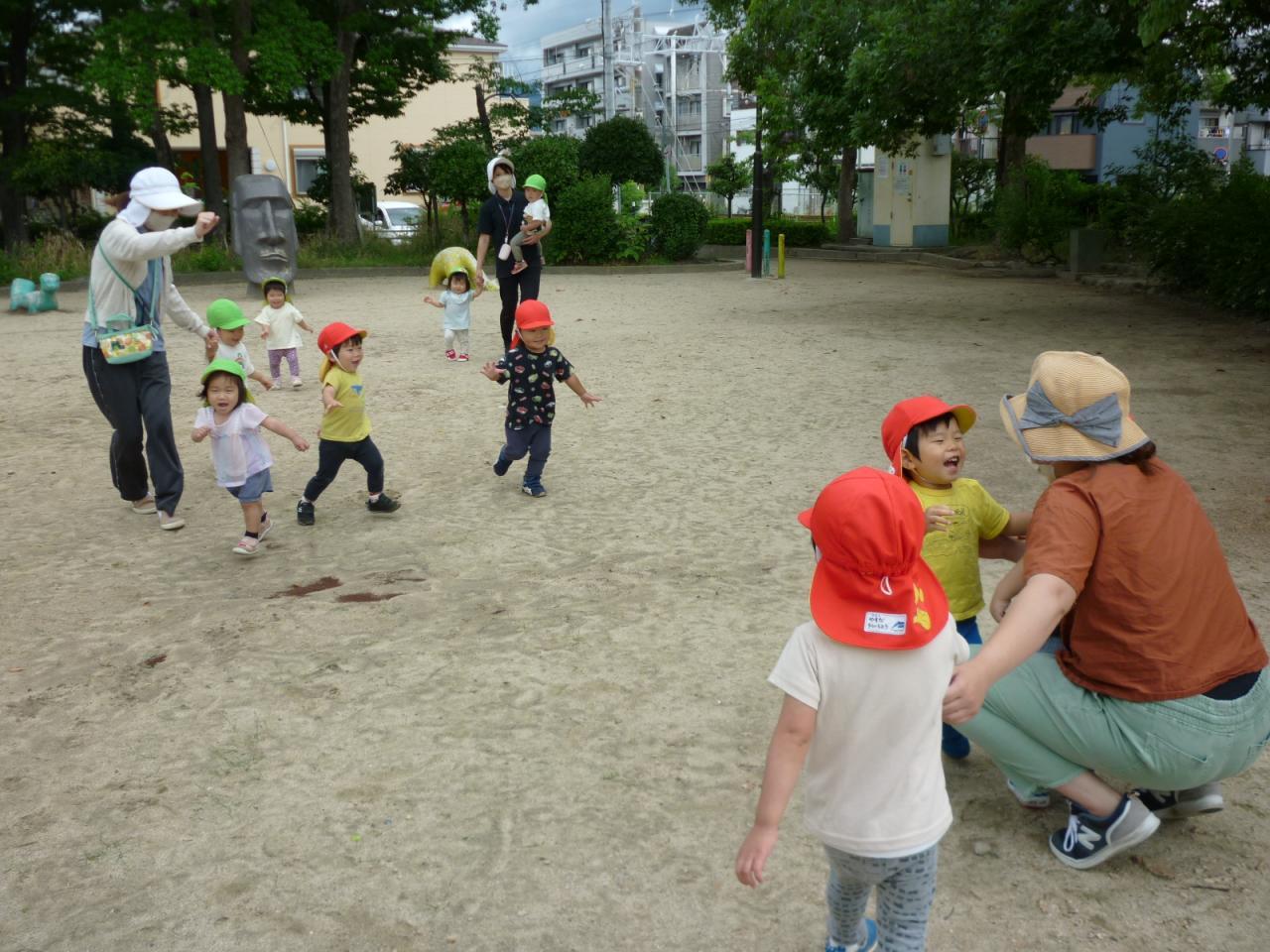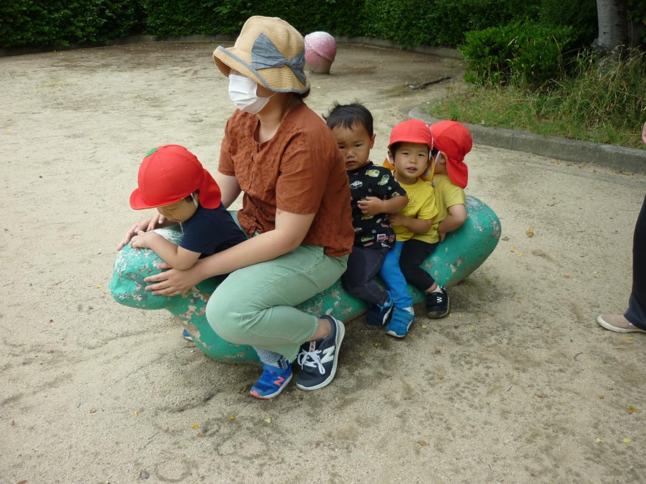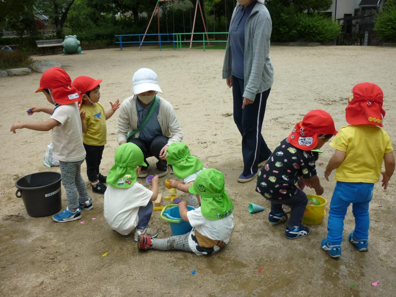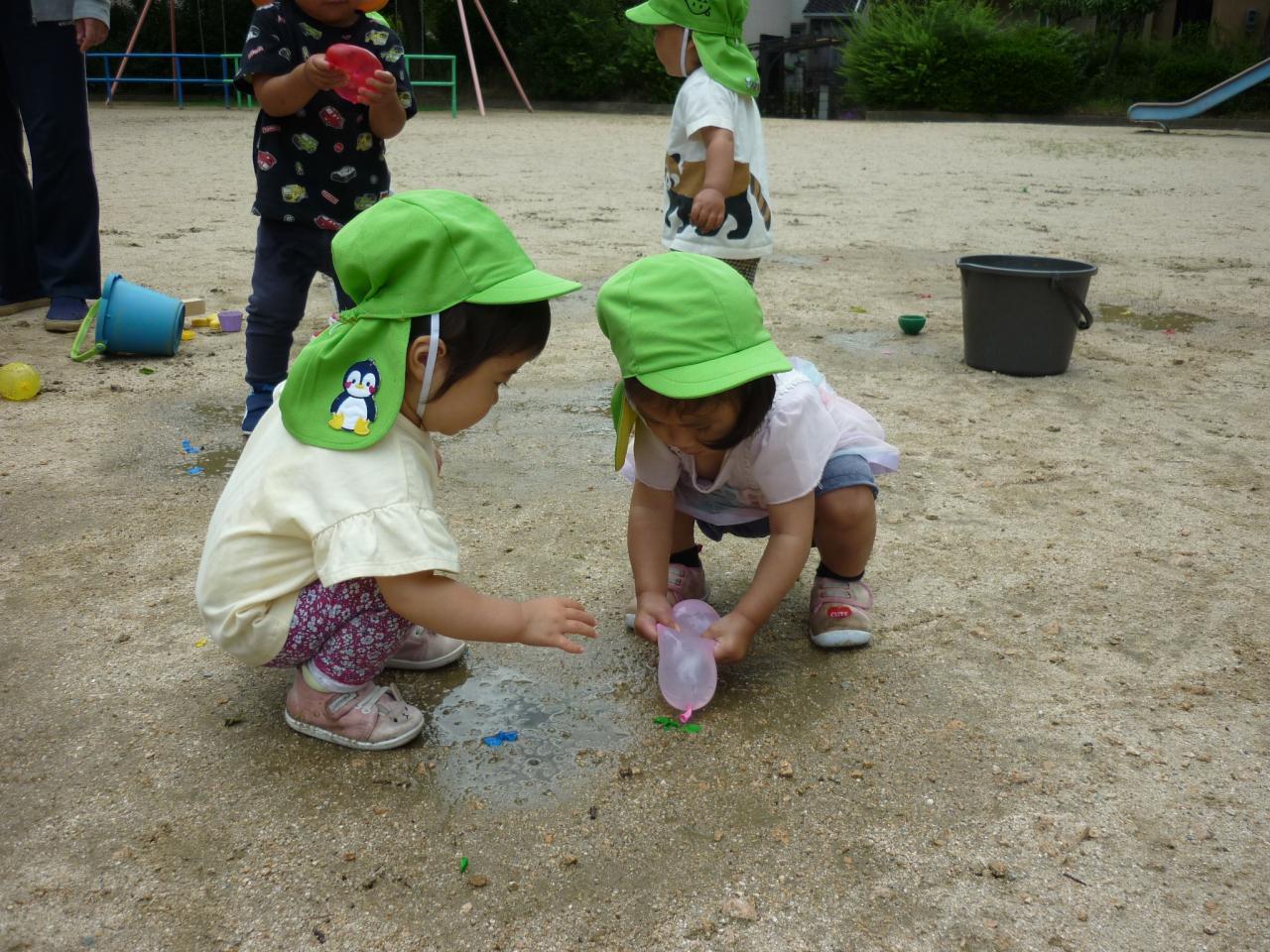 公園では、水風船を使って一足先に、夏の遊びを楽しんだり、