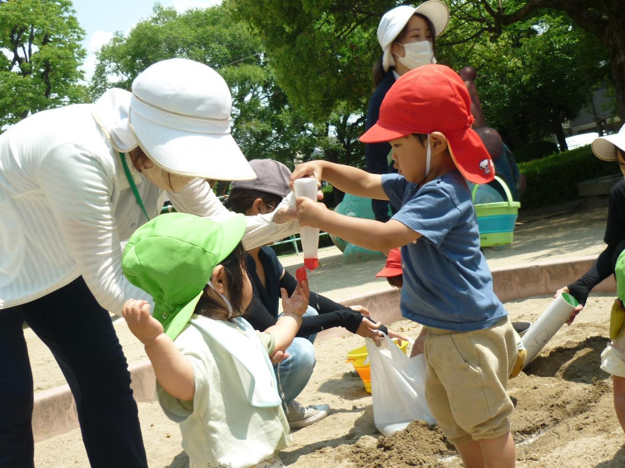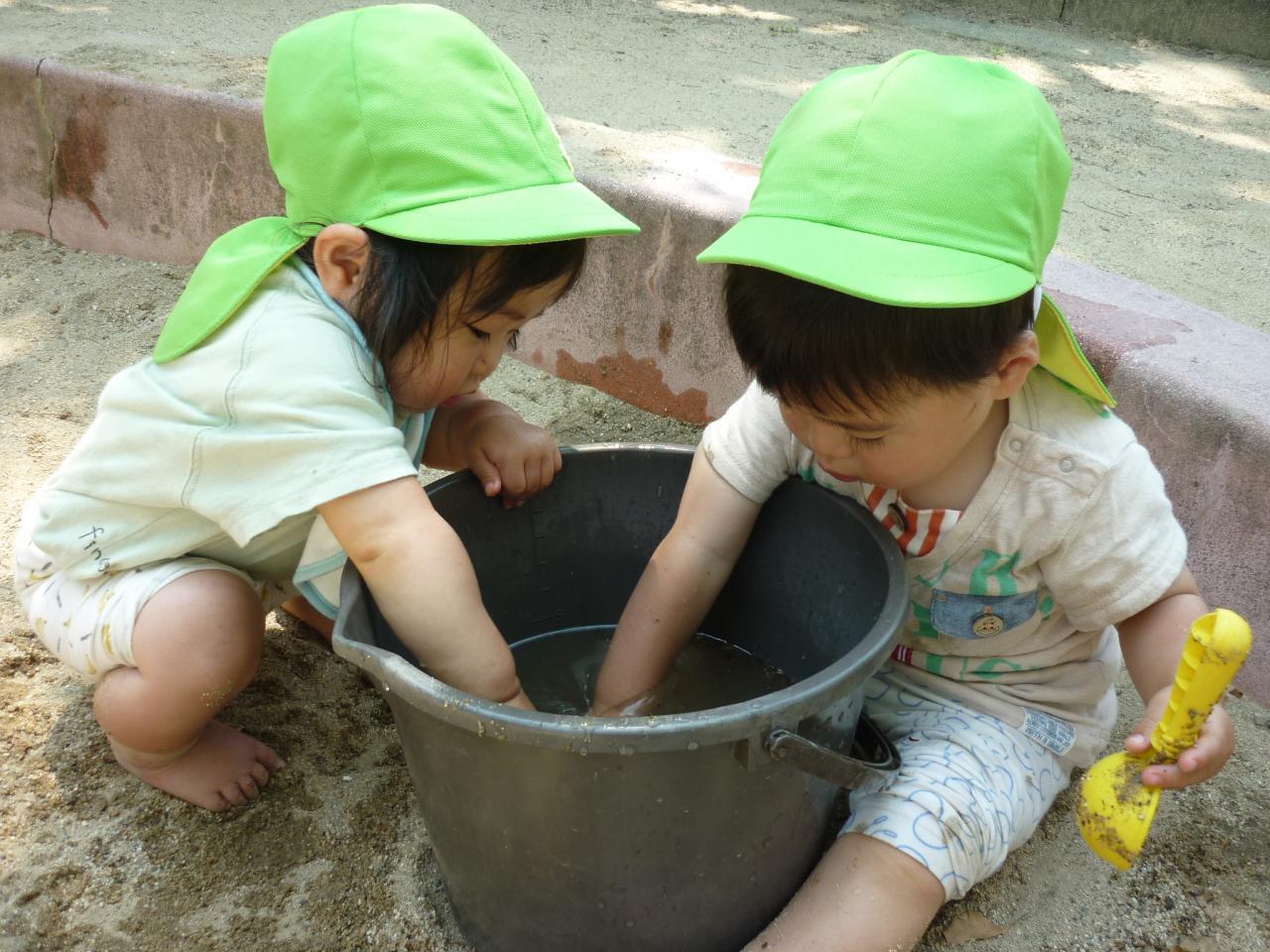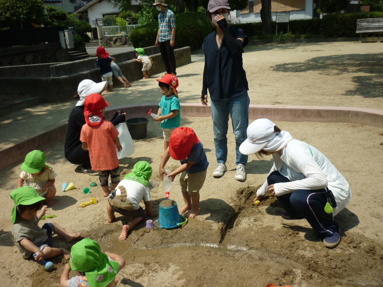 6月10日は『時の記念日』でしたので、2歳児は時計製作をし、素敵な腕時計をつけて中河原公園へ!とても暑かったので、冷たい泥が気持ち良く感じました。