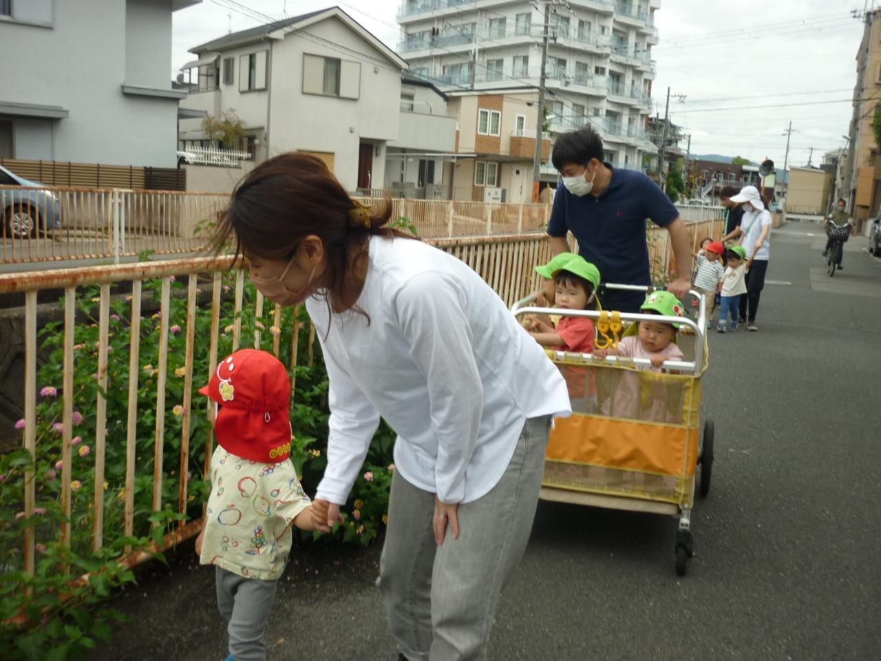 そしてお散歩へ出発!お父さんにサークル車を押してもらったり、お母さんに手を繋いでもらったり、ニコニコ笑顔で雨上がりのお散歩を楽しみました。