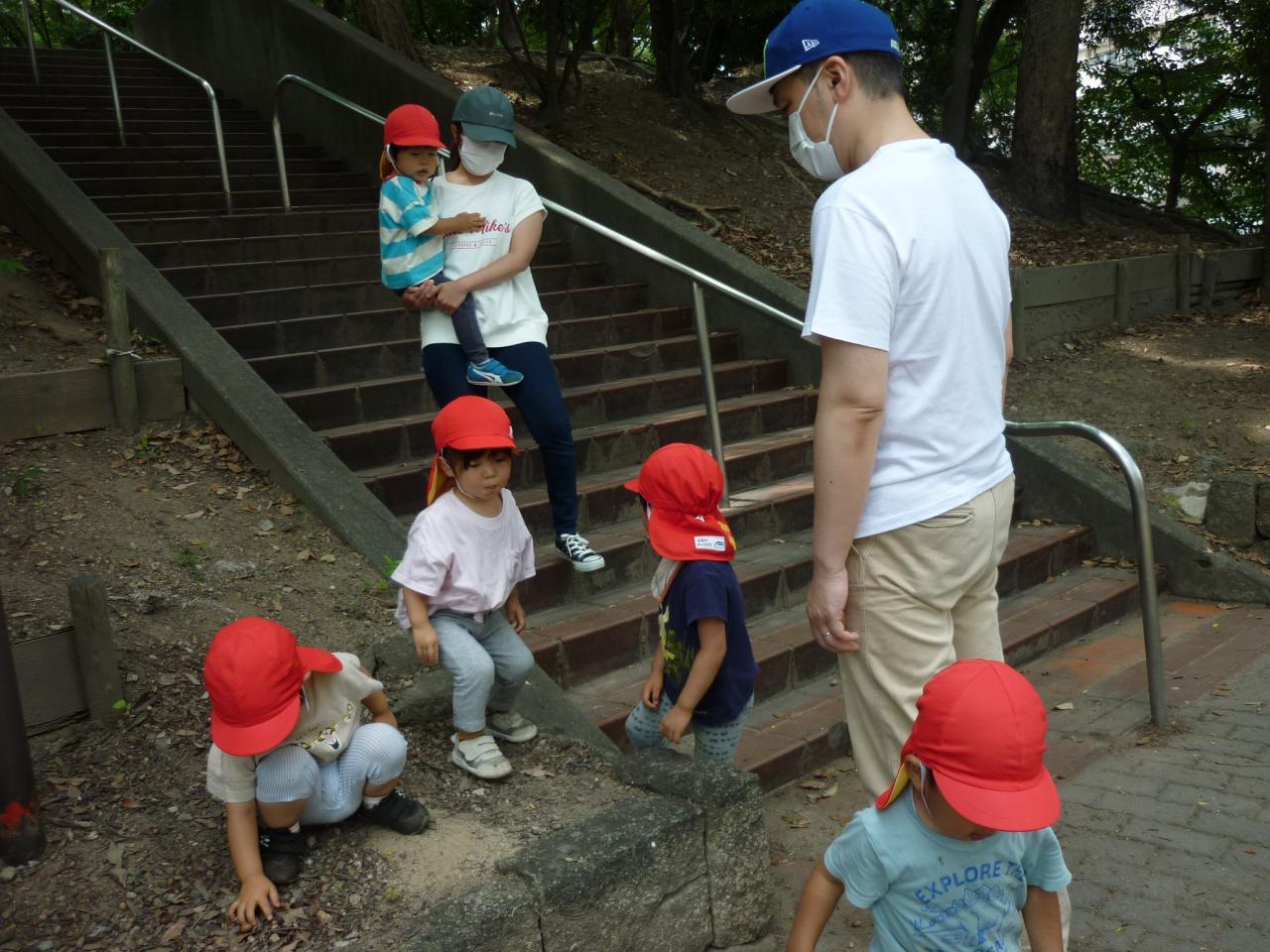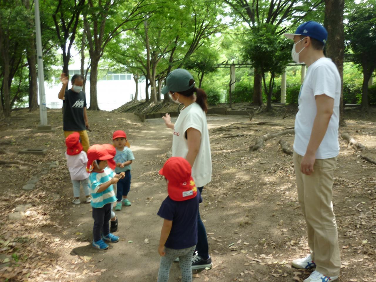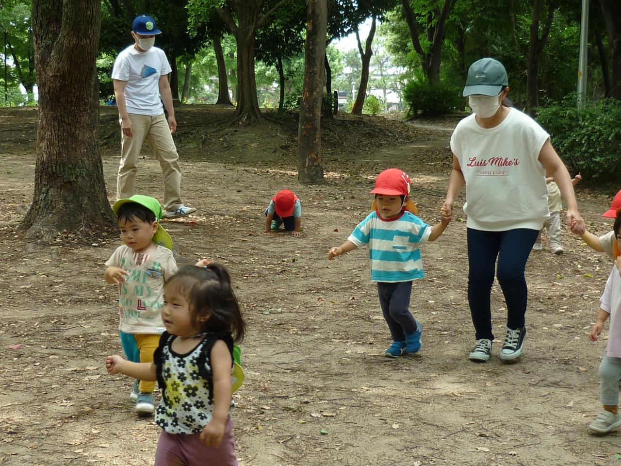 七夕製作のぬたくりをしてから大井戸公園へ!一足先に公園で遊んでいたお友だちと合流し、みんなで追いかけっこをしたり、お歌を歌ったり、木がたくさんある森の木陰で元気いっぱい身体を動かしました。