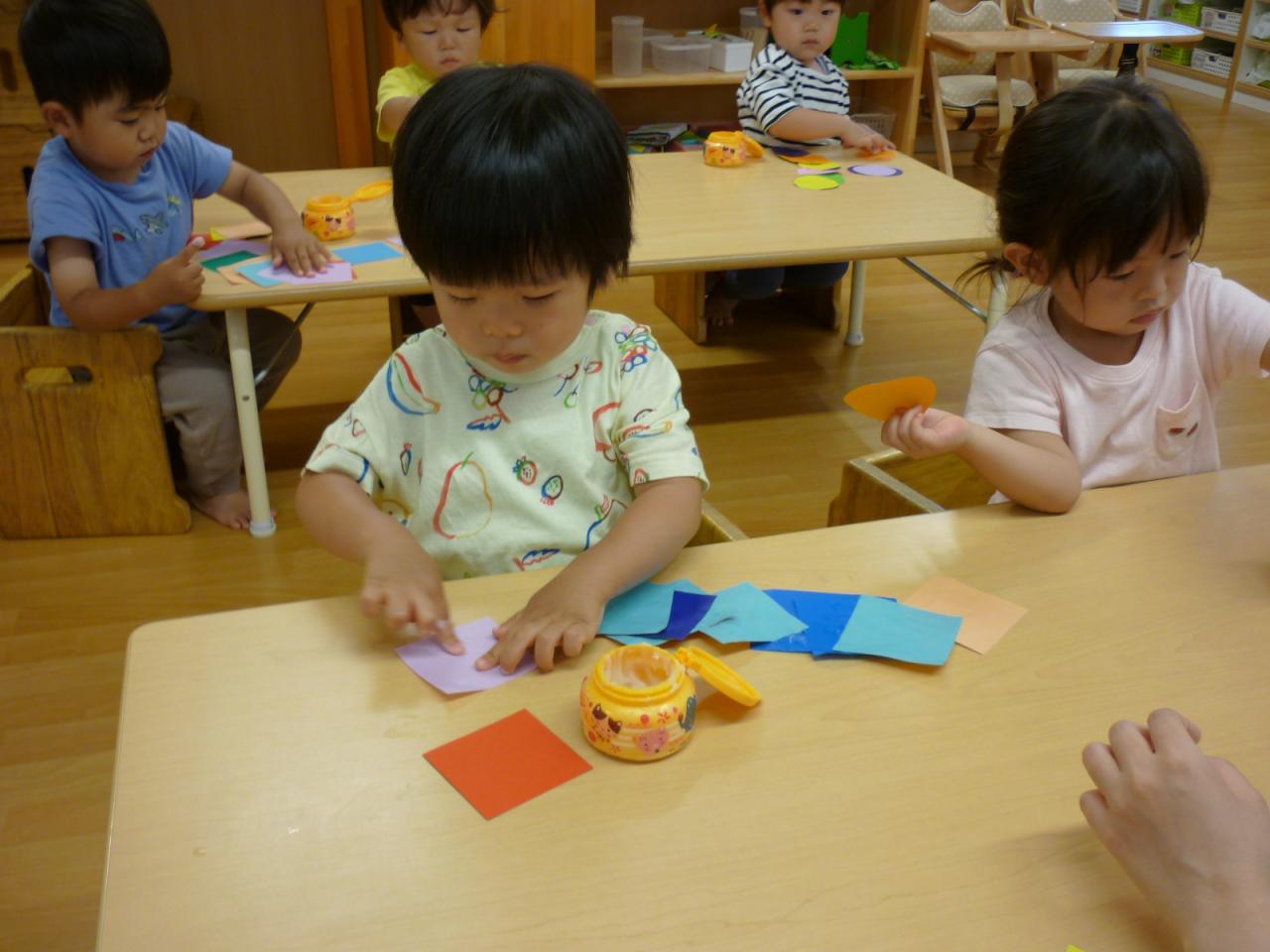 その後は七夕製作の色紙つなぎです!「丸にする?四角にする?」と尋ねると「四角大好きなの~」と教えてくれたり、手で形を作って伝えてくれました。