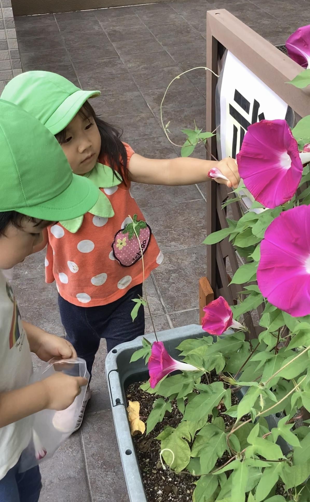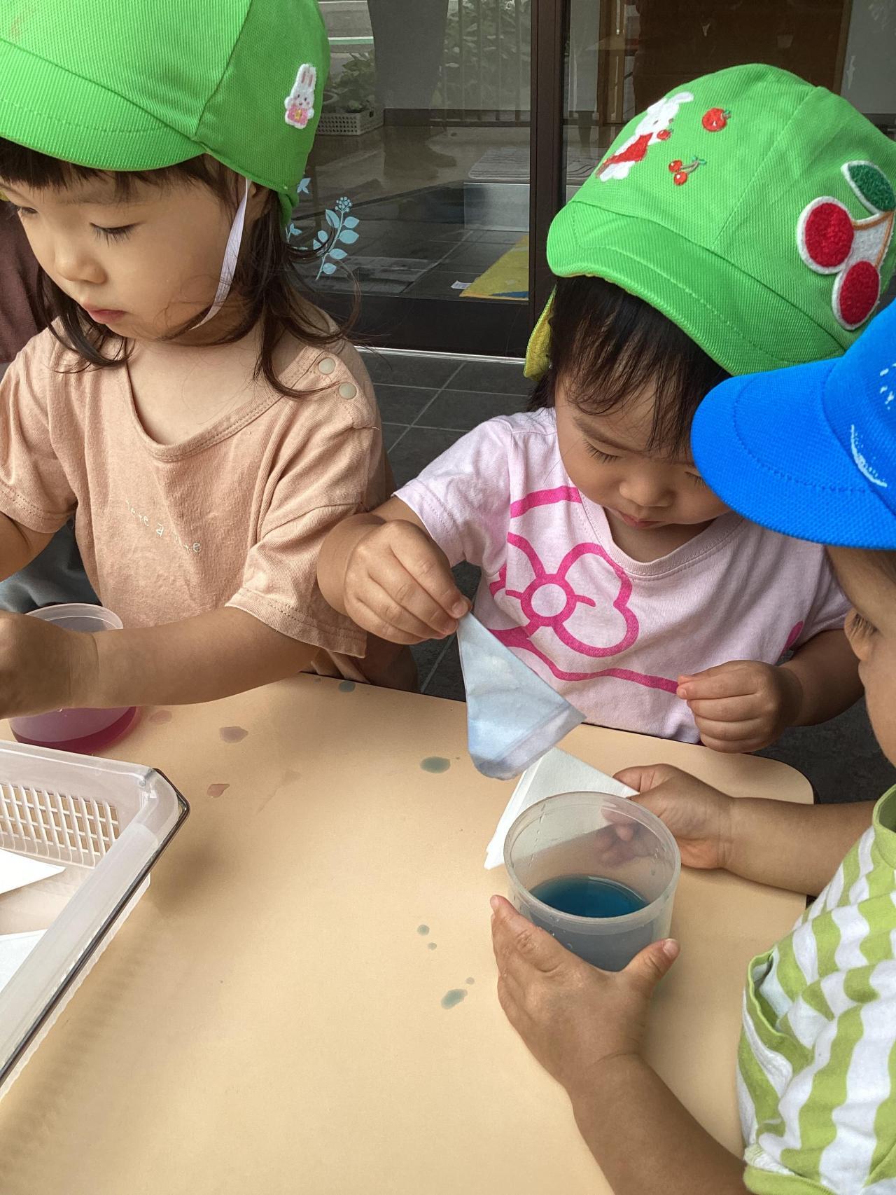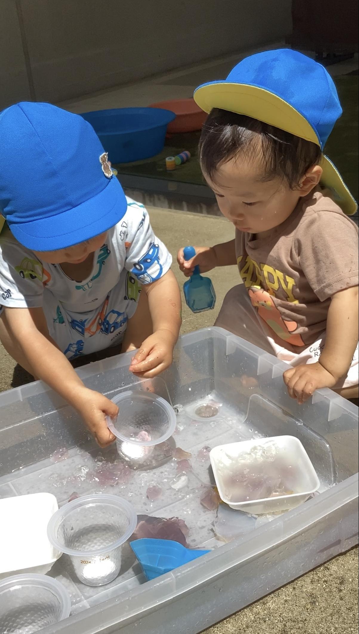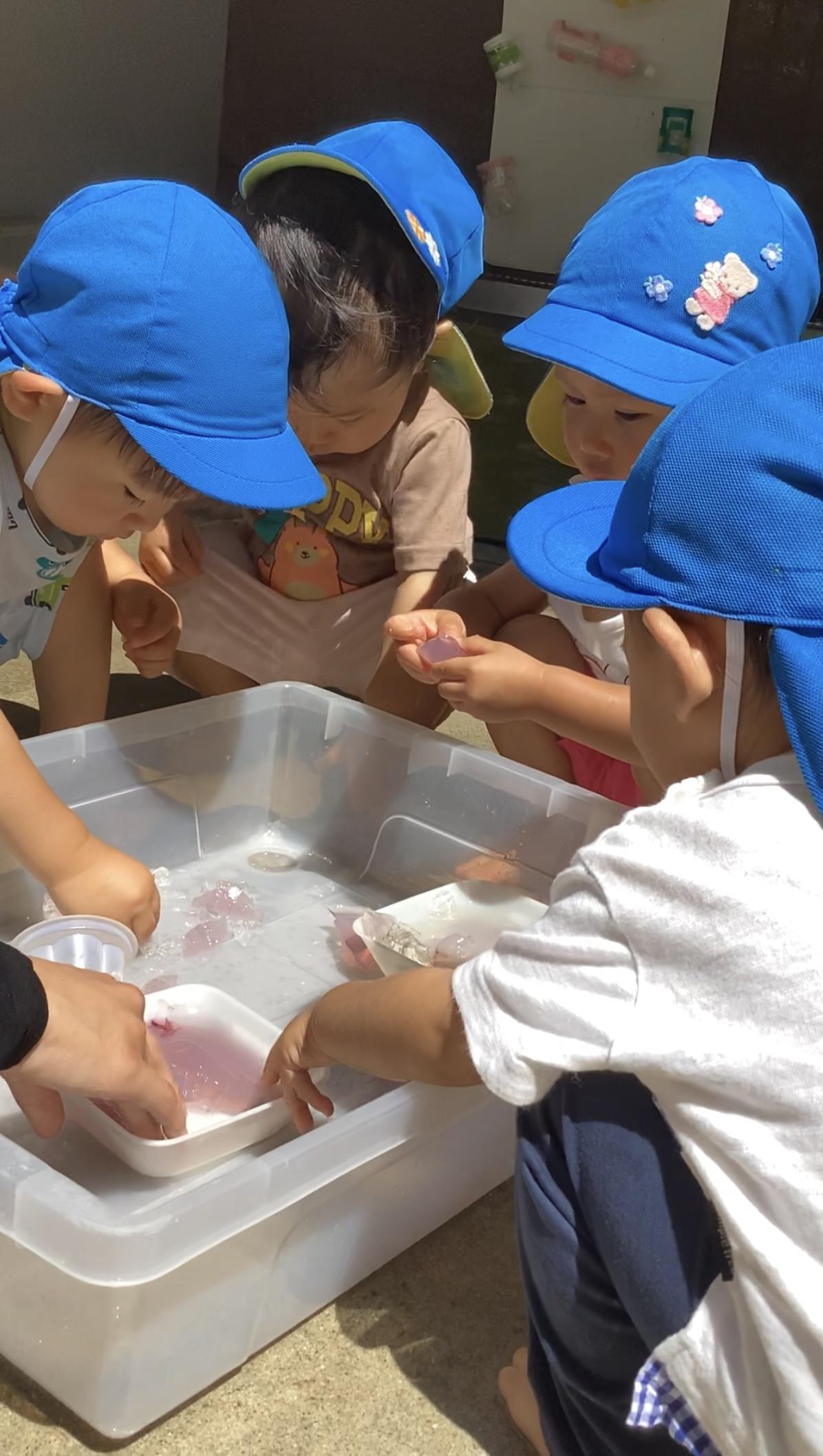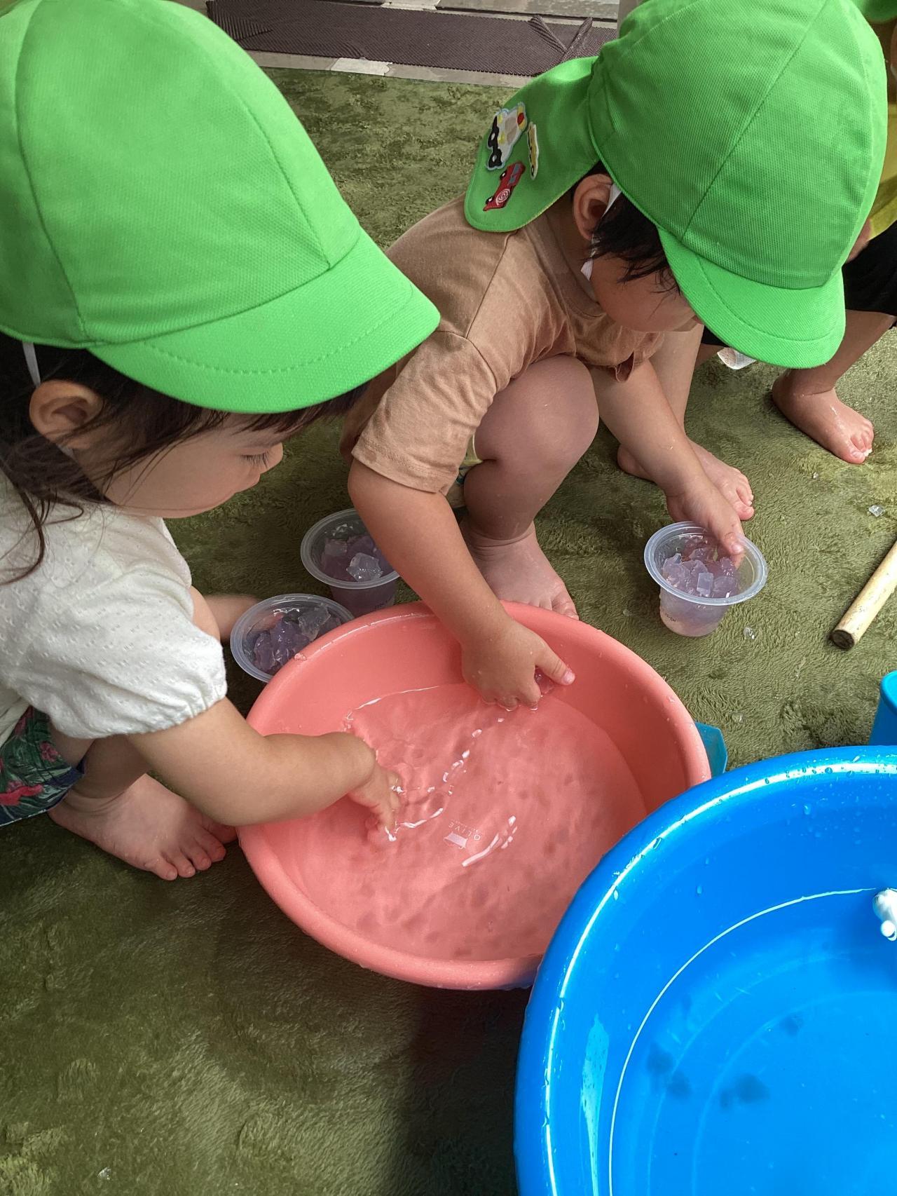 大小様々な洗面器やバケツ、ゼリーカップ、おたまや手作りおもちゃなどお気に入りのおもちゃを使って遊んでいます。朝顔の花で色水を作ったり、色氷や寒天で感触あそびをしたり、水風船や霧吹き鉄砲でダイナミックに遊んだり、噴水マットから出るお水が顔にかかっても平気になり、すっかり水と仲良しになりました。