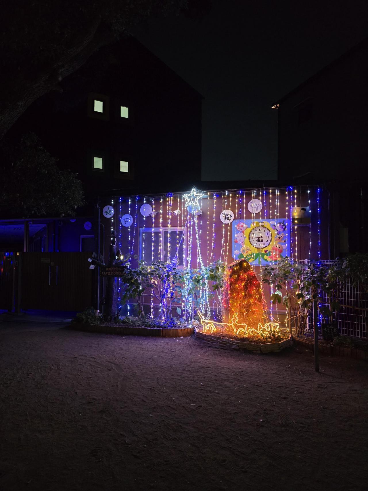 幼稚園は12月中、夜にイルミネーションを点灯させています。理由は派手好き園長ではなく、街は賑やかにライトアップされてる中、なかなか小さい子連れで夜に出掛けれませんよね…。流行り病も怖いですよね?そんな子育て世代の保護者の皆様の心が少しでも癒されればと思って行ってます。午後9時頃まではタイマーで着いてますので、心の癒しにご覧頂ければと思います。当園は神社母体ですが、12月にはクリスマスを皆で楽しみたいと思ってます!