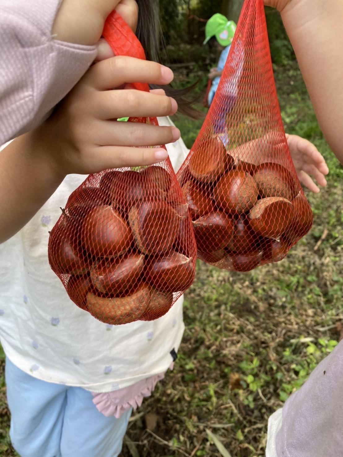 網袋をもらって栗拾いを始めると、「見て、大きいよ!」「あっちにもある、行ってみよう😆」と友達同士で話をしたり、網袋から溢れるくらいの栗を拾っている子どももいました🌰✨