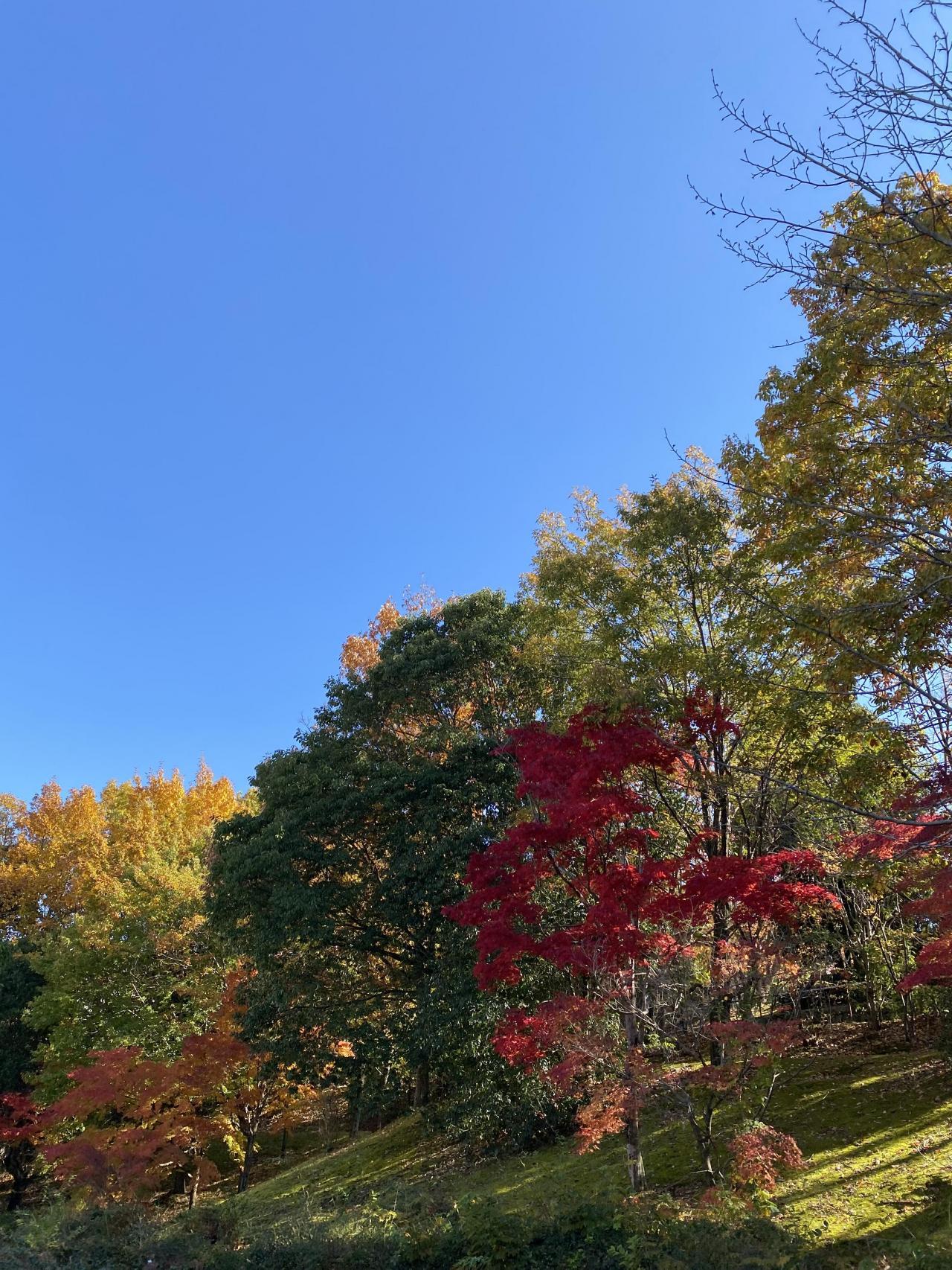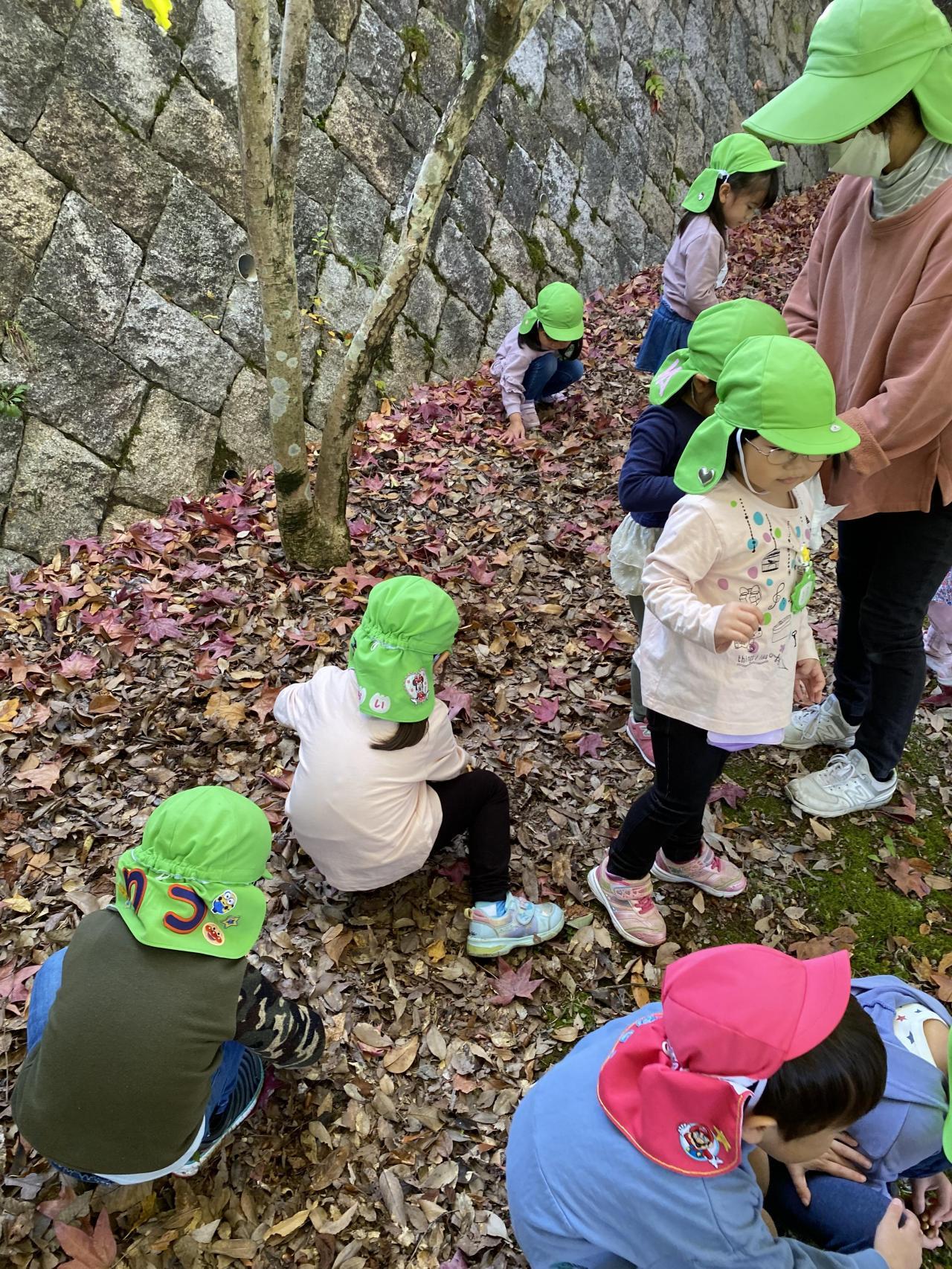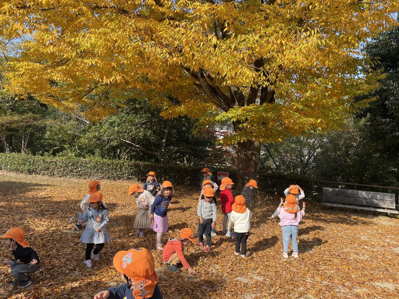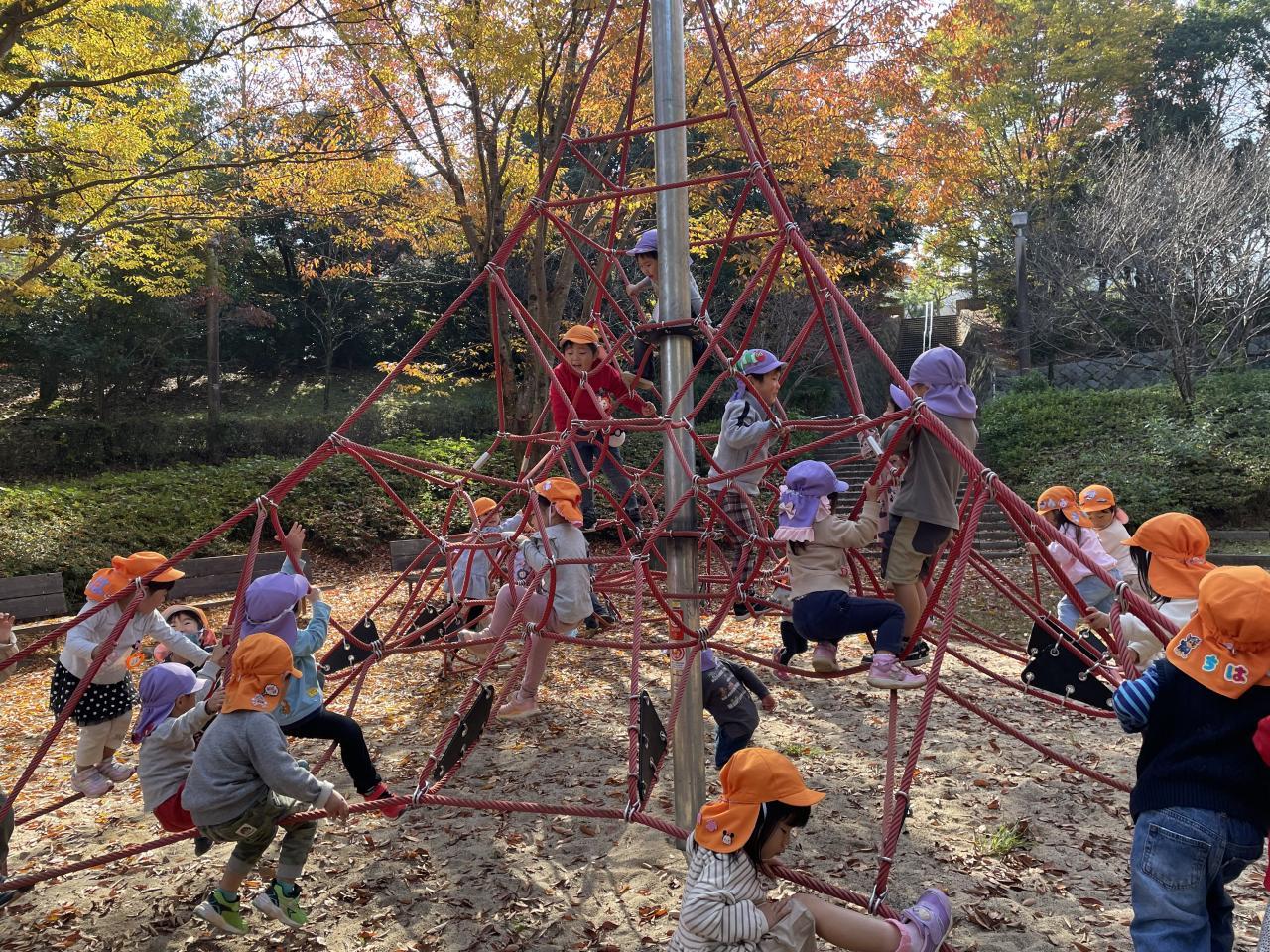 北ひばりが丘公園では、紙皿製作に使うどんぐりや松ぼっくり、木の枝、もみじなどの葉っぱを拾い、その後は遊具で元気いっぱいに遊びました🌈✨「先生!大きなどんぐりを見つけたよ!」、「こっち来てー!こんなに高いところまで登れたよ!」とずっとはしゃいでいました😆帰り道は「綺麗だね〜✨」と、紅葉を楽しみながら幼稚園に戻りました🍁