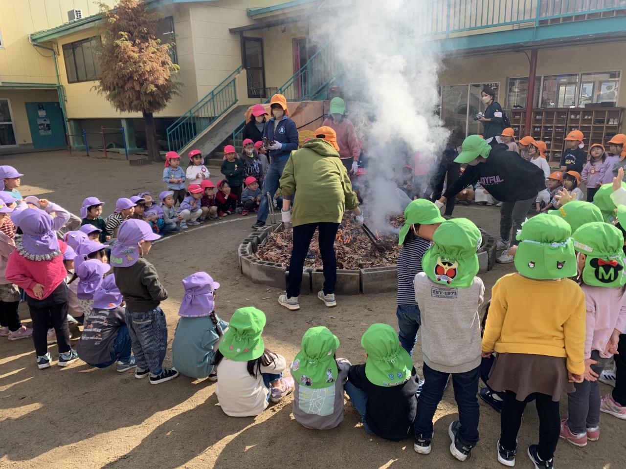 炉のまわりに集まり、いよいよ焼き芋大会のスタートです🤩