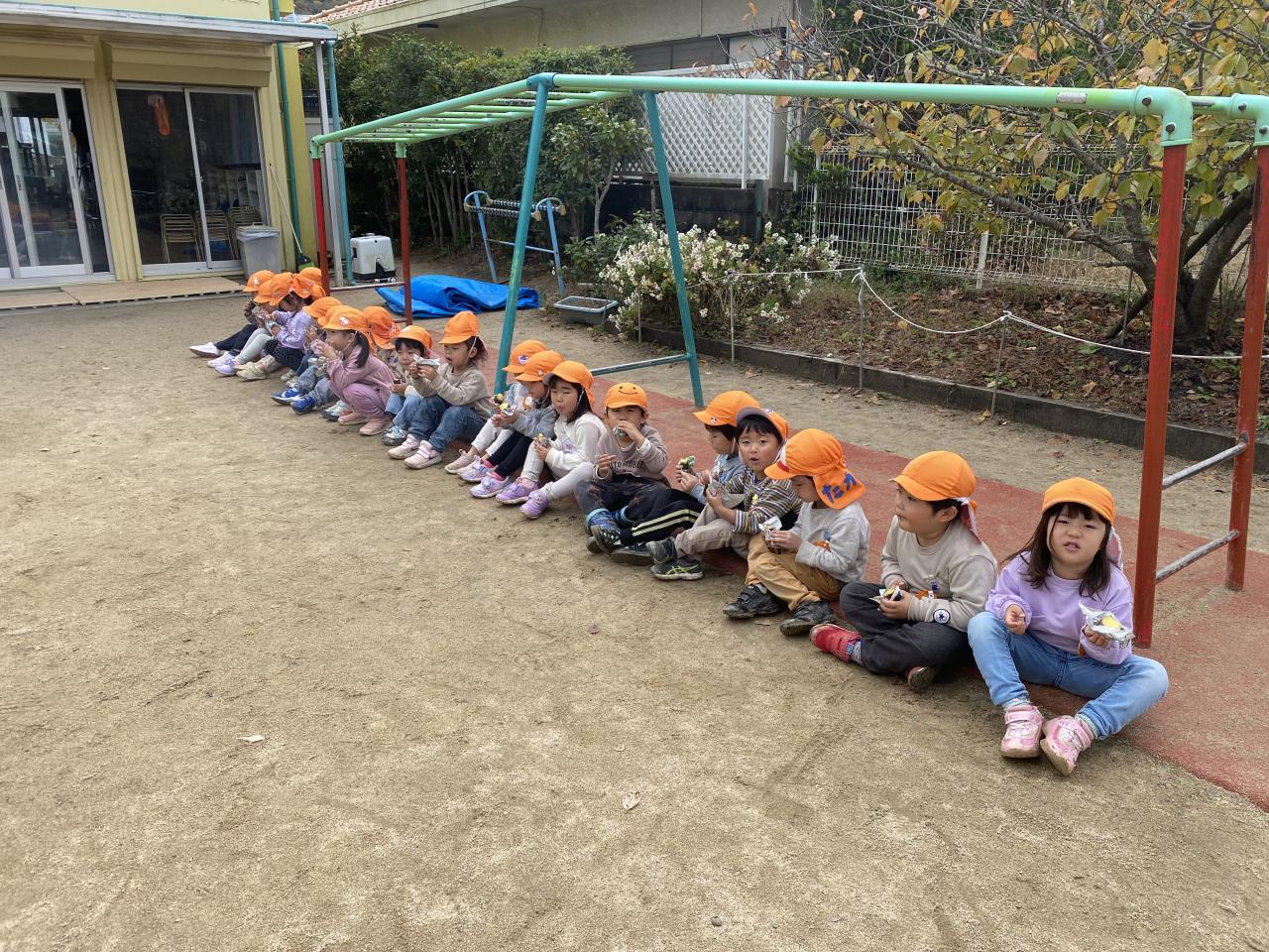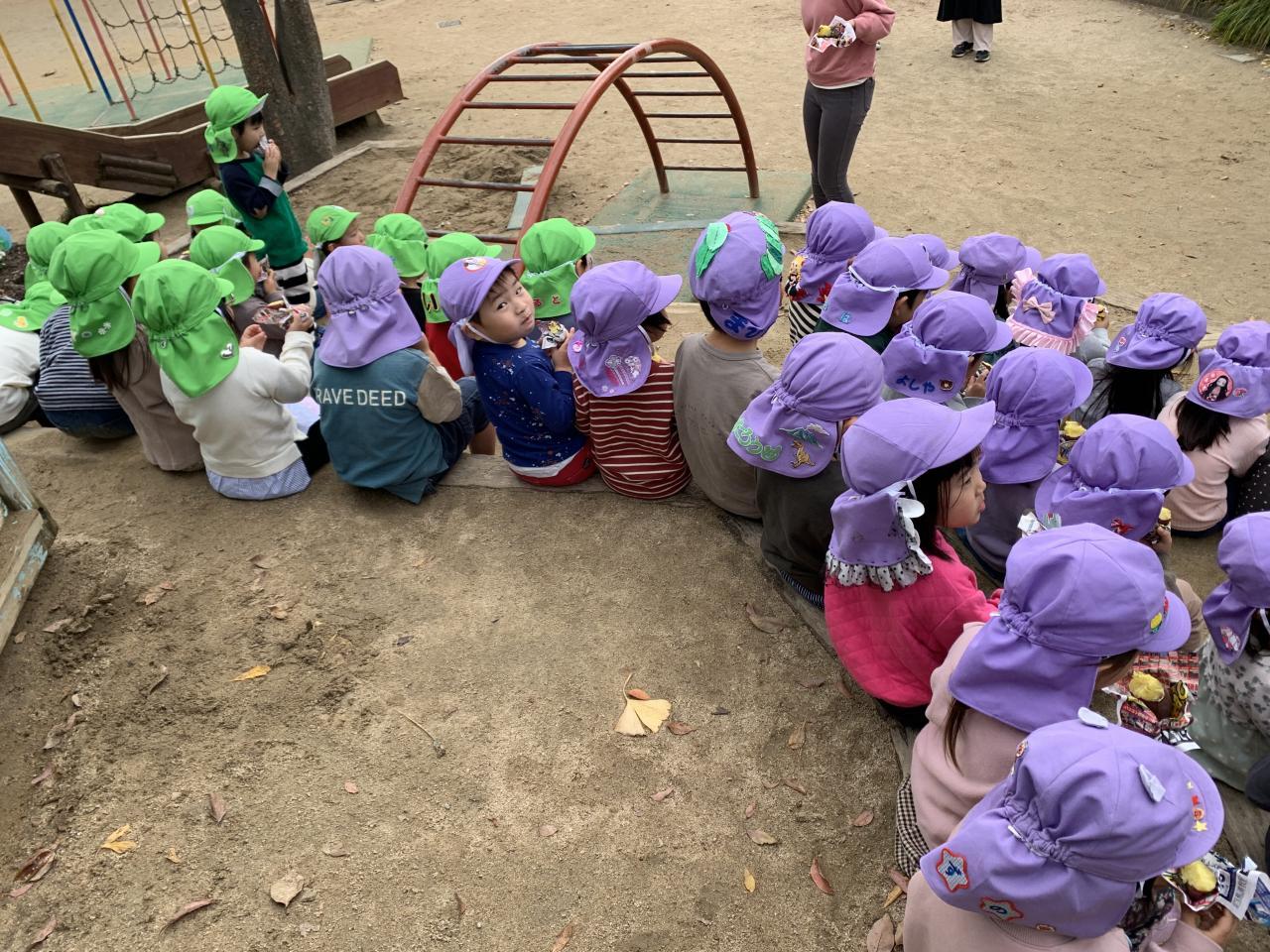 園庭に座り、「あったかいね!」「甘くておいしね!」と話しながら焼き芋を美味しくいただきました😁