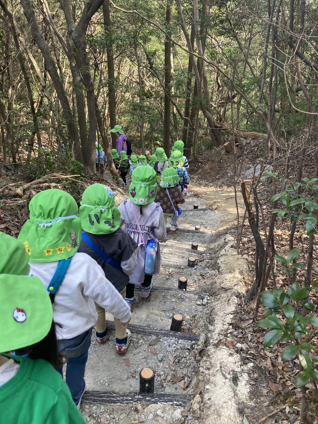 山に入ると「この道覚えてる!」「まつぼっくりが落ちてたよ!」とお友達と話しながら楽しそうに歩いていました🌟途中、こけてしまう事もありましたが泣かずに立ち上がったり、「大丈夫!?」と友達同士で声を掛け合ったりする姿が見られ、子ども達の成長を感じました😊
