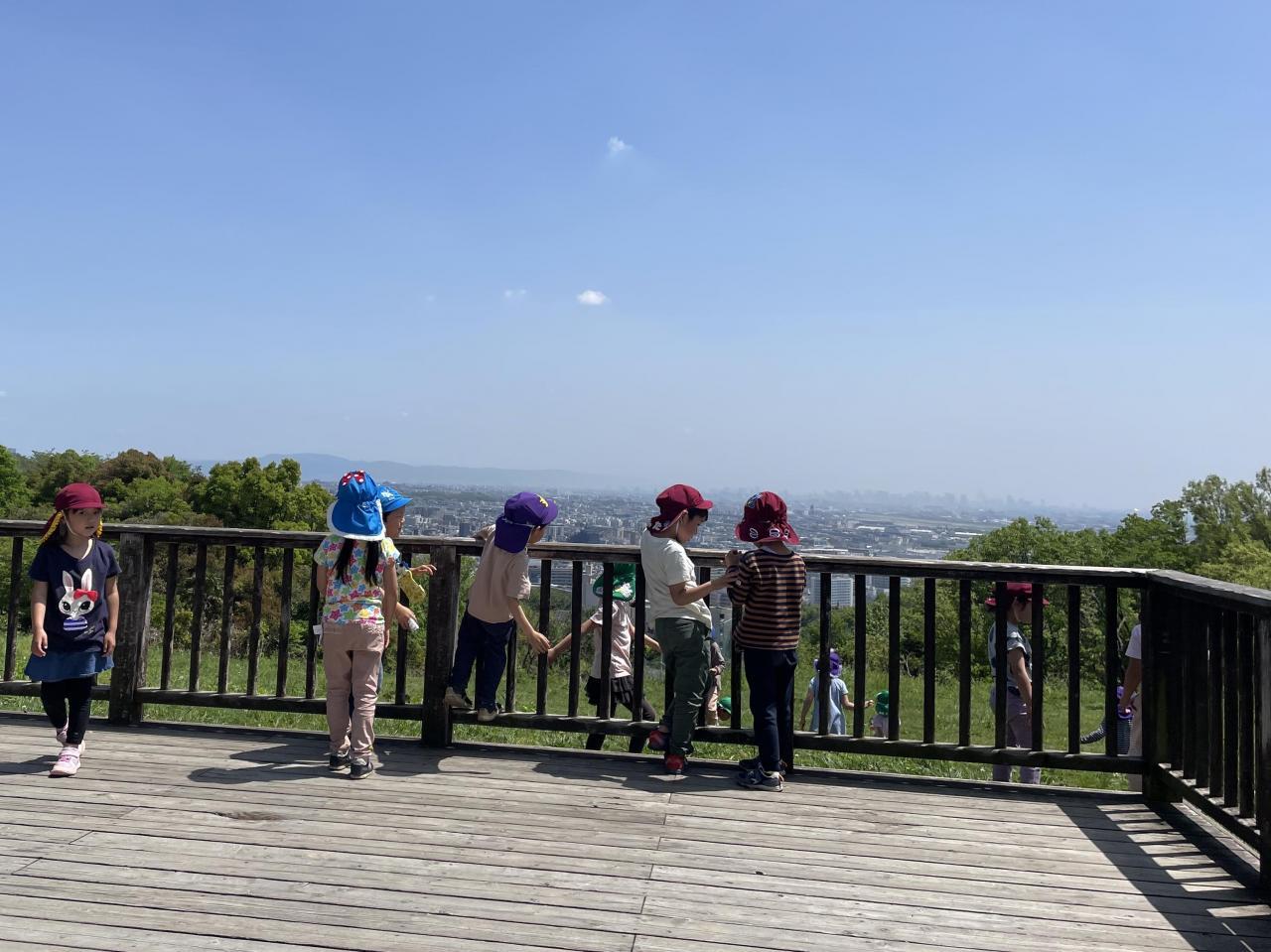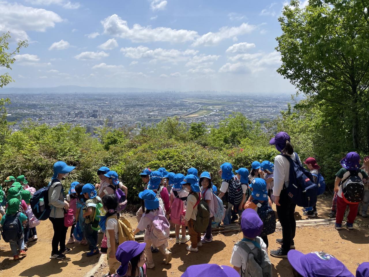 しっかり足を上げて、友達同士で励まし合いながら、約1時間半の道のりを一生懸命歩きました🙆山頂に着くと、綺麗な景色が待っていました✨飛行機が飛ぶ所を見ることができ、子ども達は大興奮✈