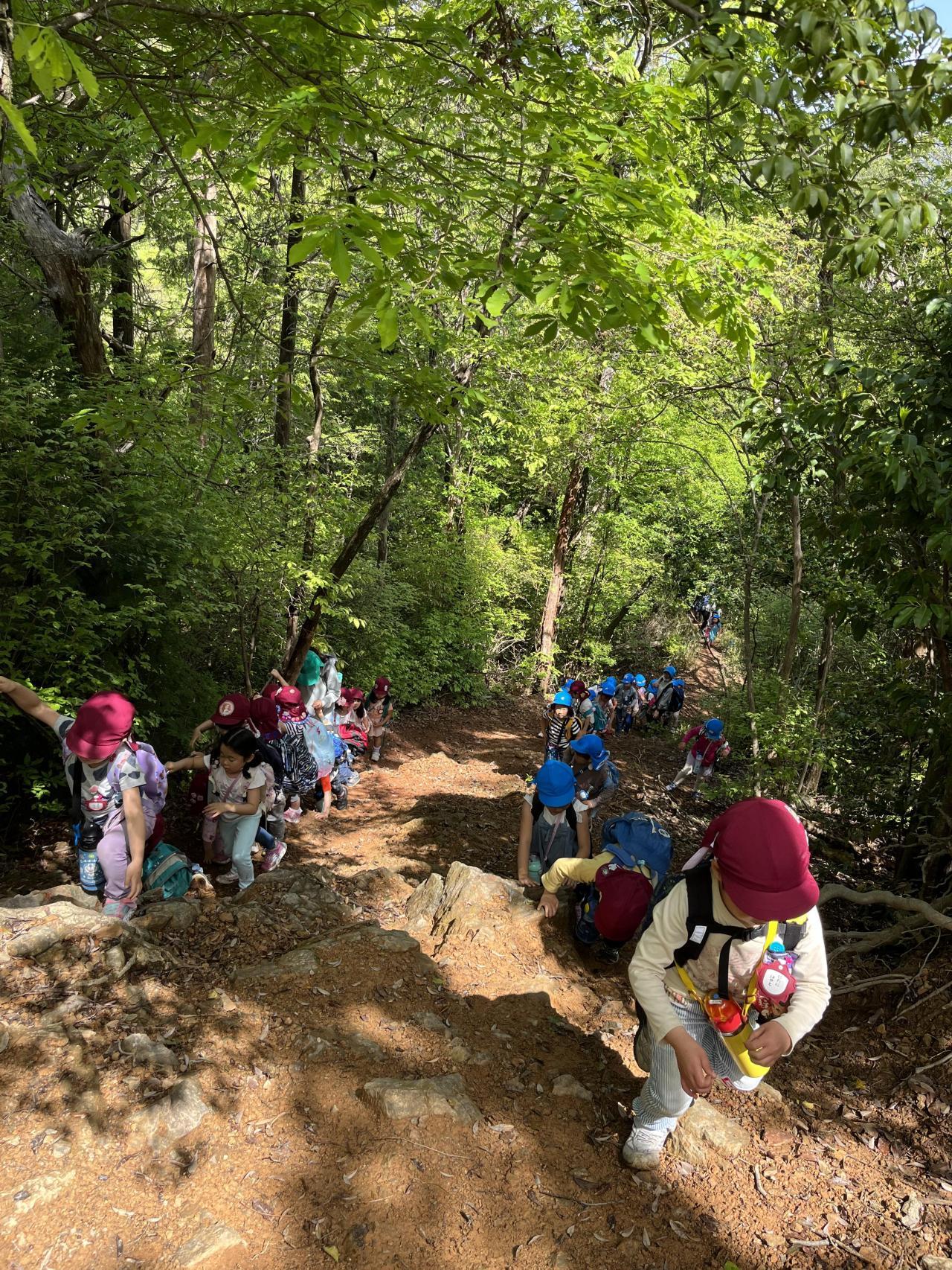 4月25日、年長組になって初めての山歩きに行ってきました❗パワー全開、やる気いっぱいの子ども達は、ナースリー・年中では通らなかった崖や山道を通って山頂まで向かいます💪