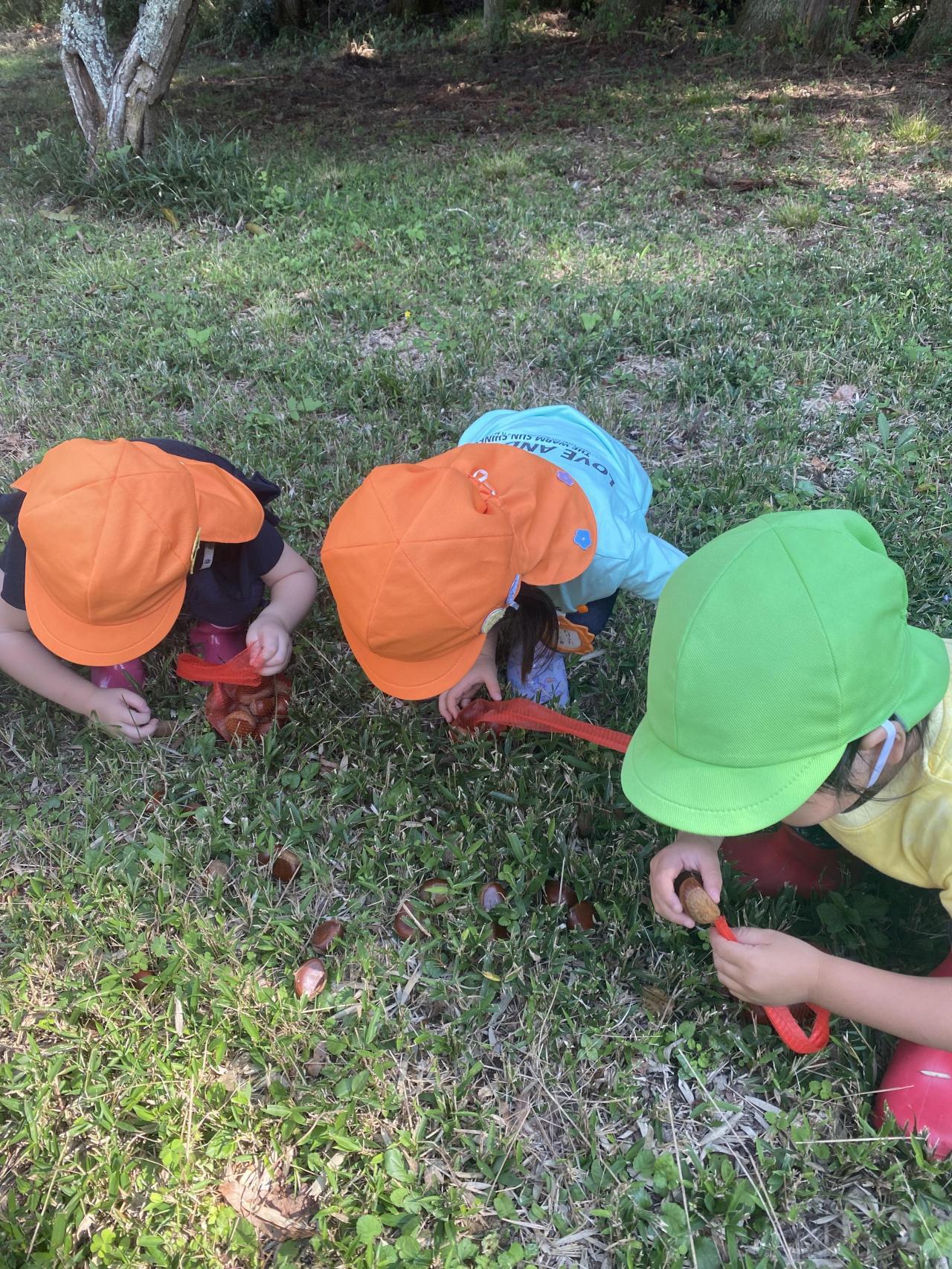 到着するとお約束を聞いて網袋をもらい、栗拾いのスタート🤩「大きい栗を見つけたよ!」「お家で栗ご飯を作ってもらうんだ!」と夢中で栗を拾っていました☺️
