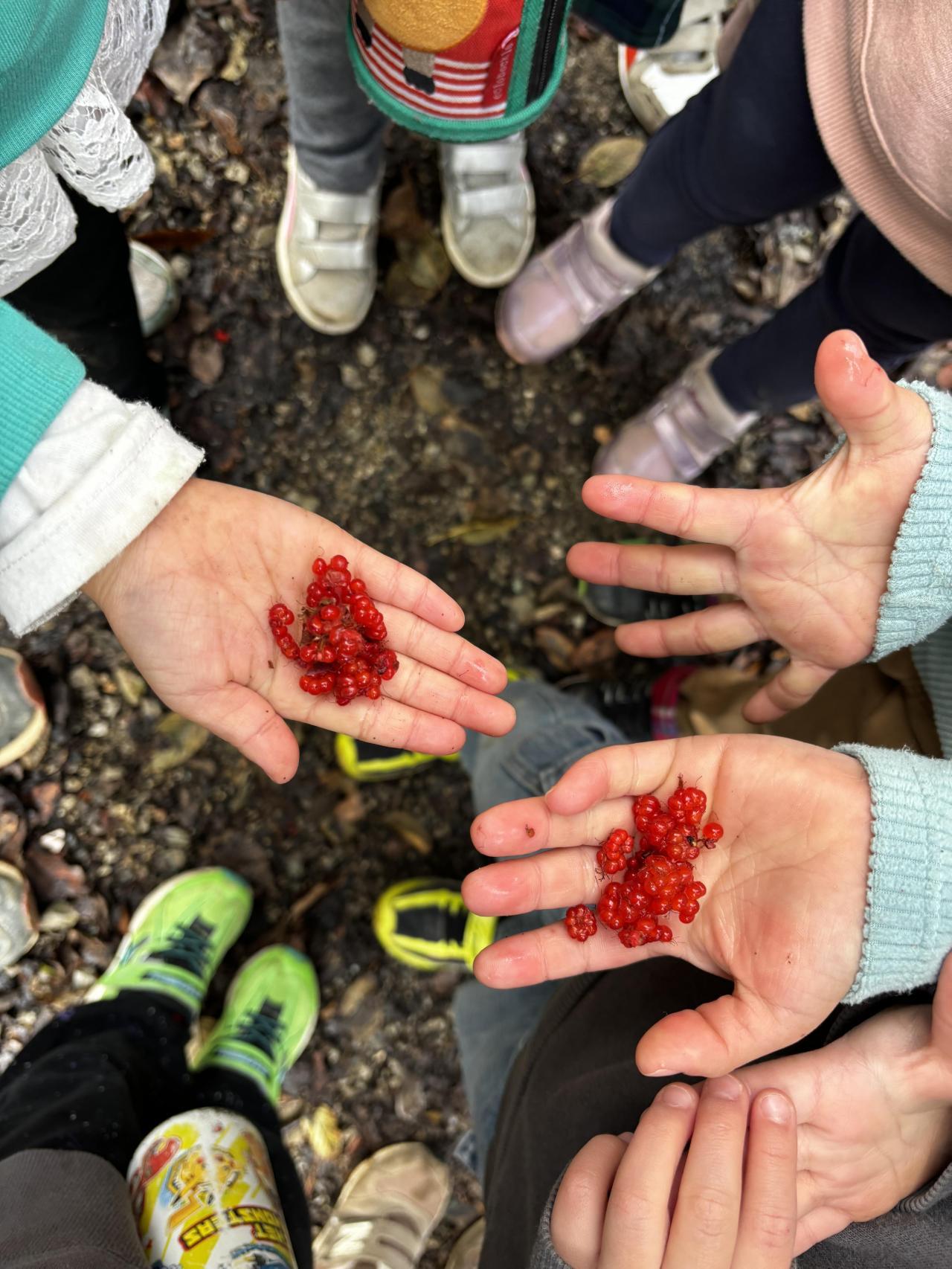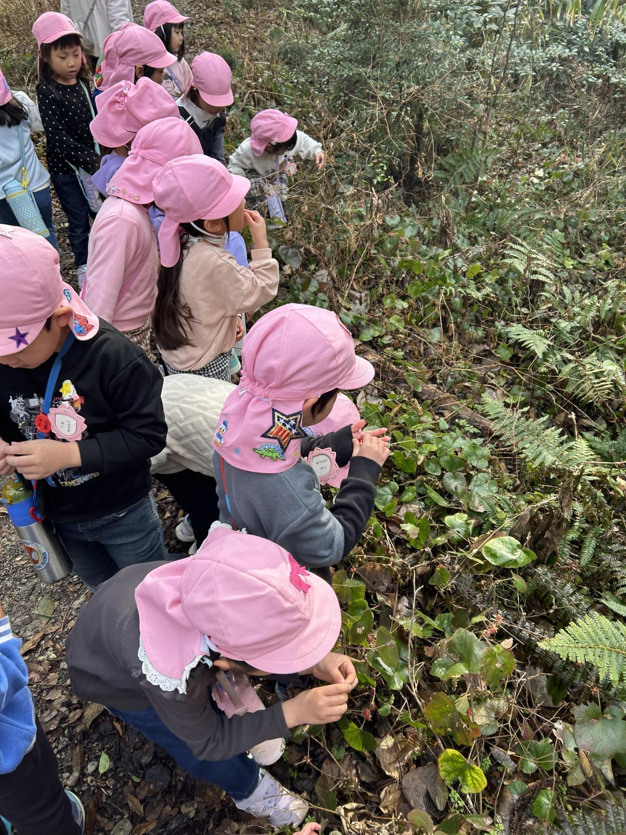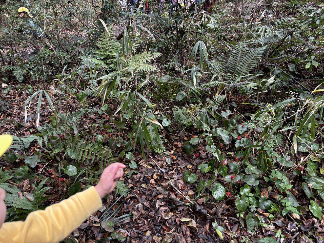 きずきの森に行くまでの道で、冬いちごが沢山なっていました🍓「すっぱいけど美味しい!」「こっちにいっぱいあるよ!」「まだ1つも見つけてないの?これあげる!」と友達同士で協力して探したり、嬉しそうに食べたりしていました😊その後はきずきの森でゆっくりと遊んできました!