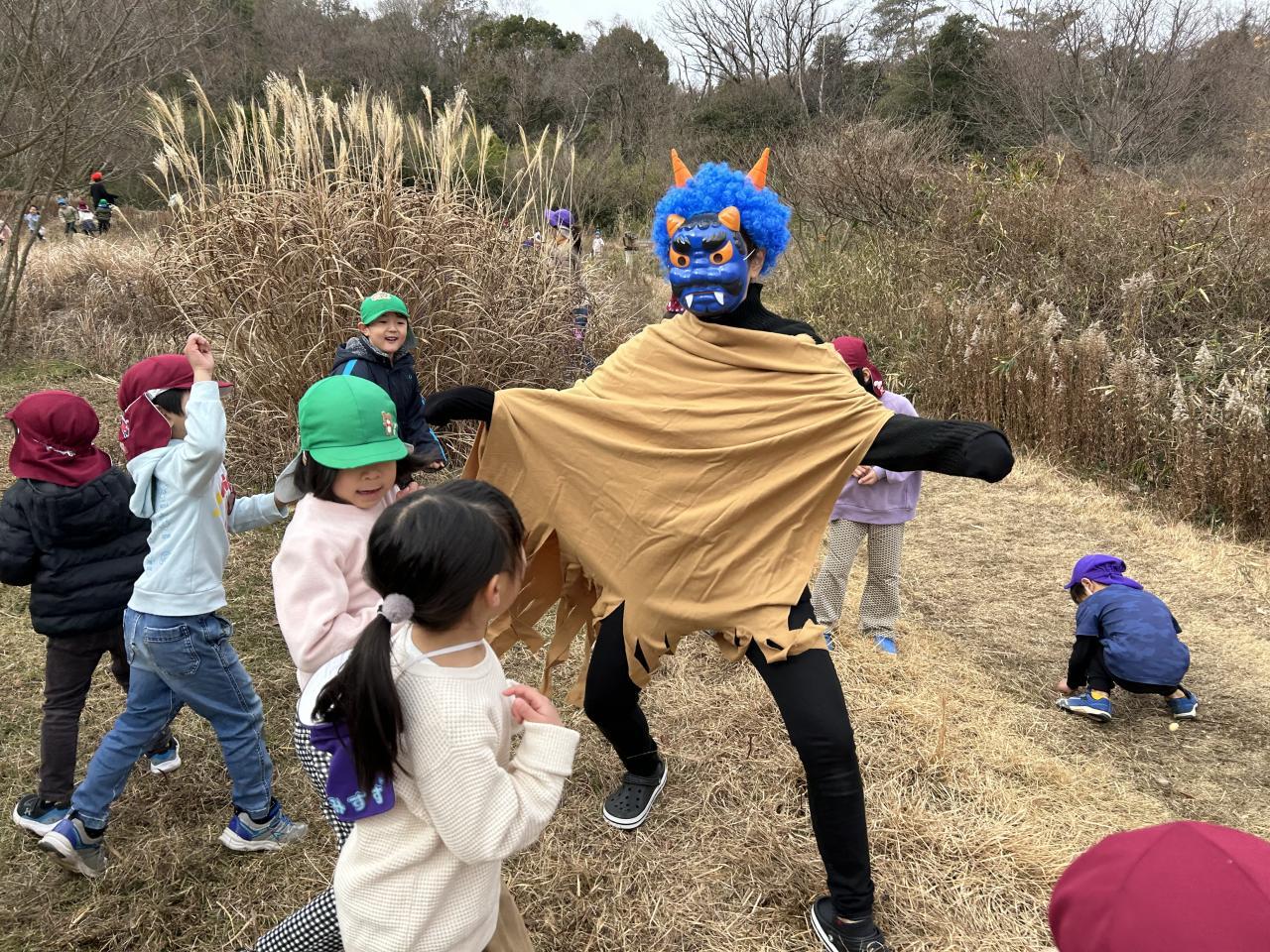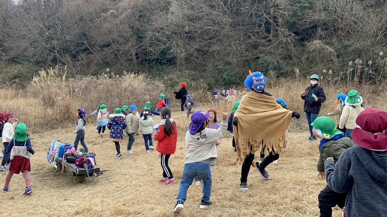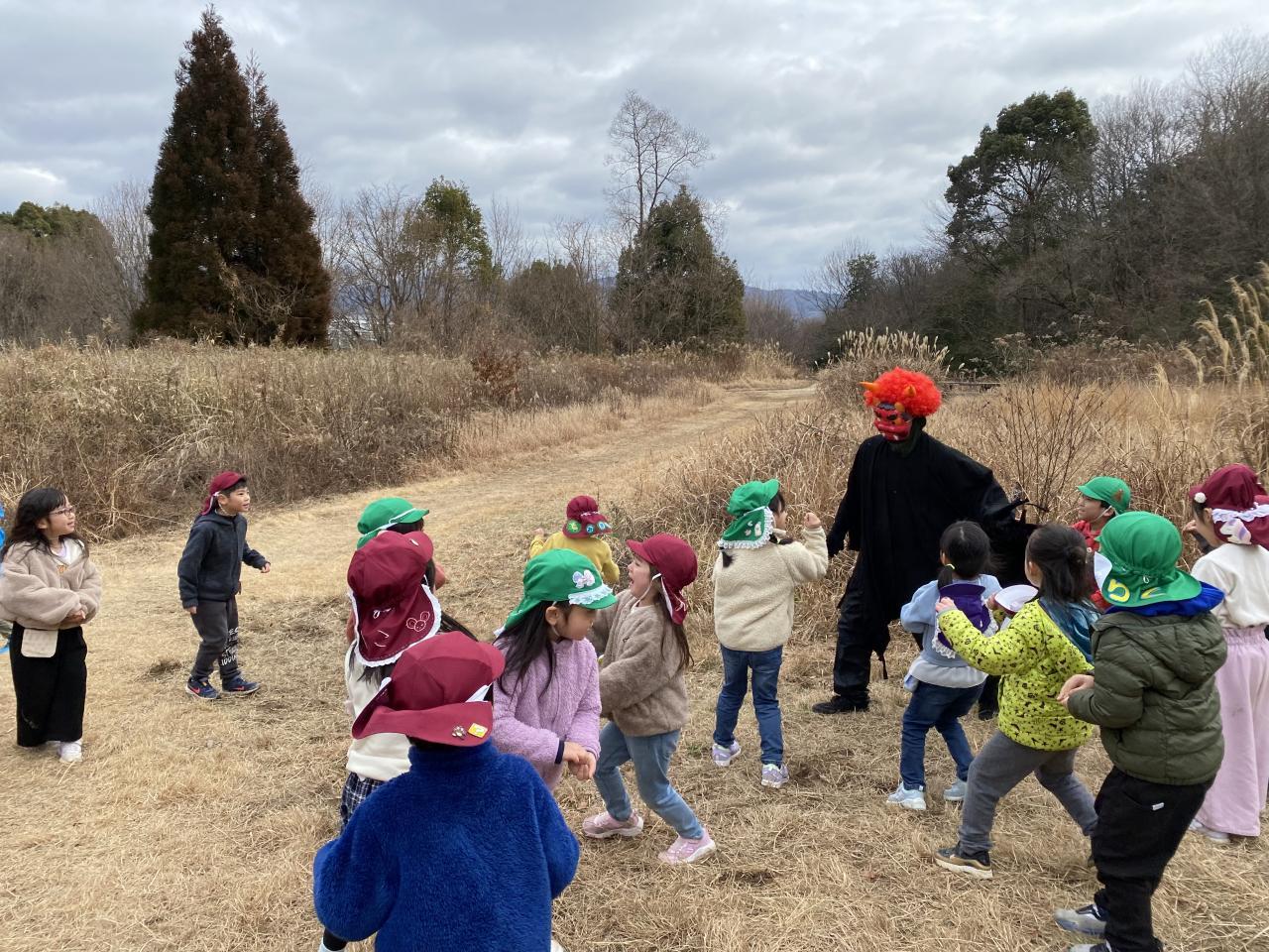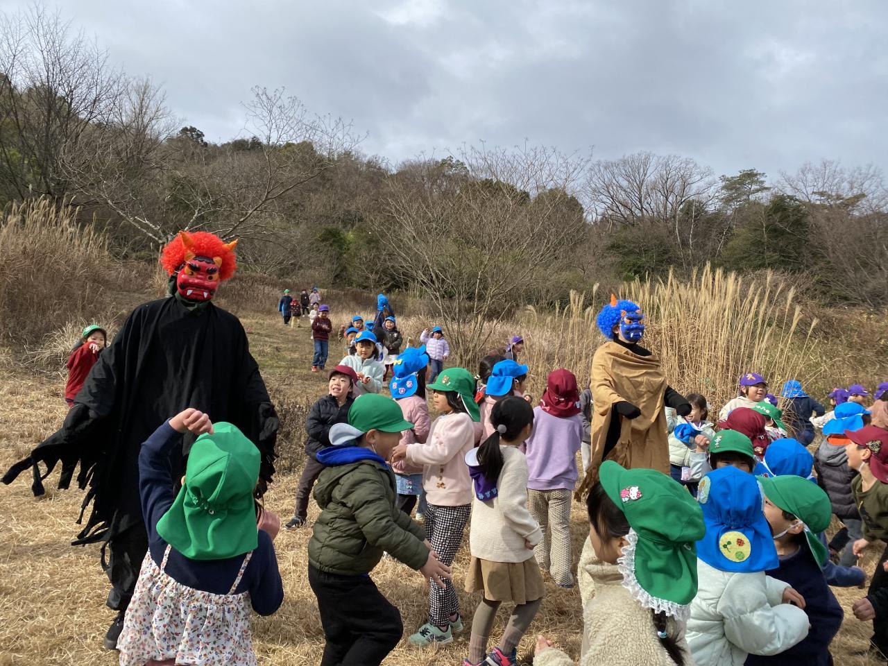 節分の話や絵本を見た後、「鬼は外!福は内!」と豆をまいていると、、、山から赤鬼と青鬼が登場👹❗️