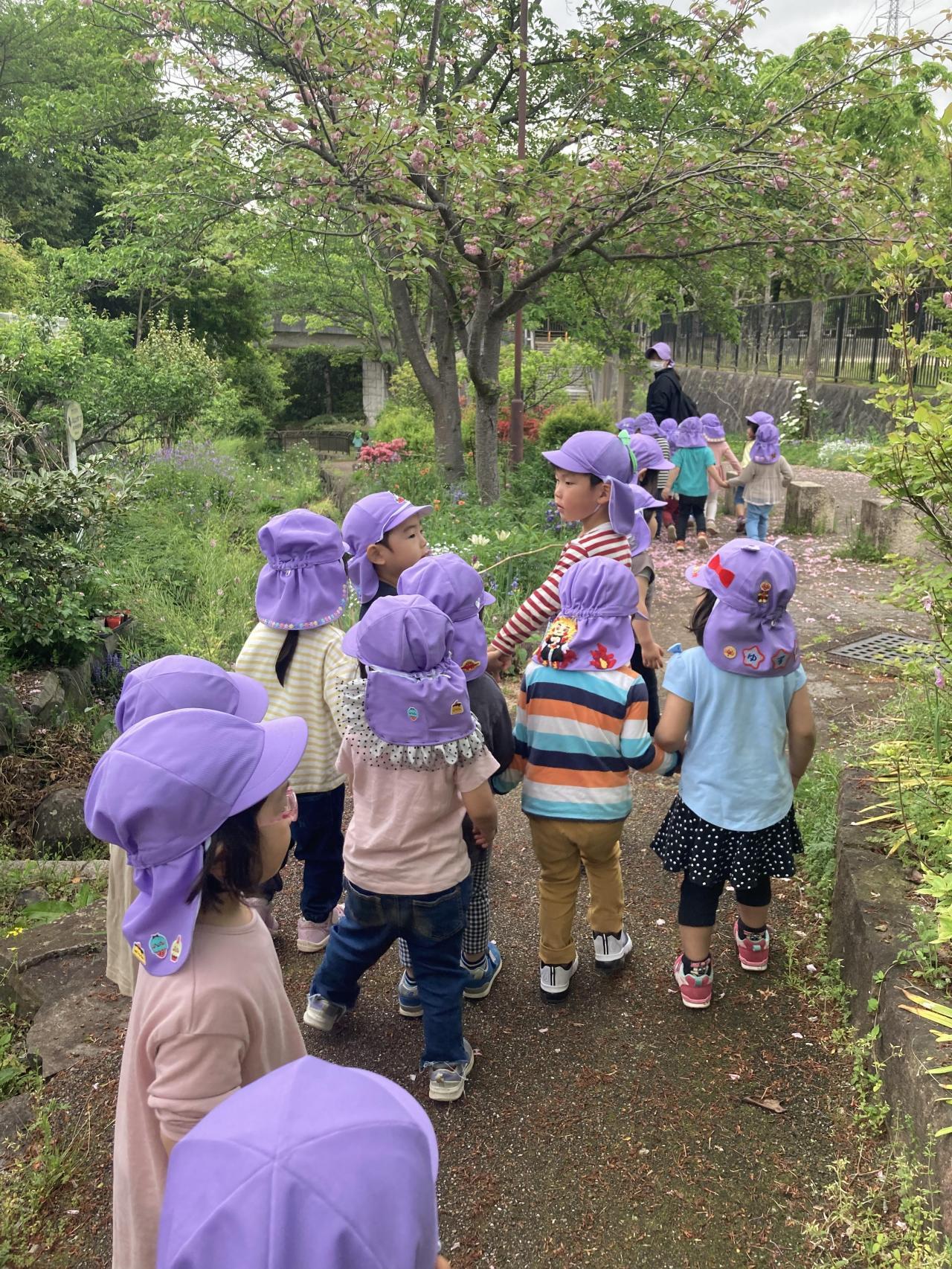 道に咲いている花や虫を見て、「帽子と一緒の色のお花が咲いてるよ!」「見て!白いちょうちょうが飛んでいるよ!」などたくさんのものに興味津々で目を輝かせていました🔎🌷🦋