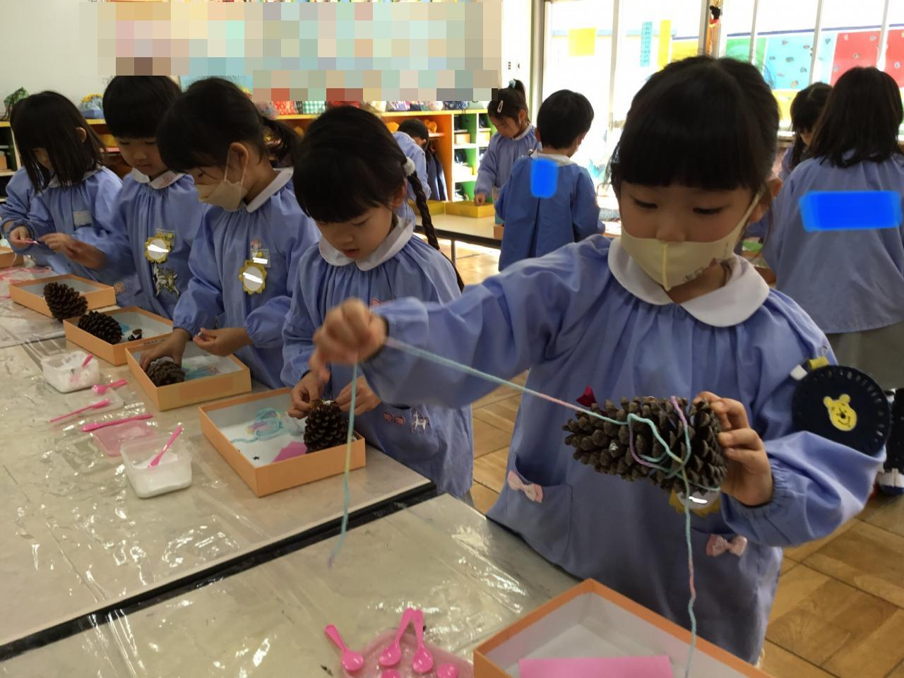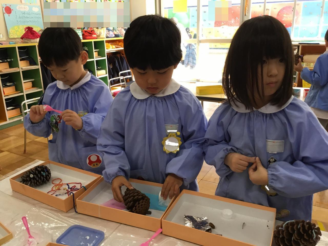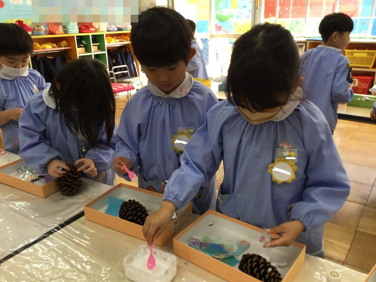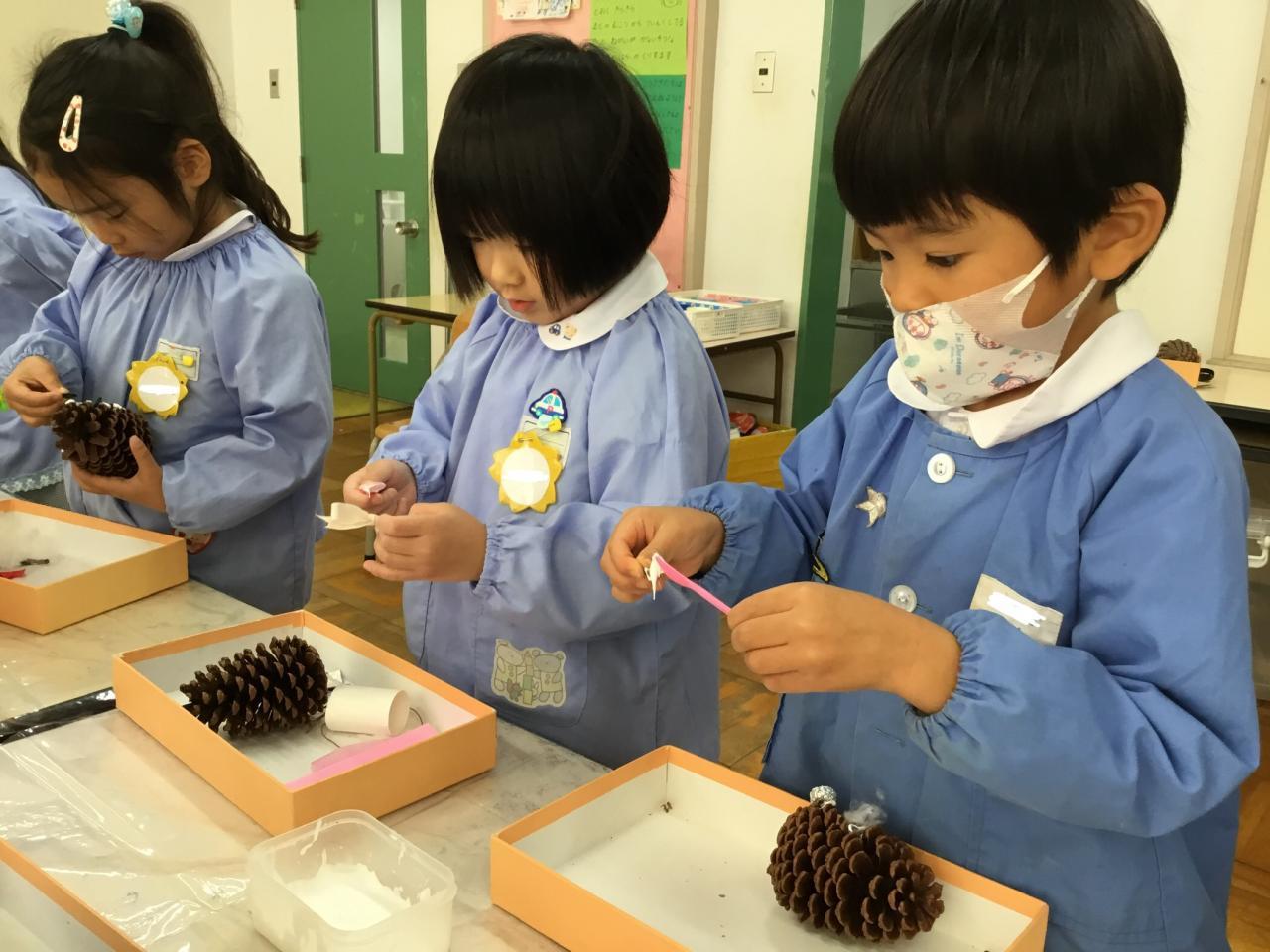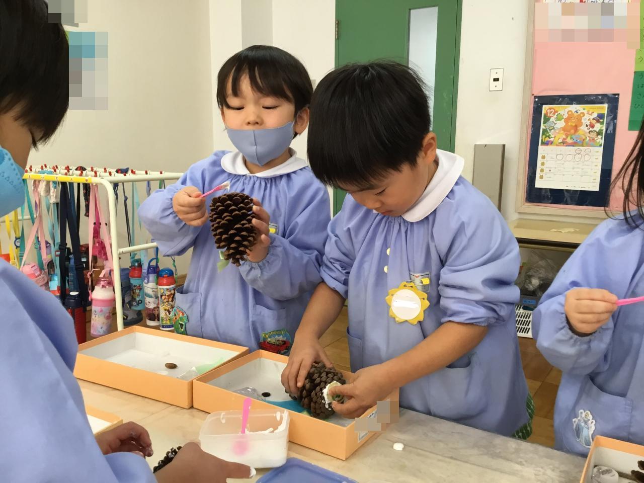 もうすぐ『クリスマス』ということで、みんなで松ぼっくりでオリジナルのツリーを作りました☆大きな松ぼっくりに驚いていた子どもたち。どんなツリーが出来上がるかな?